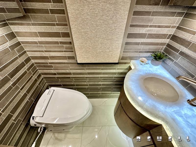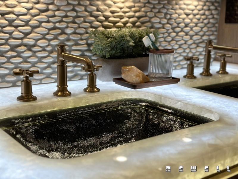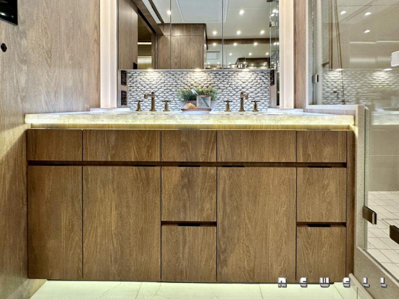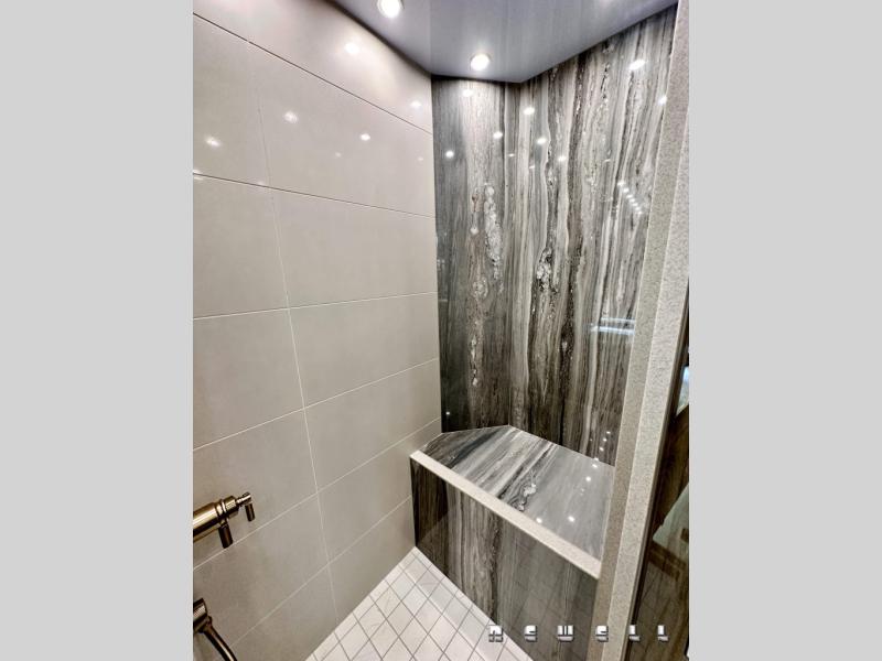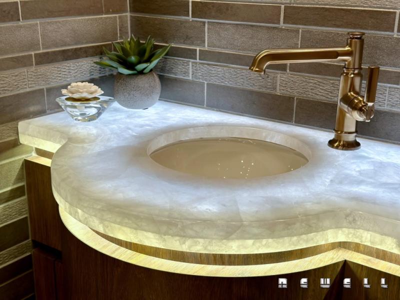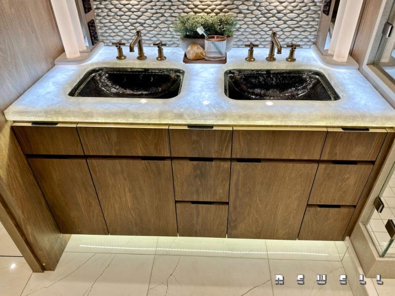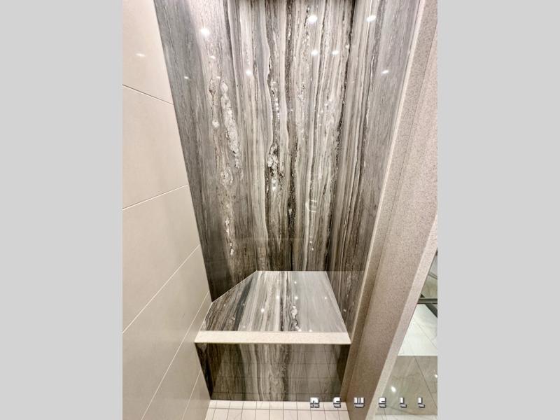 Super enlarged rear master bathWhite underlit quartz countertops in master bathroom