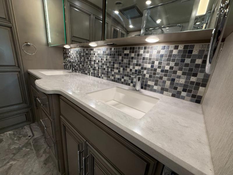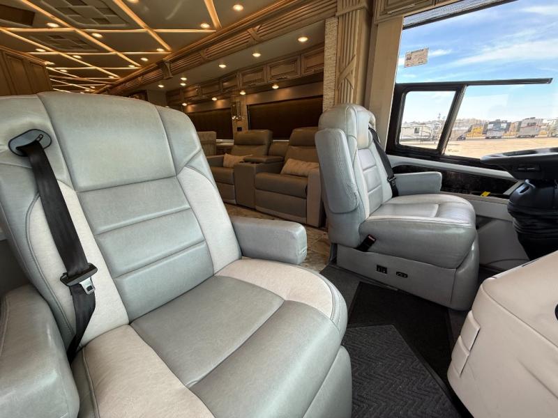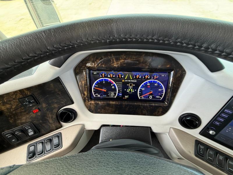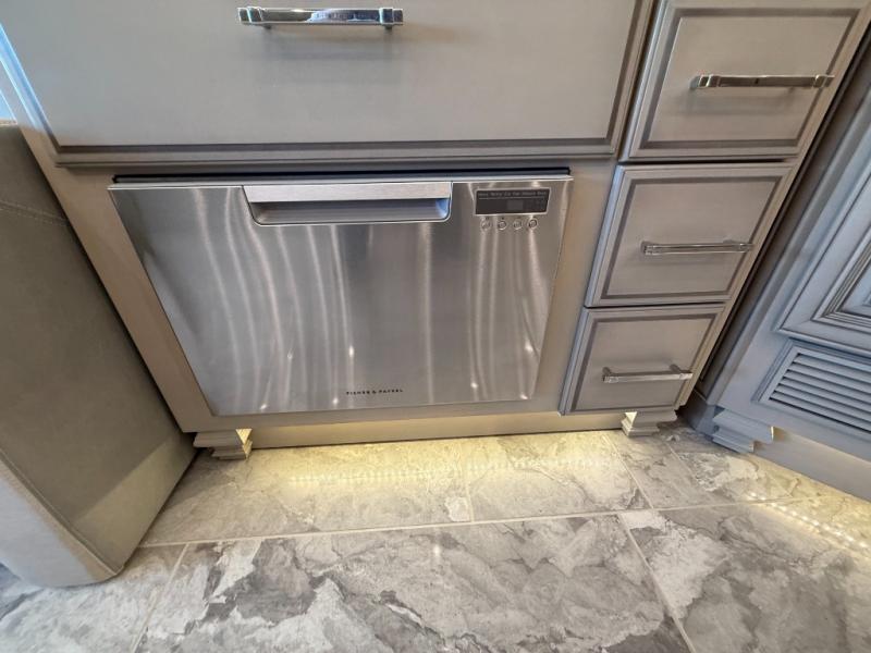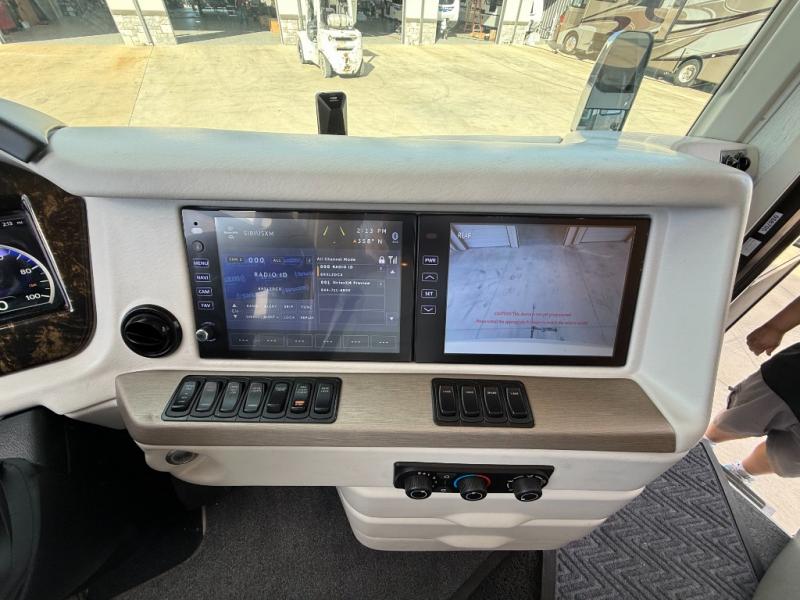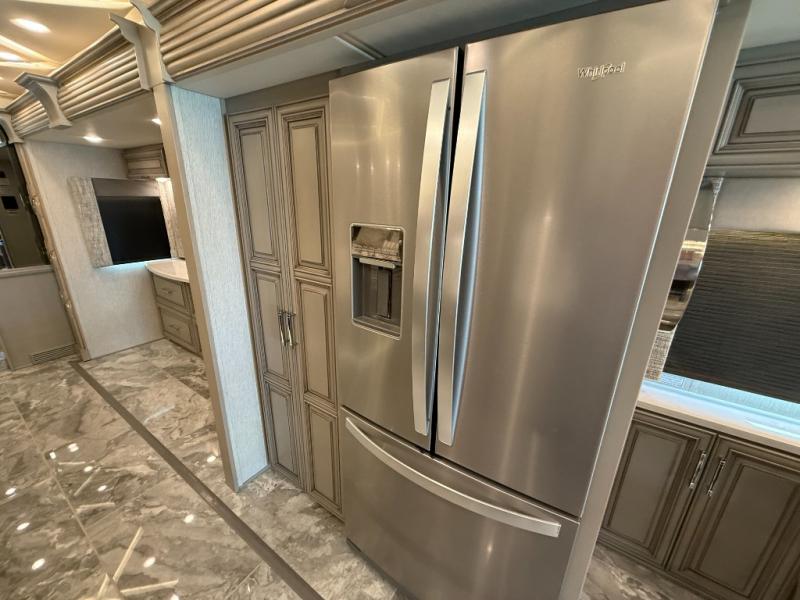 You won't want to travel any other way once you step inside this motorhome! The master suite has a king bed slide for a good night's rest across from a dresser with a Samsung LED TV and a safe for your valuables. Attached to the bedroom is your very own full rear bathroom which has a 45" x 36" shower with a seat, a dual sink vanity for two to get ready at once, a wardrobe with adjustable shelves on one side and a Splendide stacked washer and dryer on the other, and an emergency exit door behind the toilet. The chef will have everything they need to prepare delicious home cooked meals including a stainless steel 30" convection microwave with air fryer feature and a Whirlpool 19.7 cu. ft. refrigerator to keep the perishables fresh, plus the half bathroom is by the kitchen for quick bathroom breaks while cooking. Enjoy your meals at the hide-a-leaf dinette and relax on either the 87" hide-a-bed sofa or the 68" jackknife sofa while watching your favorite movies on the Samsung LED TV on power lift!