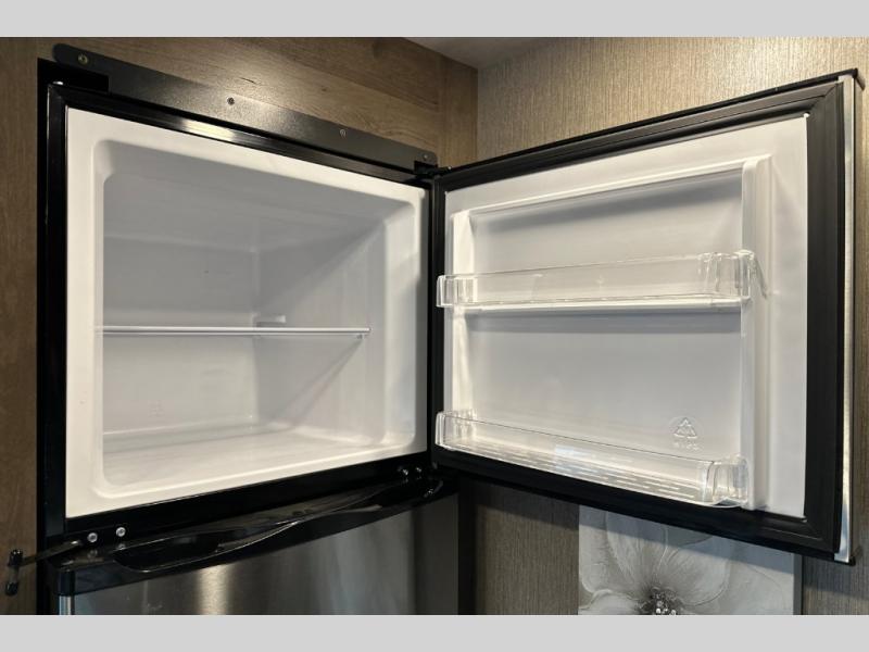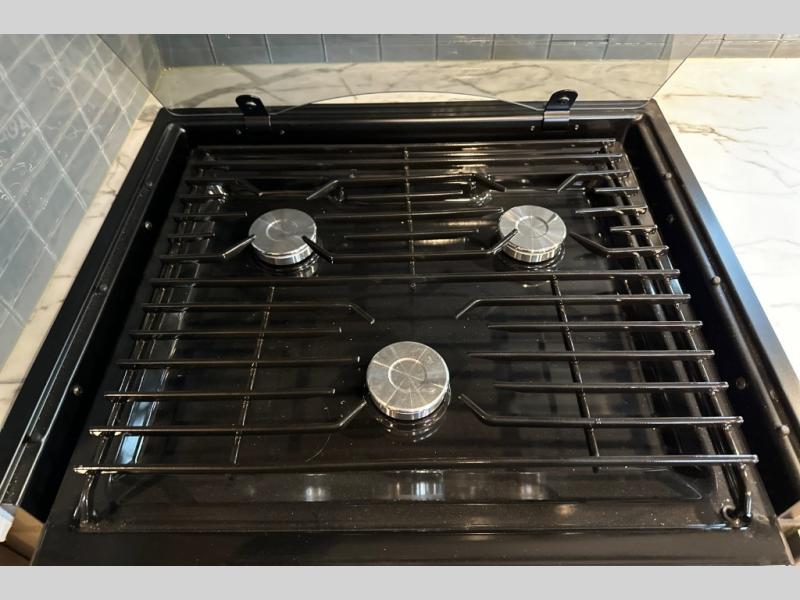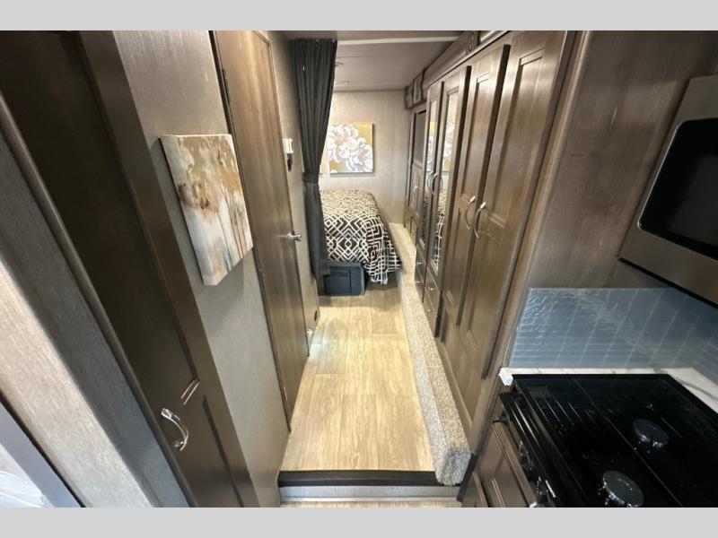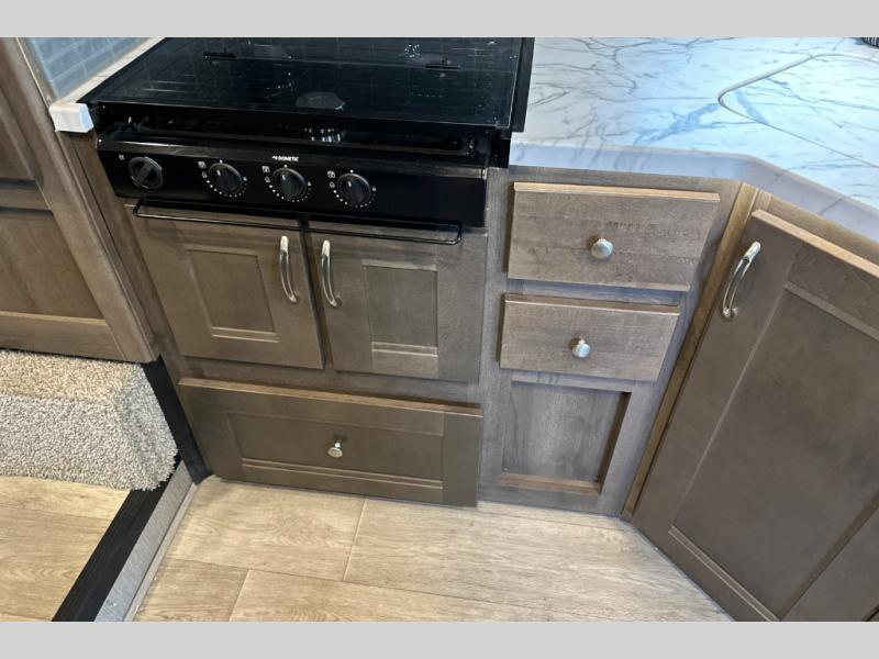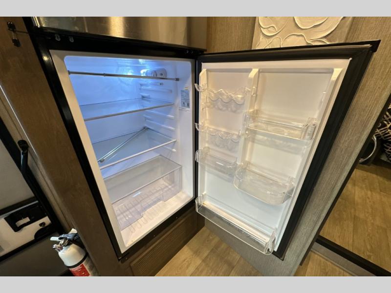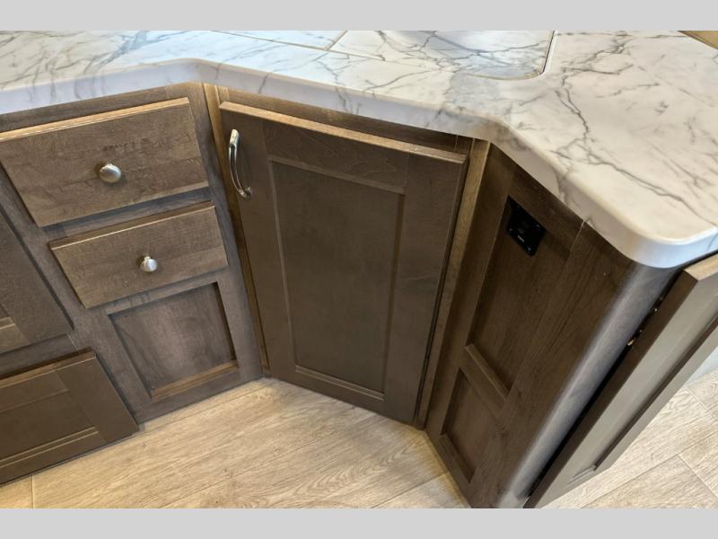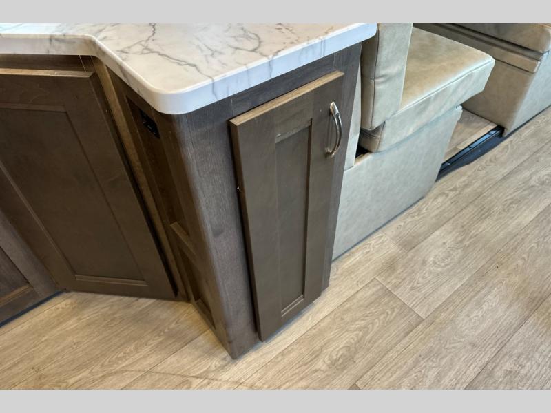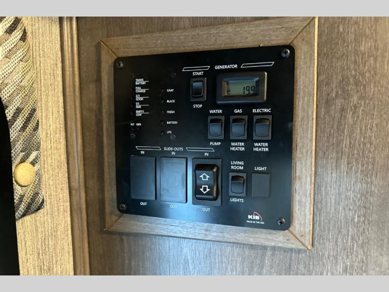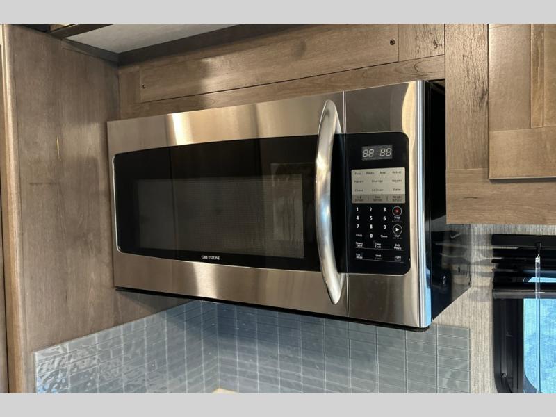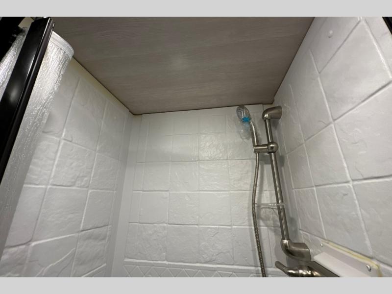 You won't want to travel any other way once you step inside this motorhome! The rear private bedroom has a bed with a deluxe innerspring mattress across from a TV, a dresser, and a closet to keep your clothes looking nice. With two linen closets in the full bathroom, you will be able to keep your towels and toiletries out of the way. You won't have to eat fast food either thanks to the three burner stovetop, 12V residential refrigerator, and over the range microwave for popcorn on movie night. The bunk over cab and booth dinette offer extra sleeping spaces for more to join in on the adventure too. There is also an outside shower to rinse your feet off before tracking mud throughout the unit!
