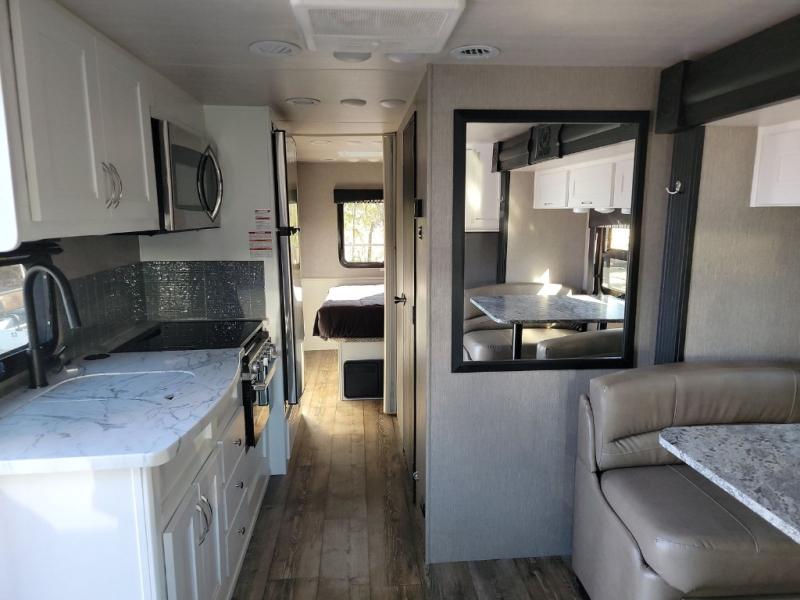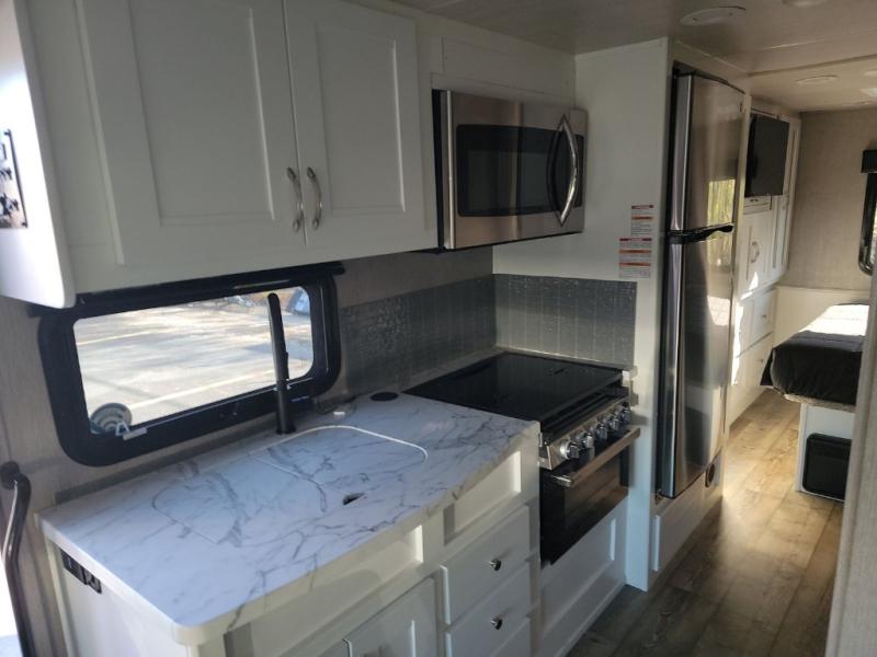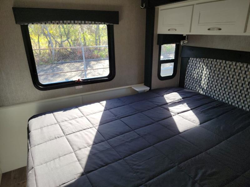 Whether you travel with your family on long vacations or your spouse for months at a time, this spacious Class B+ offers two slide outs giving you lots of floor space to enjoy at any destination. The cook will love having a residential refrigerator to carry lots of goodies especially when the family joins you, and there is storage found throughout in overhead cabinets for your dishes and such. The full bathroom is in between the main area and the rear bedroom and offers a shower with a flexible hose shower head, a skylight for more headroom in the shower, and a vinyl door, plus everything else needed to stay refreshed. The rear window in your bedroom will provide great views while you lay in your queen bed slide out! You will have a wardrobe to keep your clothing ready for shopping in town or venturing outdoors, and you might like to add the optional LED TV. You will also find a 4.0 KW generator, an LP quick disconnect, and a 7,500 lb. hitch if you decide to tow something.