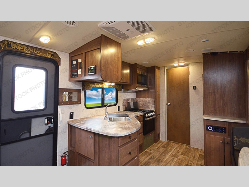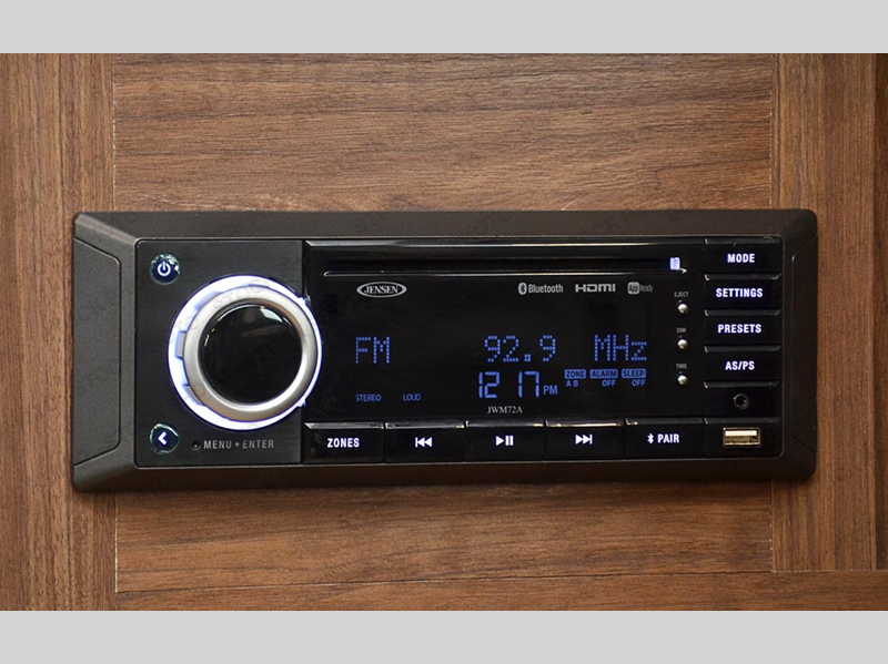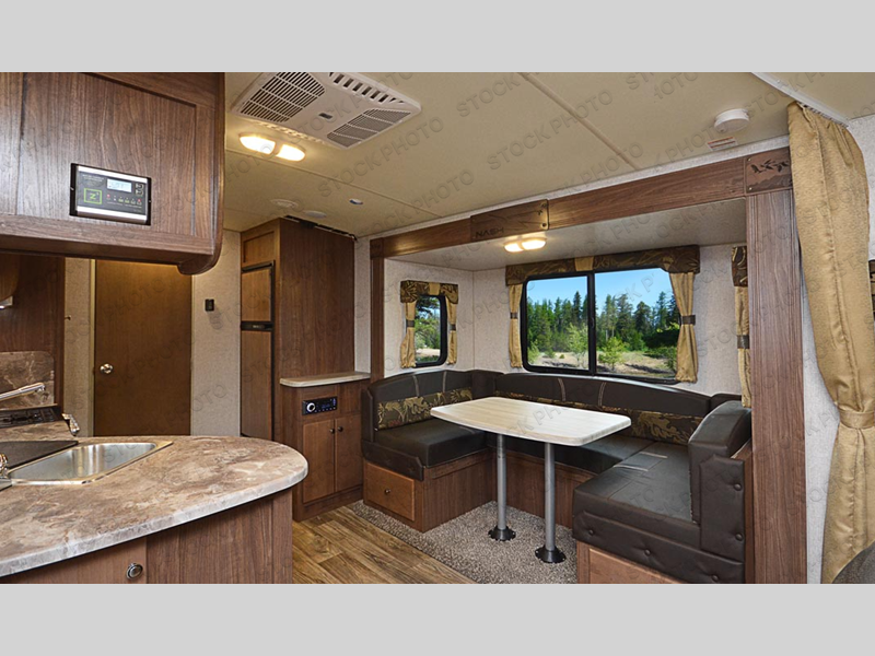 This is the perfect couple's trailer with space for an overnight guest or two on the U-shaped dinette slide. The kitchen also offers a pantry for dry goods and overhead storage for dishes and such as well as a 7 cu. ft. refrigerator to store your cold items. Outside you will enjoy features like the Carefree Travl'R 12V awning to protect you from the sun while you watch the kids play and the outdoor shower for them to rinse off before going inside.