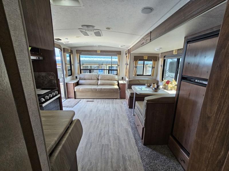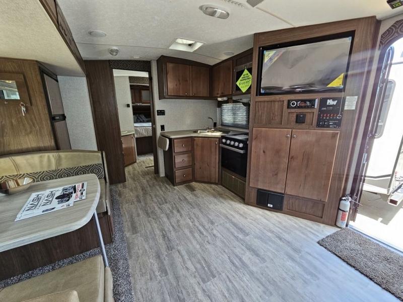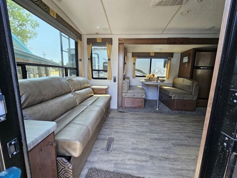 You will enjoy camping in any season with this Nash travel trailer that features a single slide for added interior space. A cathedral ceiling will make it feel even larger when spending time inside. The jackknife sofa adds extra sleeping for family members and/or friends, plus the dinette in the slide can easily convert to a 40" x 74" sleeping area for two children or an adult. The private front entry into the front bedroom makes it easy to access the full bath when needed from outside, and you will have all of the amenities you need to enjoy any camping trip no matter what time of year as the Nash features four seasons insulation which will keep you cool in the summer and warm in the colder temperatures.