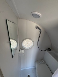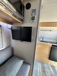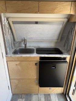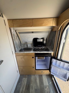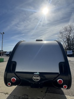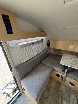 Glamping comes easy in this cute trailer for two! Once you've found a campground to park for the night, whip up a quick meal on the two burner cooktop and dine at the U-shaped dinette. Clean-up will be a breeze with the stainless steel deep-basin sink, and there is a 12V compressor refrigerator for leftovers. You will find a wall mounted pocket organizer, a wardrobe with table storage, plus exterior storage for the gray tank hose and spare tire. This model also includes a portable Bose Bluetooth speaker so you can listen to your favorite tunes from your device, and the multi-speed roof fan will provide fresh air as you relax with your loved ones.