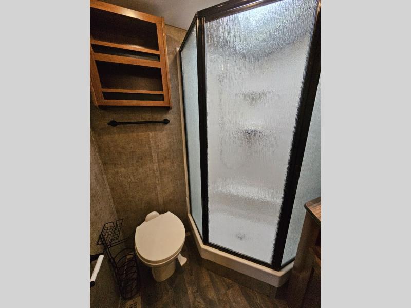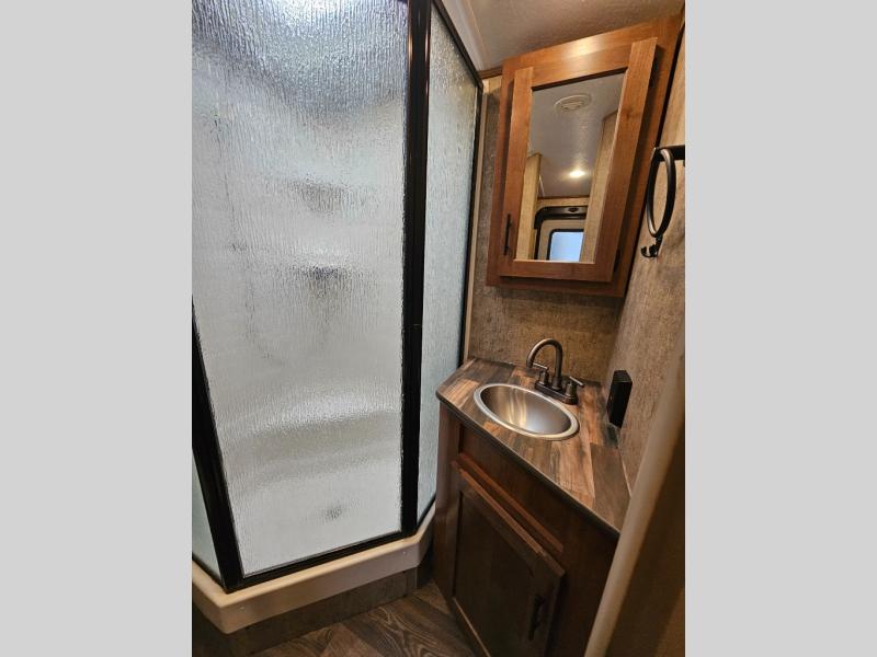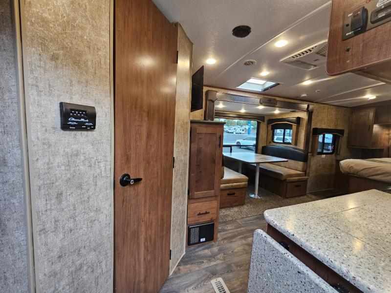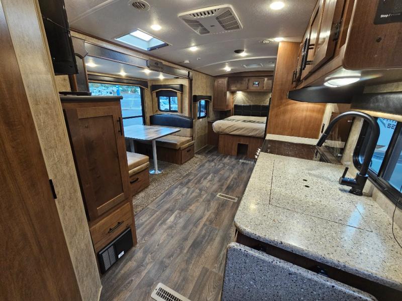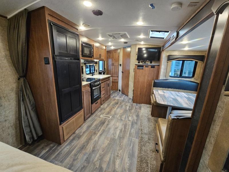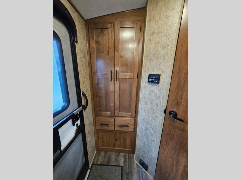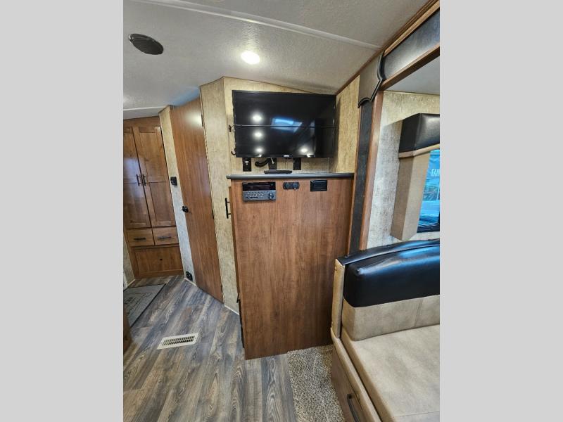 This is the perfect adventurist travel trailer with off-road and off-grid capability, plus the queen bed up front sleeps two and allows you to rest up after all the fun outdoors! You will find storage on each side as well as USB ports to keep your iPad and cell phones charged. The swing-out 32" TV can be viewed from pretty much anywhere giving you inside entertainment, and the slide out booth dinette offers dining and sleeping space plus more interior floor space to move about. You will love the natural lighting from the skylights and windows. The cook can make meals in the galley kitchen, and everyone will stay refreshed with the full bathroom in the rear corner next to the handy entry closet.