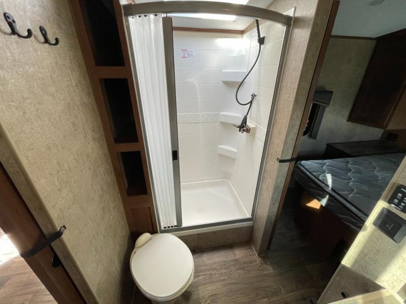 Pack your bags and escape the city life for weekend camping trips in this dual entry travel trailer. When you arrive at the campsite, take a hike to stretch your legs, then come back to prepare lunch on the three burner cooktop. You'll find plenty of counter space in the kitchen, plus an 8 cu. ft. refrigerator for cold drinks and perishables. The dual lounge chairs will have you feeling right at home, or you can choose the optional sofa with built-in recliners, or the optional sleeper sofa if you need more sleeping space. This model includes a walk-through bath that is both spacious and convenient since it leads to to the front master bedroom. You can't beat a queen bed, dual bedroom wardrobes, and your own exterior entry door!