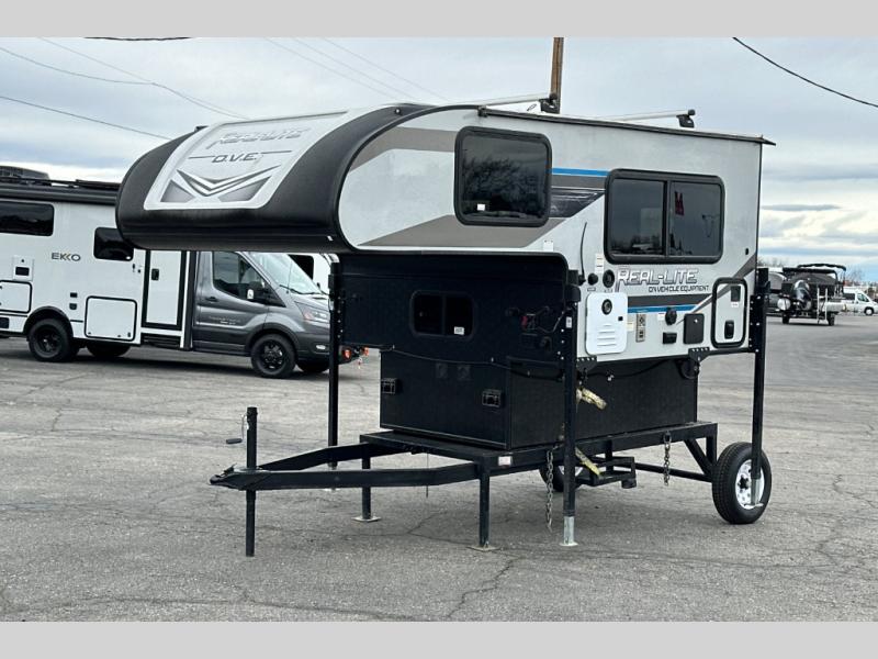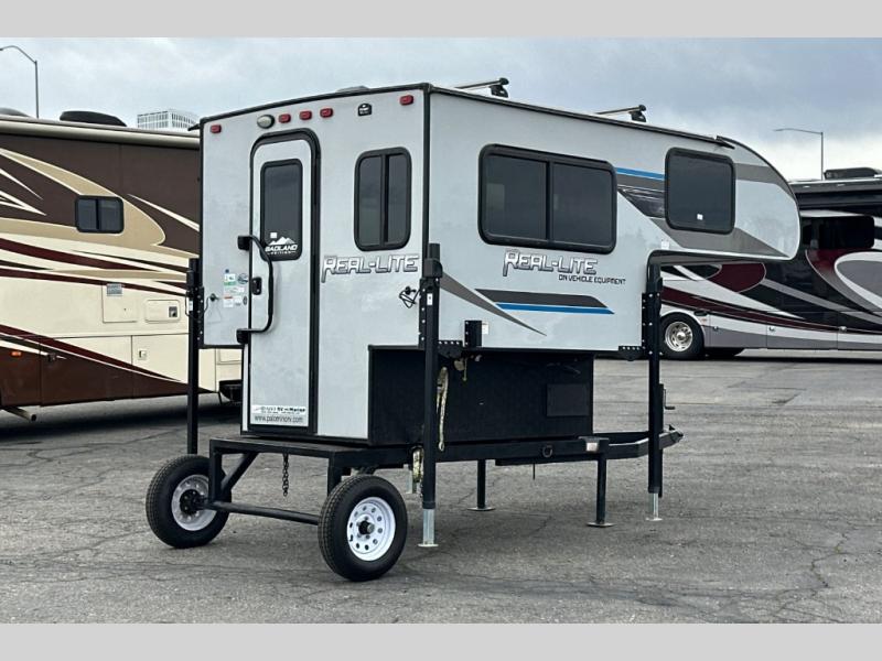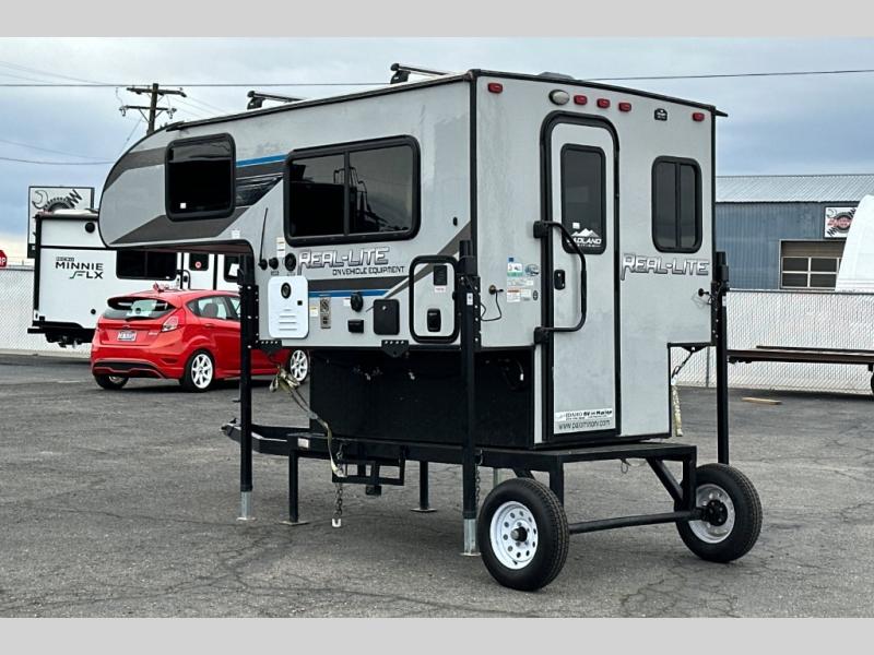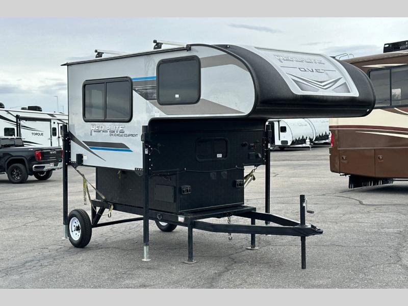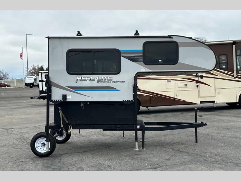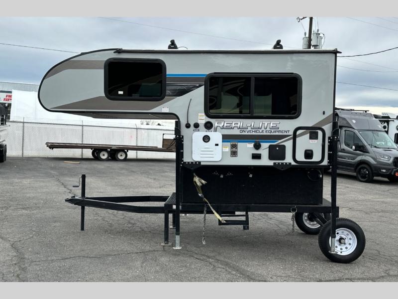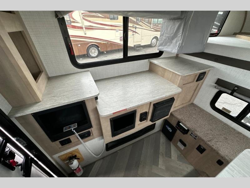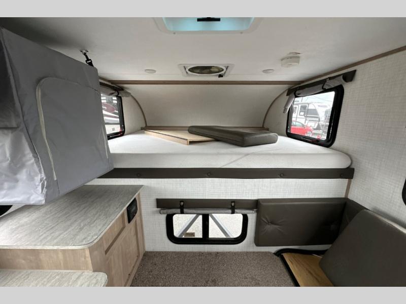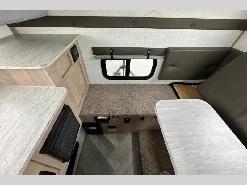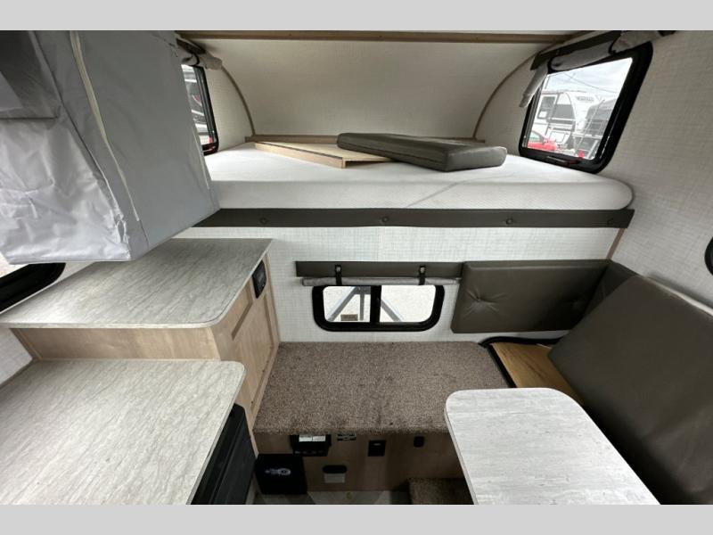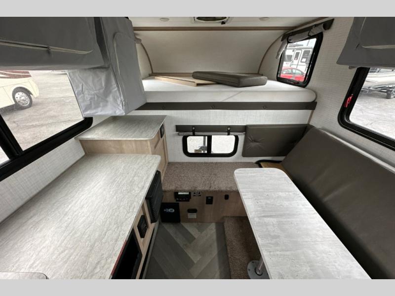 This truck camper is perfect for a 1/2 ton tuck with a 5' 6" or larger bed! You will find the 60" x 80" queen-size bed with a 5" innerspring mattress ultra comfortable after a day of traveling all day, and the laminated roof on this model will last for years of use. There is L-shaped seating with storage space for a toilet if you choose to bring one along. You will appreciate the ample counter space in this truck camper, including space to set your cooler at so you don't have to reach down to the floor each time. Don't forget to check out the available options, like the side awning with LED lights, electric jacks, or TV to name a few!