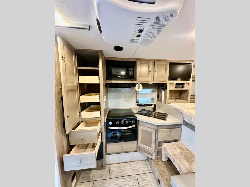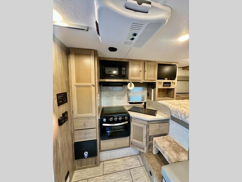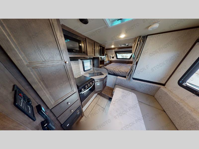 Pack up your fishing gear and load this hard side truck camper onto your truck! Start your mornings feeling recharged after sleeping on the front queen bed with a wrap around nightstand, chests on either side, and a wardrobe to keep your shirts wrinkle-free. You'll also enjoy the entertainment center with a TV on this model to watch your favorite shows in bed. The kitchen has everything you need to prepare your best meals including two pantries, one of which is a wardrobe/pantry for double use. The sofa with a table offers a comfortable place to enjoy your meals, as well as transform into an extra sleeping space.