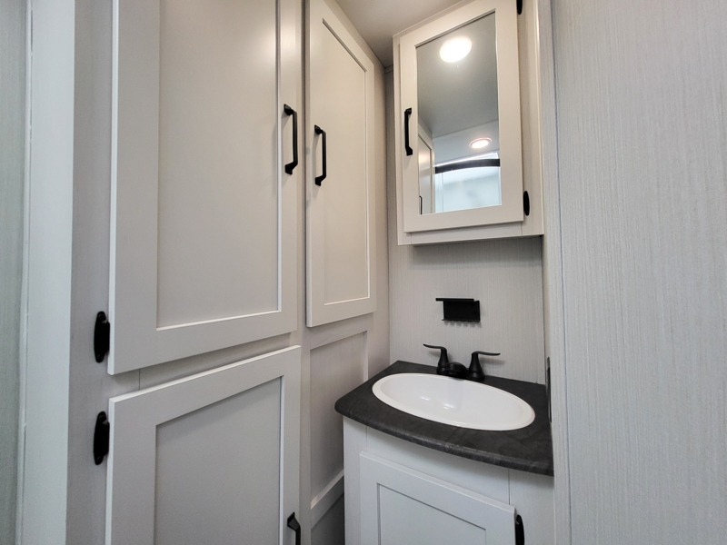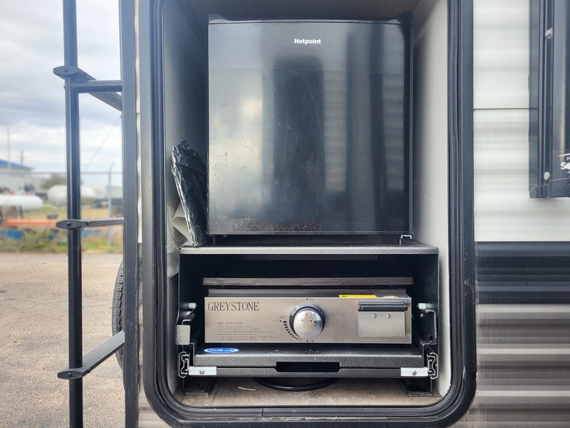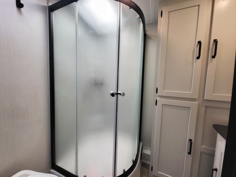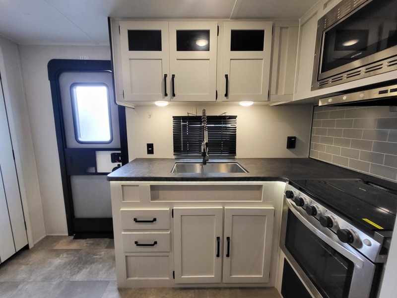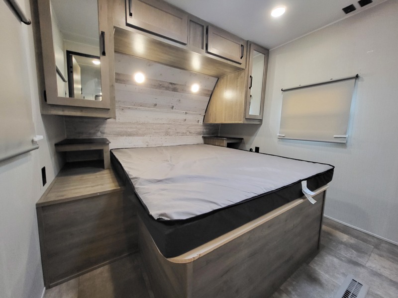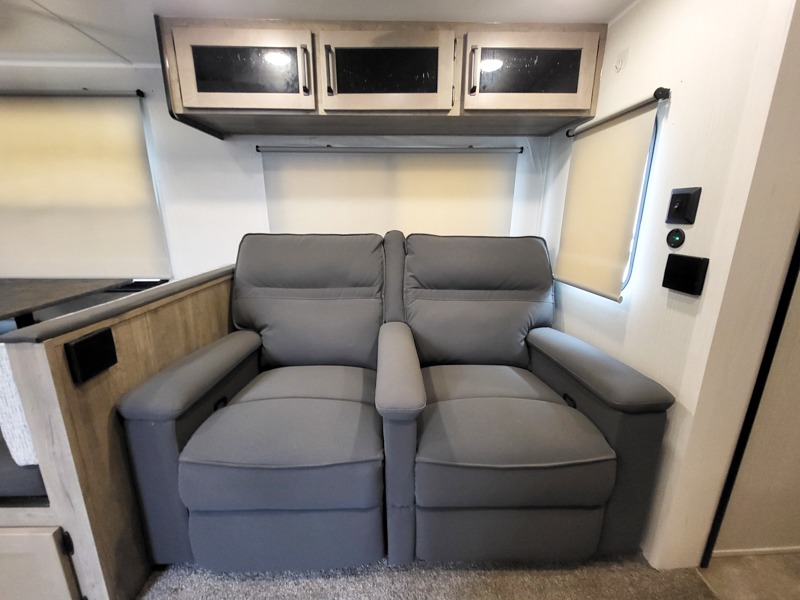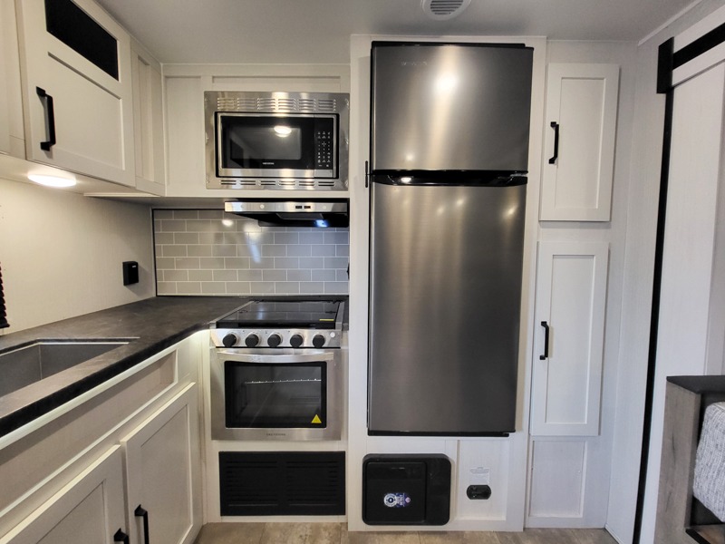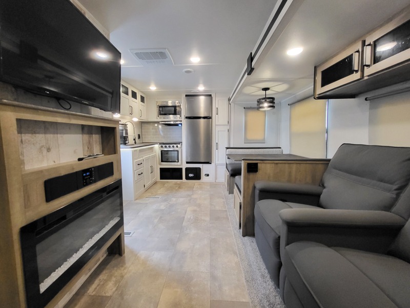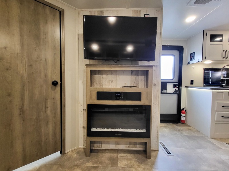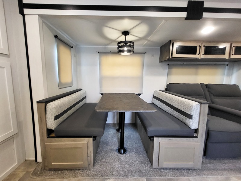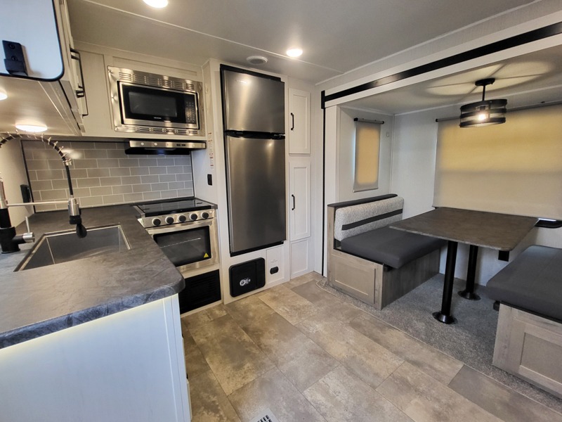 The chef will love cooking in the rear kitchen of this travel trailer! The booth dinette offers a comfortable place to dine, play, and even sleep. Take an afternoon nap on the sofa and watch your favorite movies at night with the entertainment center, and you may want to add the optional fireplace here to make it feel more like home. Start your mornings off feeling fresh by showering in the full bathroom with the 34" x 34" radius shower after getting a good night's rest on the queen bed in the front private bedroom!