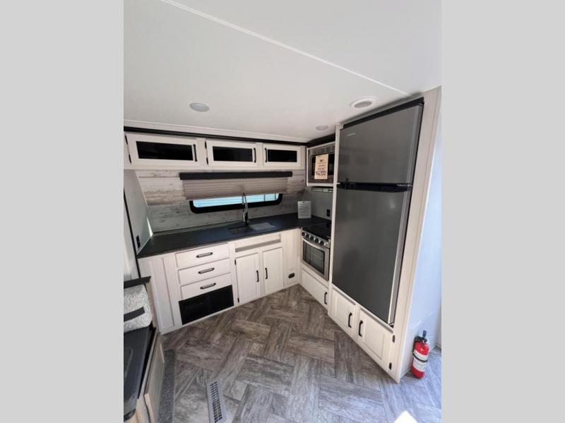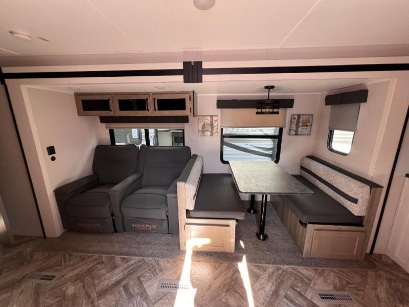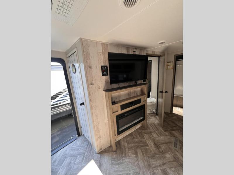 Walk into this travel trailer with one of the dual entry doors for a great camping trip! One entrance enters directly into the rear private bedroom which has a queen bed slide, a walk-in closet that is prepped for an optional washer and dryer, a wardrobe, and even an entrance into the dual entry bathroom. Grab a snack from the walk-in pantry then relax on the sofa while you watch a movie with the entertainment center or play a game at the booth dinette. The front kitchen has everything you will need to prepare your best home cooked meals including lots of countertop space, a three burner cooktop, and a residential refrigerator!