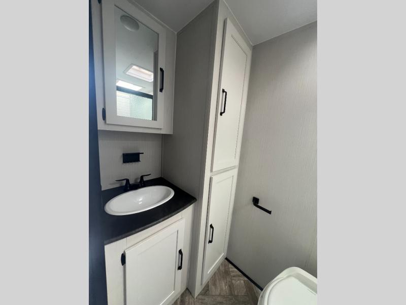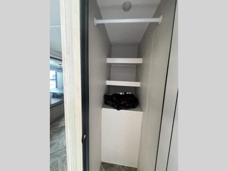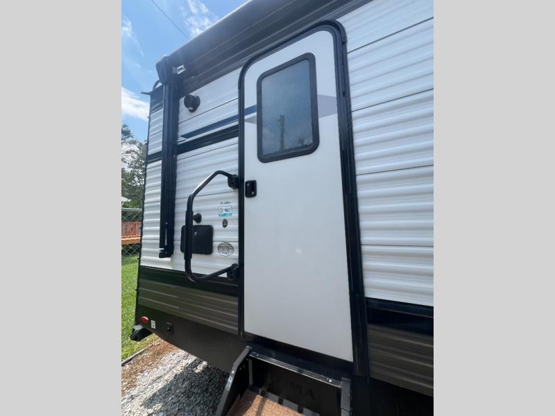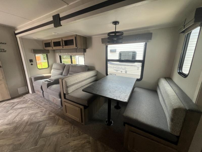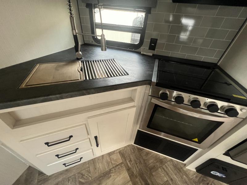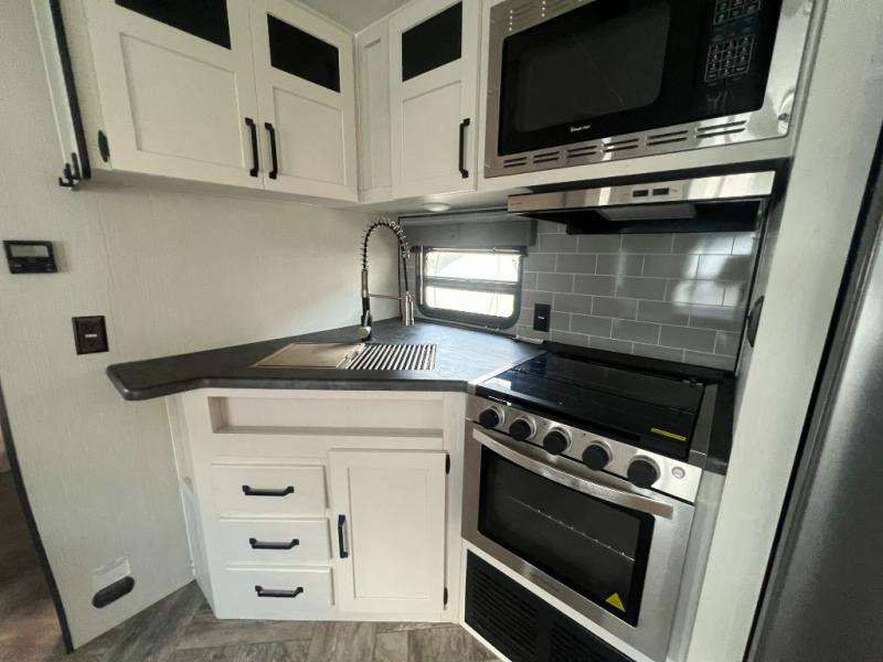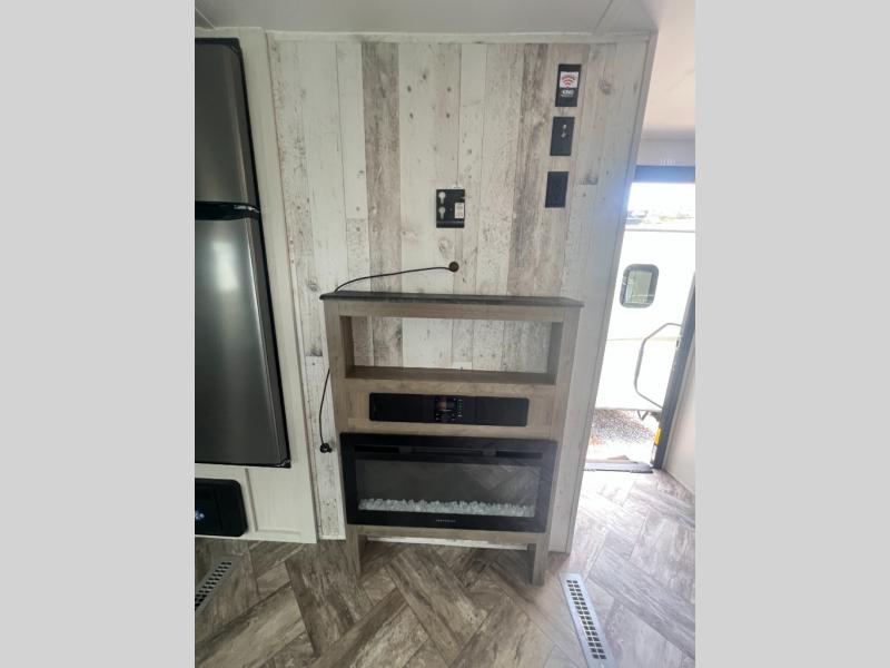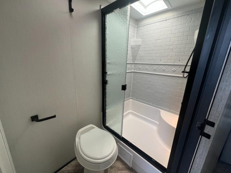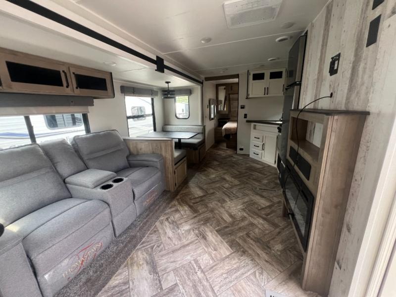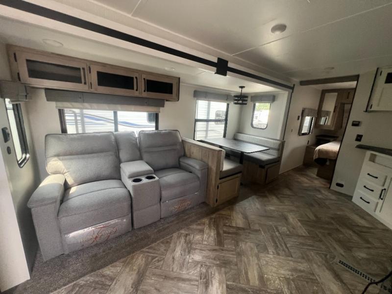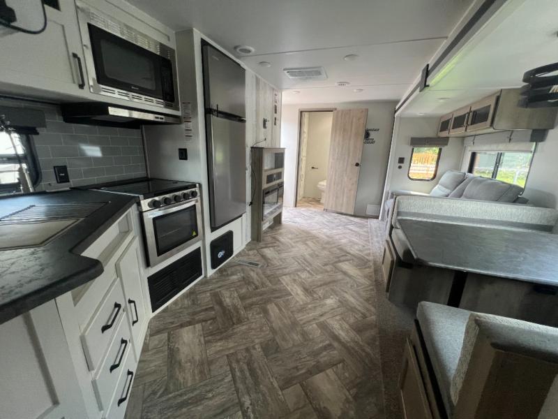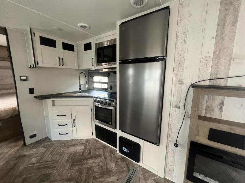 Pack your bags and hitch up this travel trailer for a great adventure! The full rear bathroom has a 32" x 40" shower with a seat and a closet for you to start each morning feeling clean and fresh. Now that you're ready for the day, grab some eggs from the 11 cu. ft. stainless steel refrigerator to fry on the three burner cooktop and enjoy at the booth dinette. If mother nature is raining on your parade then you can relax on the sofa and watch your favorite movies with the entertainment center which has a closet/pantry behind it.