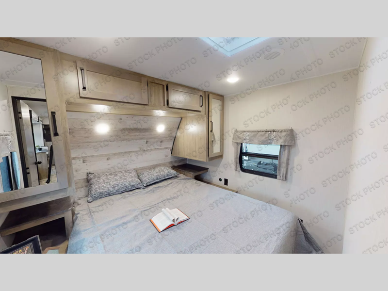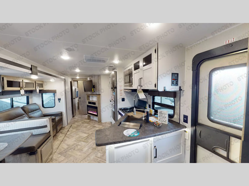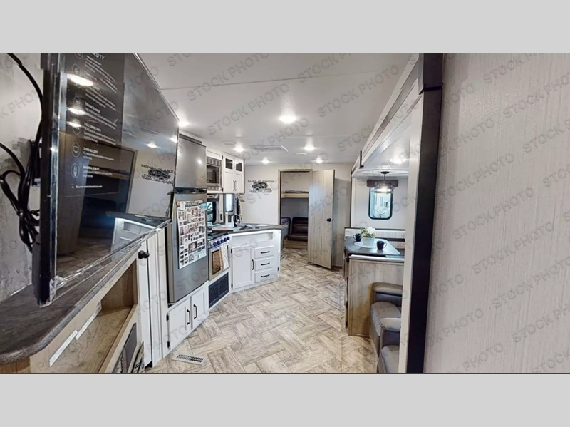 There's a comfortable place to sleep for the whole family in this travel trailer! The rear private bunkhouse has a set of 28" x 76" bunk beds, a 28" x 65" bunk above a sofa, and a wardrobe with an entertainment center above it so they can bring a cousin or two to join in on the fun. You will have your own privacy with the front private bedroom which has a queen bed with shirt closets and nightstands on either side of it. The dual entry bathroom has a 34" x 34" radius shower for everyone to freshen up and one of the entrances leads directly outside so you can get back to having fun fast. Prepare your best home cooked meals indoors with the walk-in pantry, the three burner cooktop, and the 11 cu. ft. stainless steel refrigerator. Plus, there is a U-shaped dinette to enjoy your meals and even transform into an extra sleeping space!