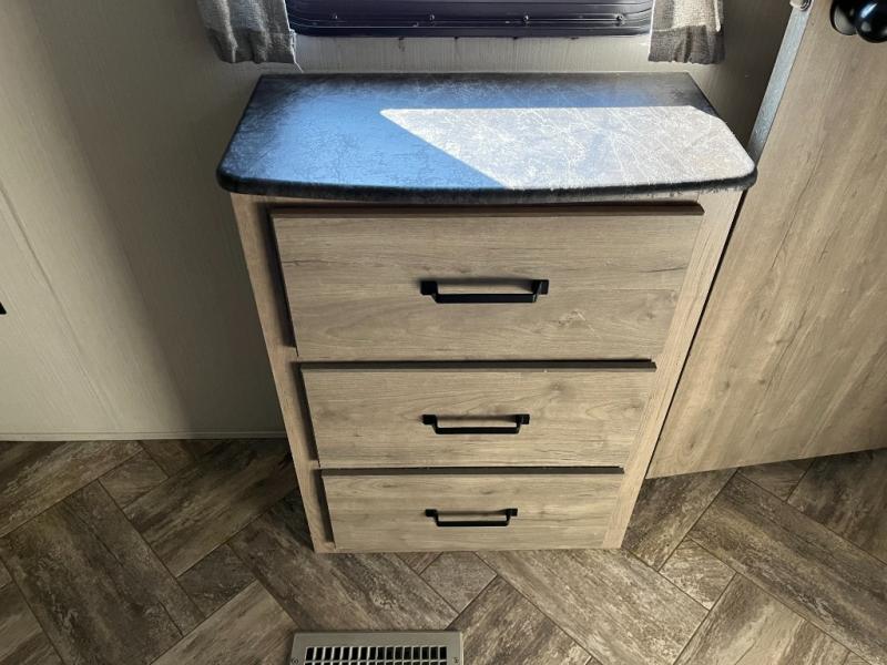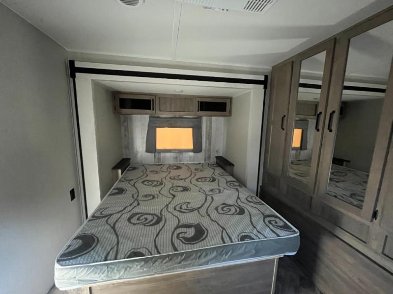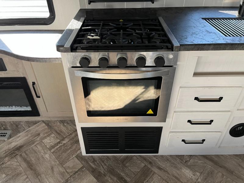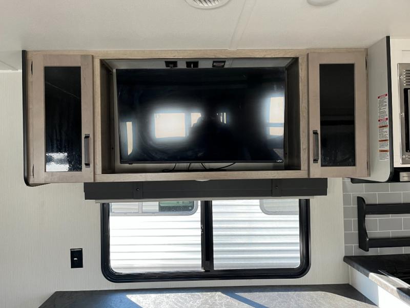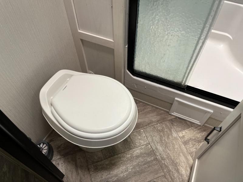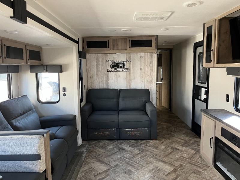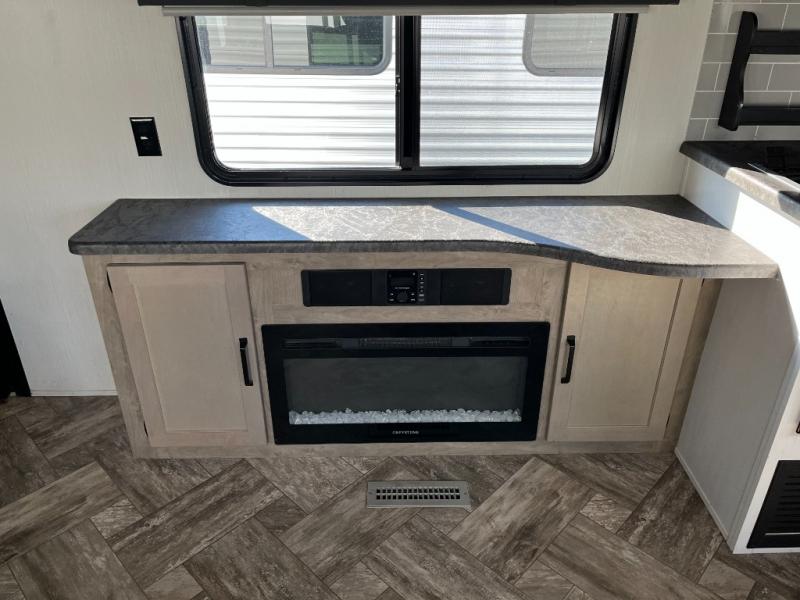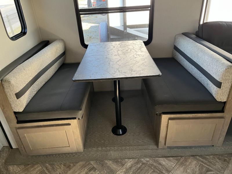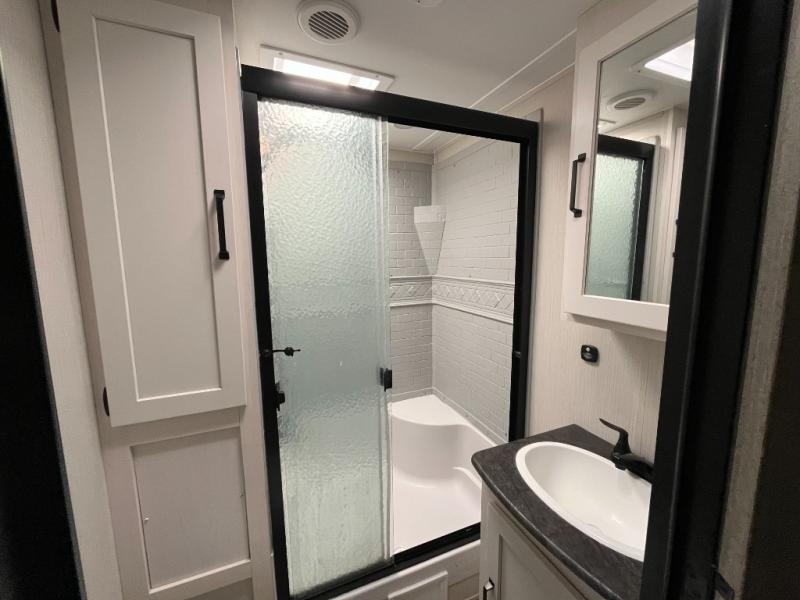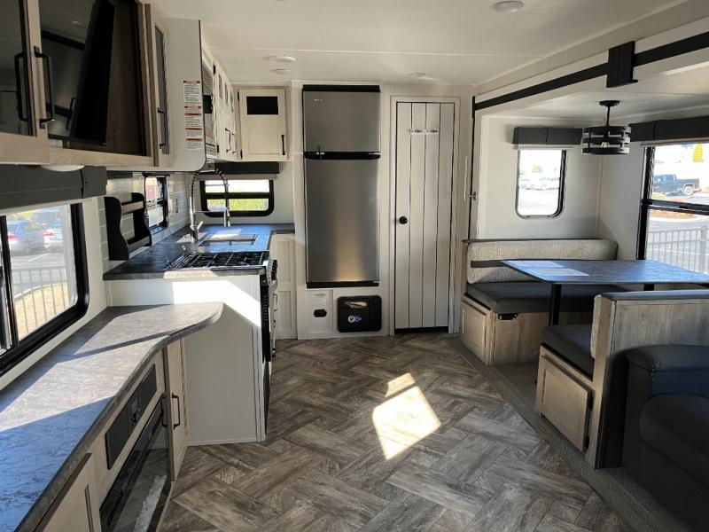 The functional kitchen in the 30RKQS is designed to support real meal prep on the road. Featuring a three-burner cooktop with oven, microwave, and a spacious refrigerator, this kitchen gives you the tools you need to prepare home-style meals, quick breakfasts, or camp-favorite dinners. Ample countertop space and storage cabinets keep your cookware, dishes, and pantry essentials organized and within reach throughout your trip.