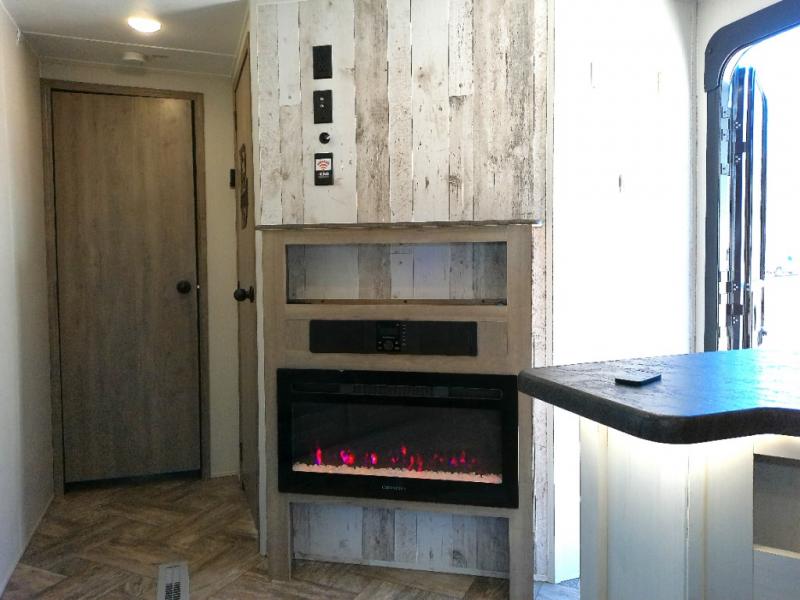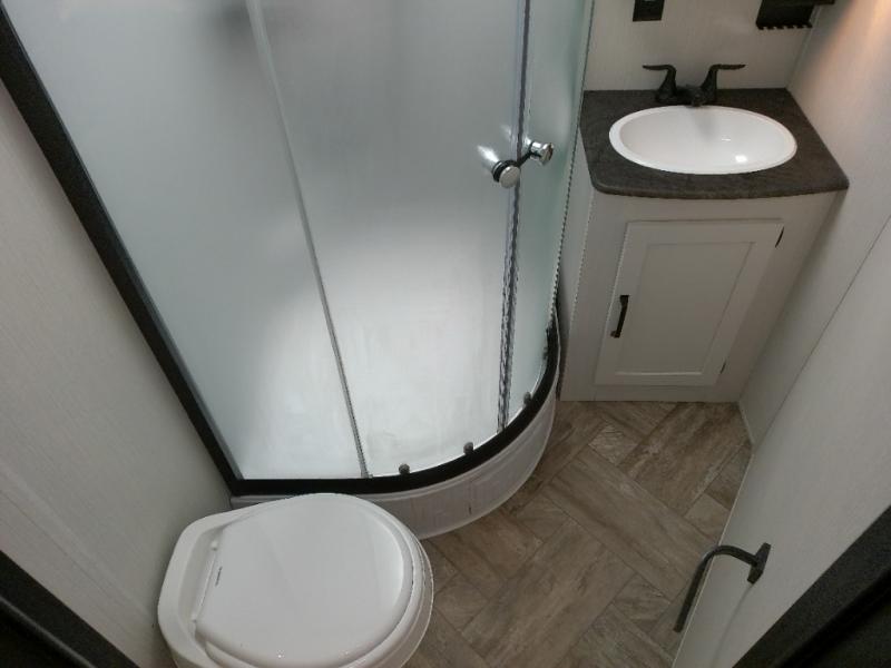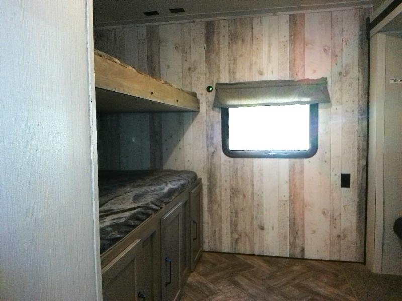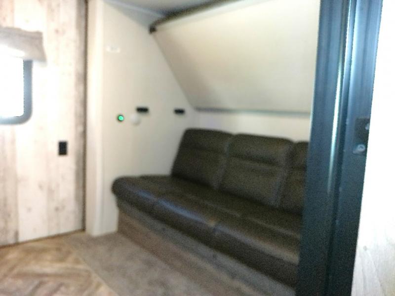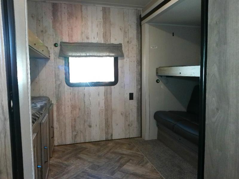 With dual entry doors and a bath and a half, you will have the ultimate in convenience with this travel trailer! The bedroom also has a front closet to keep your clothes looking their best and a queen bed slide for you to sleep your best. Everyone can freshen up in the full bathroom with the 34" x 34" radius shower and fill their bellies with scrambled eggs cooked on the three burner cooktop. Enjoy your meals, play games, and even sleep at the booth dinette or relax on the sofa while watching a movie with the entertainment center. And your guests will love the rear private bunkhouse with three bunks, a jiffy sofa, and a slide out for more space!