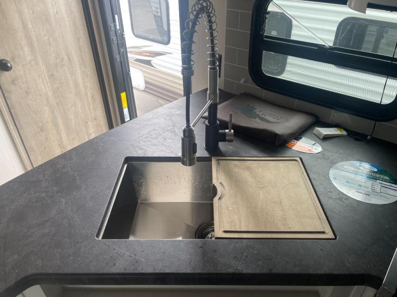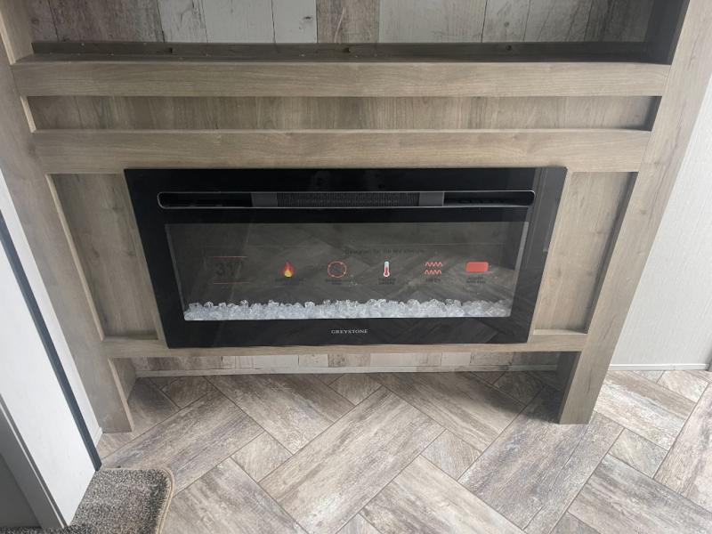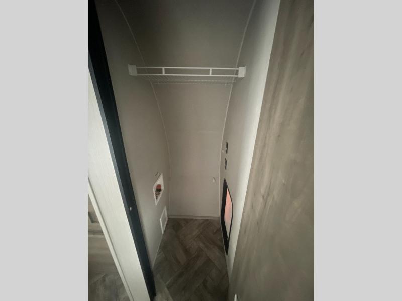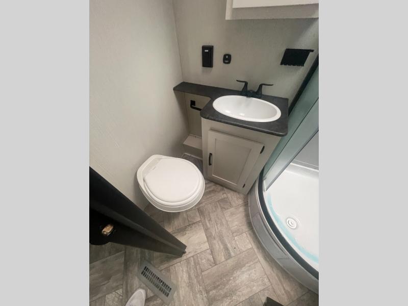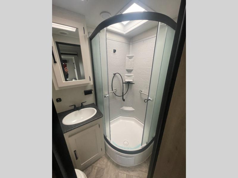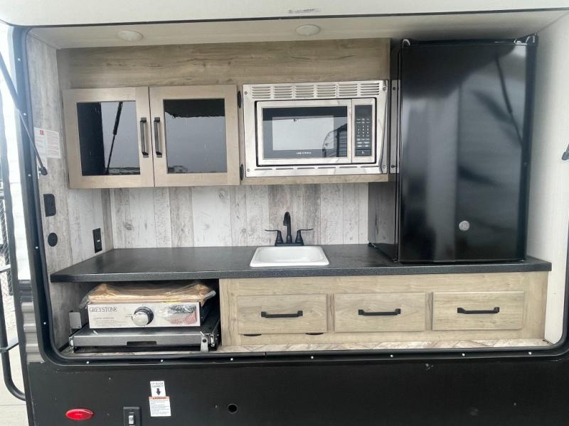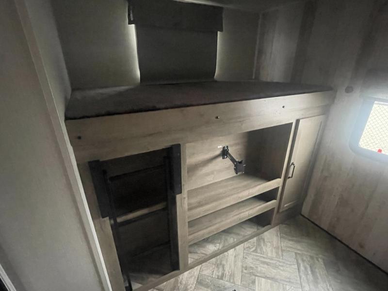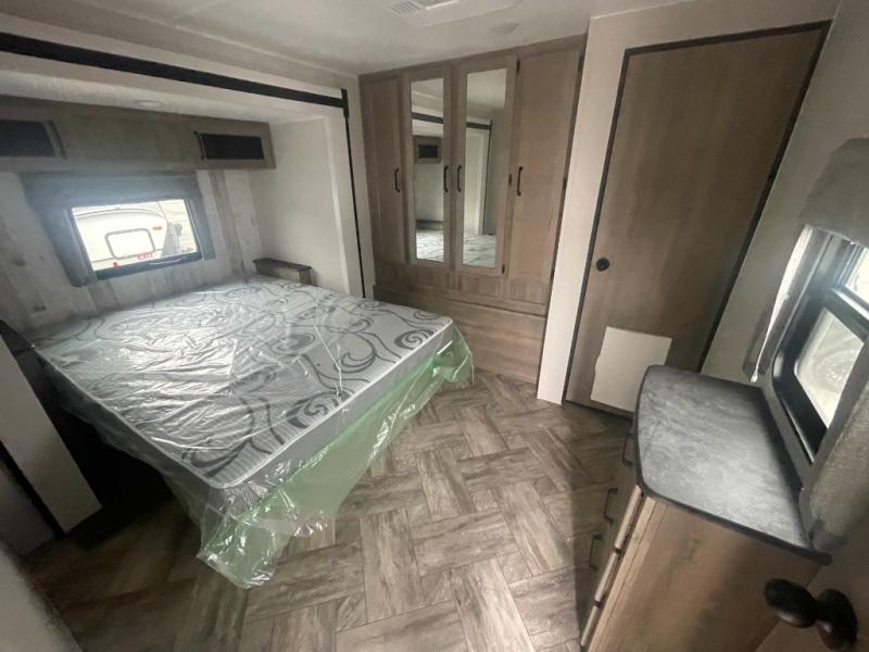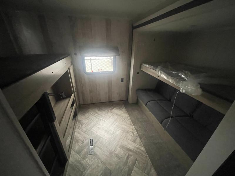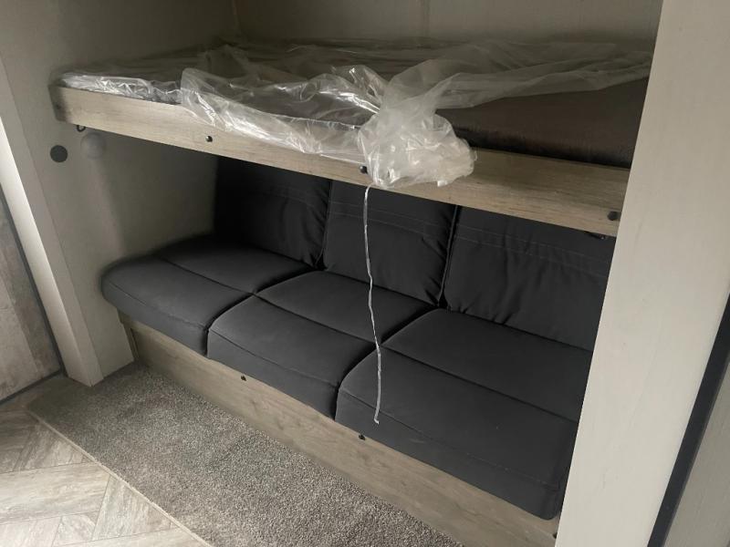 The whole family will love camping in this travel trailer! The kids will have their own privacy with the rear private bunkhouse which has a 32" x 69" bunk above a jiffy sofa slide and a 38" x 76" bunk above an entertainment center to keep them occupied on those rainy days. And you will have your own privacy with the front private bedroom that has a queen bed slide across from a dresser and a front closet with another closet next to it that is prepped to add an optional washer and dryer. Everyone can stay clean in the full bathroom with the 34" x 34" radius shower and their bellies full with a three burner cooktop.