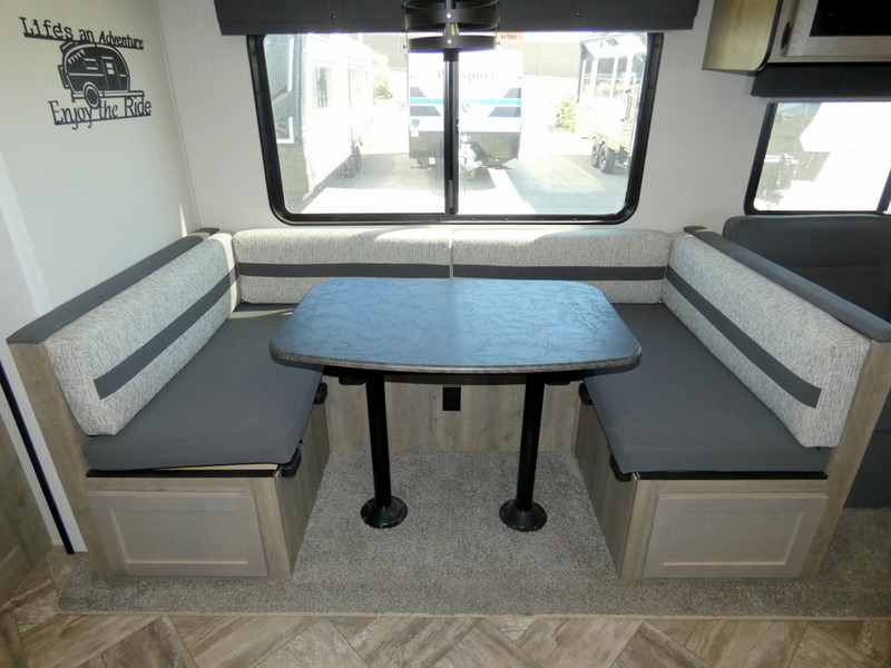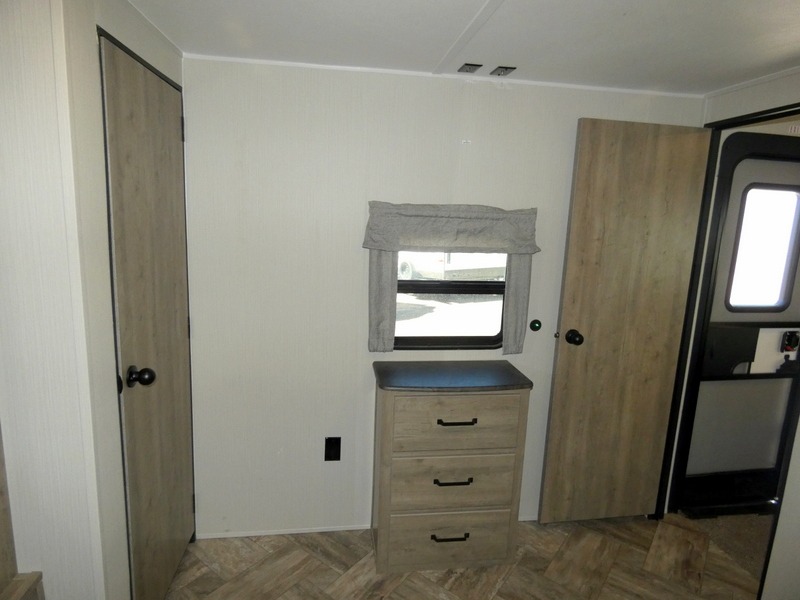Enjoy your own privacy with two bedrooms in this travel trailer! The front private bedroom has a queen bed slide across from a dresser and a front closet with another closet next to it that is prepped to add a washer and dryer so you can extend your stay with clean clothes, and the rear private bedroom has a 60" x 74" queen bed slide, a dresser, and a closet. Everyone can stay clean in the full bathroom with the 34" x 34" radius shower and their bellies full with a three burner cooktop. Enjoy your meals at the U-shaped dinette then relax on the sofa while watching your favorite movies with the entertainment center.