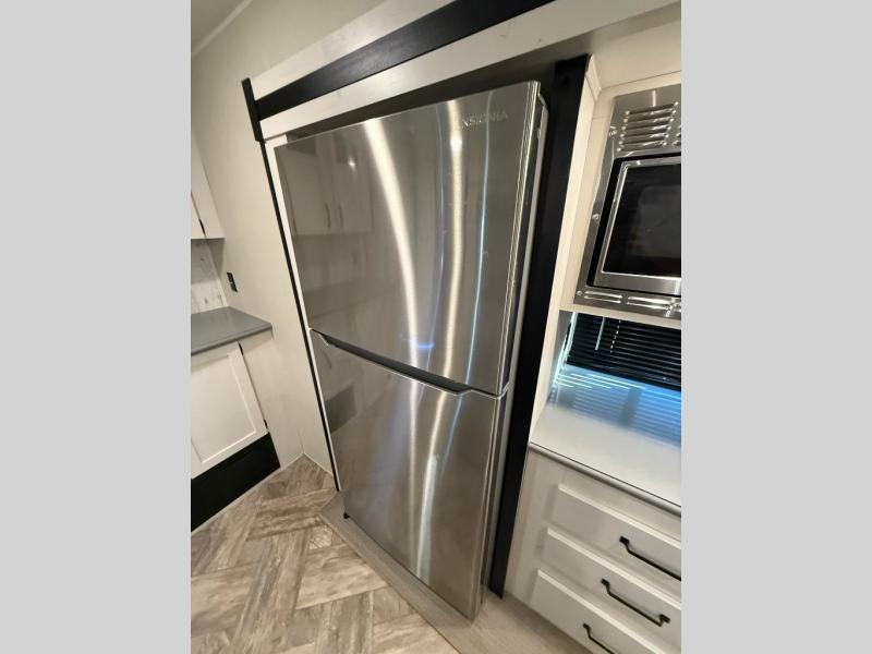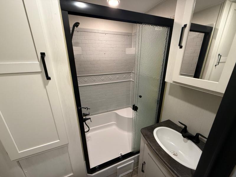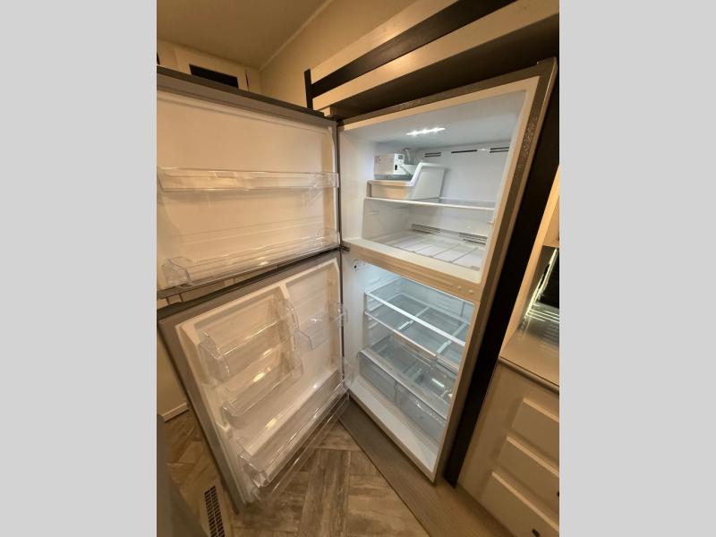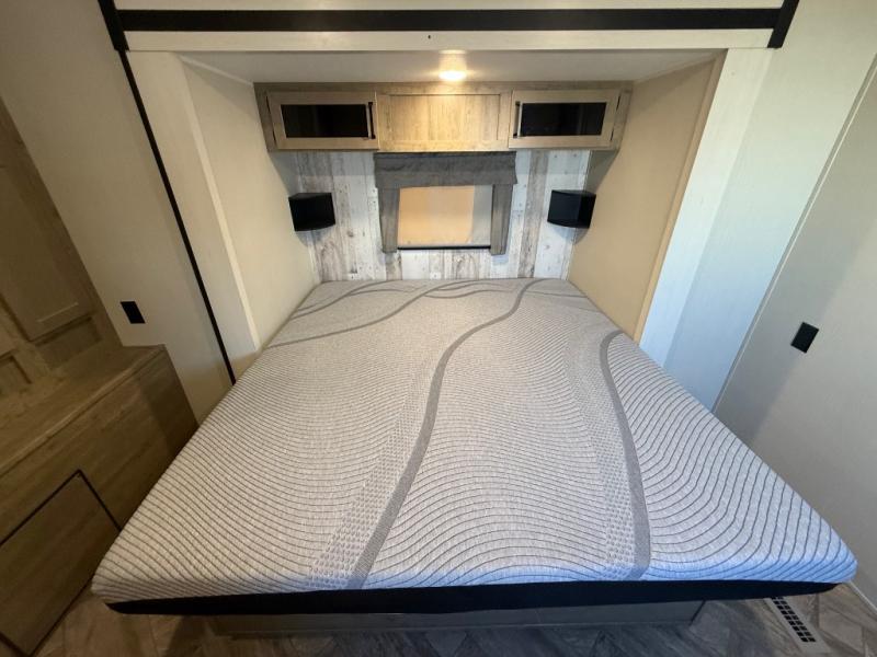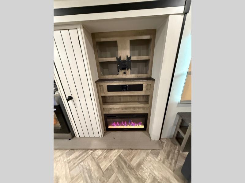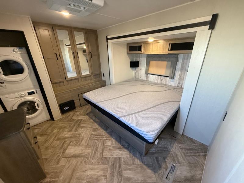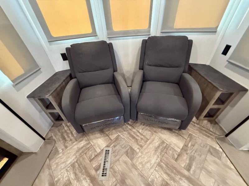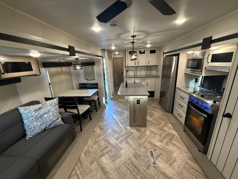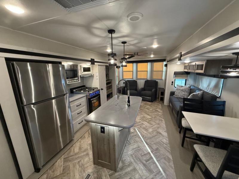 Get ready to enjoy your destination for a weekend or even longer in comfort with the front living and kitchen combined area. The sofa and booth dinette offer relaxing and dining space as well as sleeping space when needed. There are two recliners you are sure to love, and you might have decided to add the optional fireplace. There is a kitchen island to prepare and serve meals from, and wash the dishes. The kitchen offers full amenities including a residential style refrigerator and plenty of storage. You will surely enjoy the natural lighting from the patio door, and the second entry/exit is located in the rear private bedroom where you can sleep like a king, and you might like to wash your clothes if you added a washer/dryer option to the prepped space.