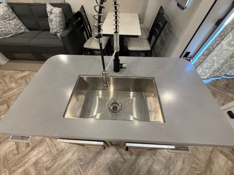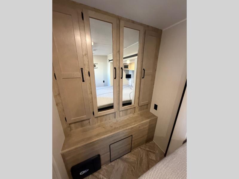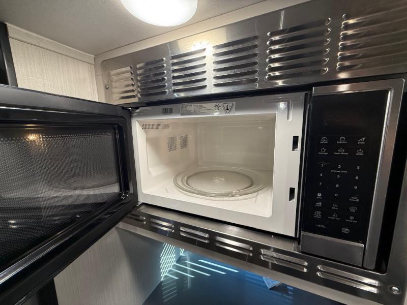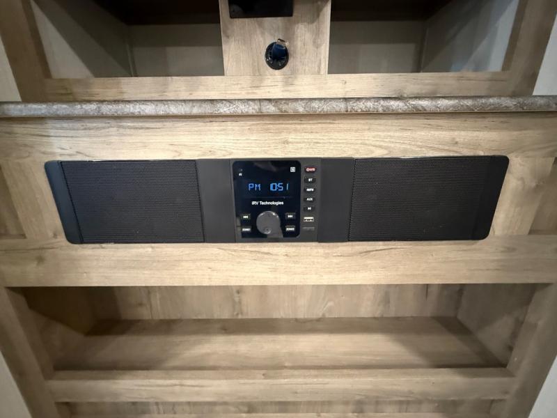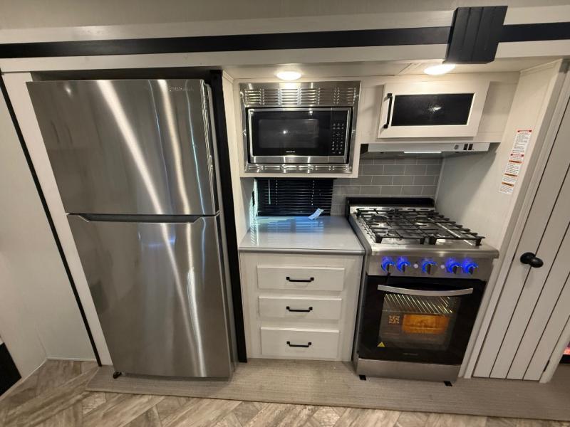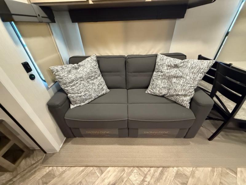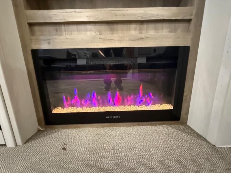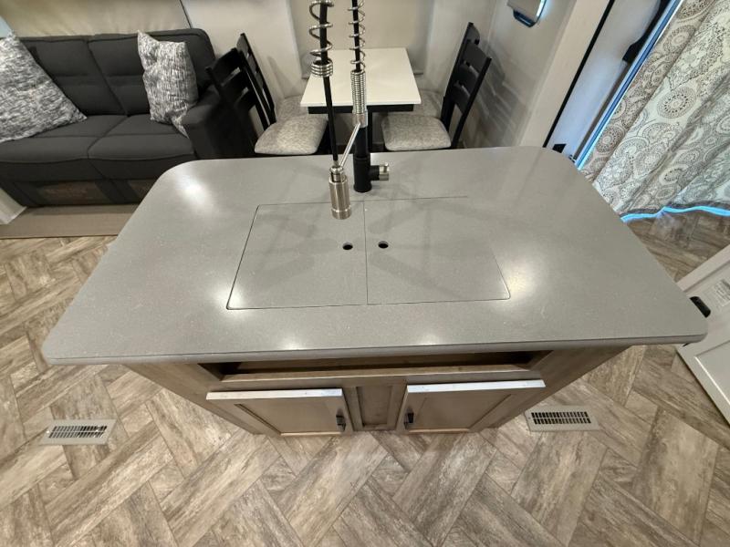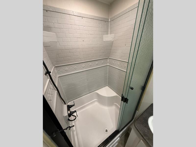 Get ready to enjoy your destination for a weekend or even longer in comfort with the front living and kitchen combined area. The sofa and booth dinette offer relaxing and dining space as well as sleeping space when needed. There are two recliners you are sure to love, and you might have decided to add the optional fireplace. There is a kitchen island to prepare and serve meals from, and wash the dishes. The kitchen offers full amenities including a residential style refrigerator and plenty of storage. You will surely enjoy the natural lighting from the patio door, and the second entry/exit is located in the rear private bedroom where you can sleep like a king, and you might like to wash your clothes if you added a washer/dryer option to the prepped space.