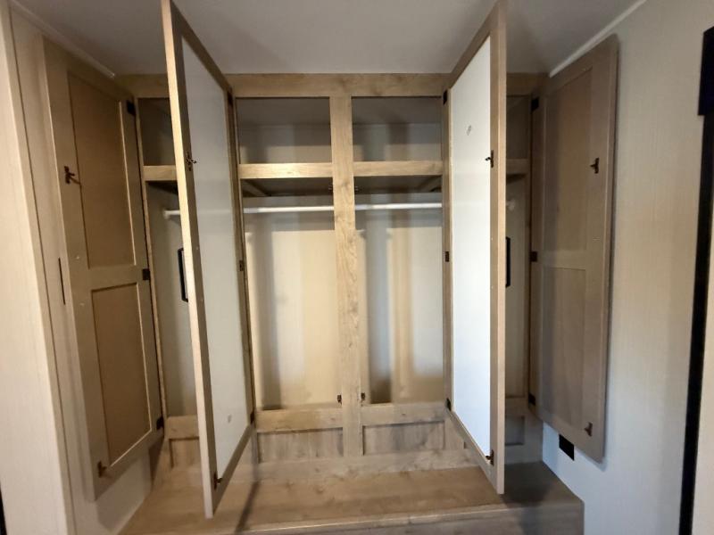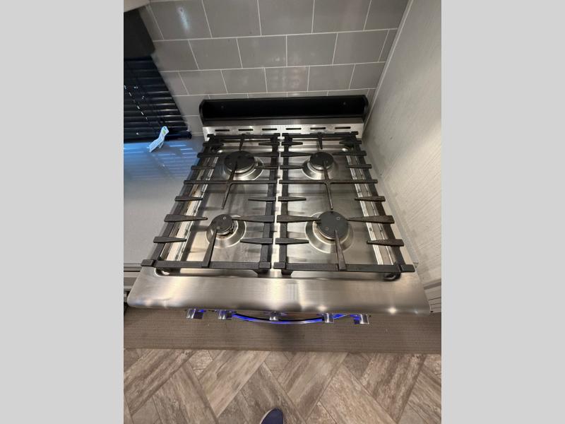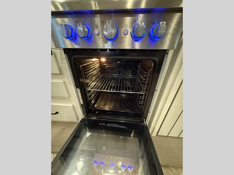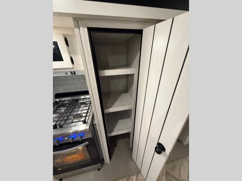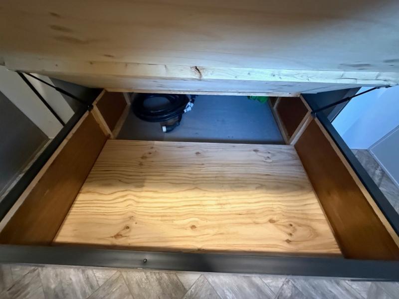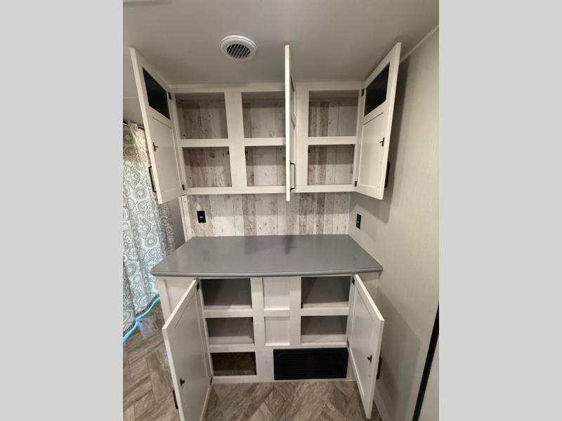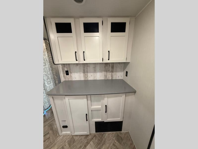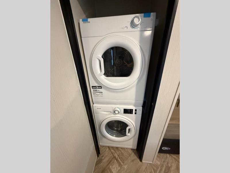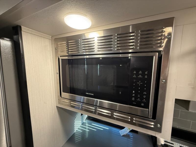 Get ready to enjoy your destination for a weekend or even longer in comfort with the front living and kitchen combined area. The sofa and booth dinette offer relaxing and dining space as well as sleeping space when needed. There are two recliners you are sure to love, and you might have decided to add the optional fireplace. There is a kitchen island to prepare and serve meals from, and wash the dishes. The kitchen offers full amenities including a residential style refrigerator and plenty of storage. You will surely enjoy the natural lighting from the patio door, and the second entry/exit is located in the rear private bedroom where you can sleep like a king, and you might like to wash your clothes if you added a washer/dryer option to the prepped space.