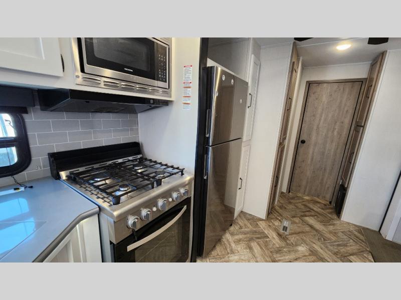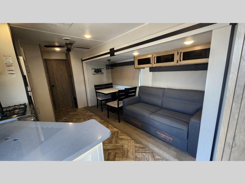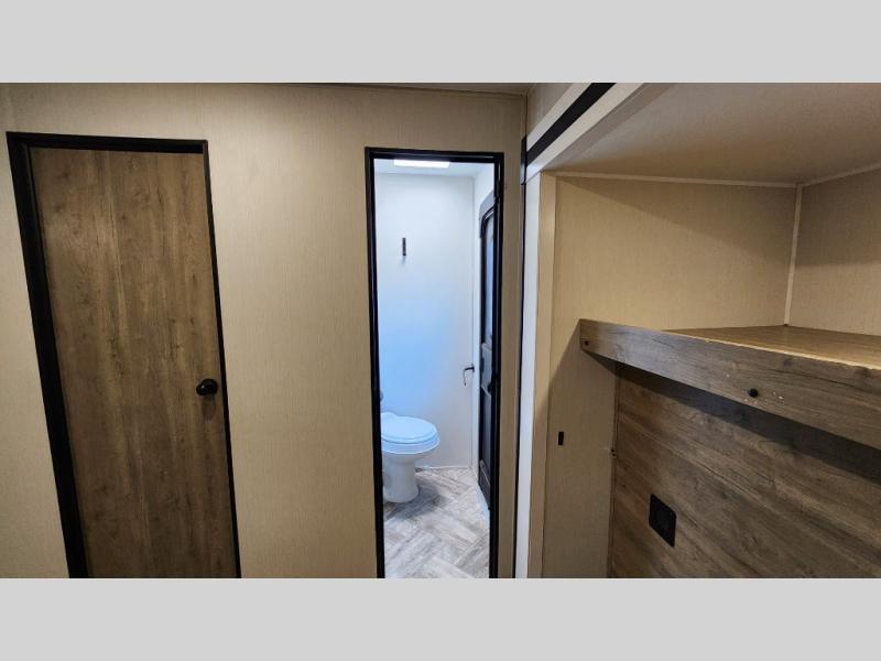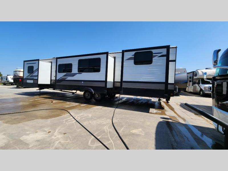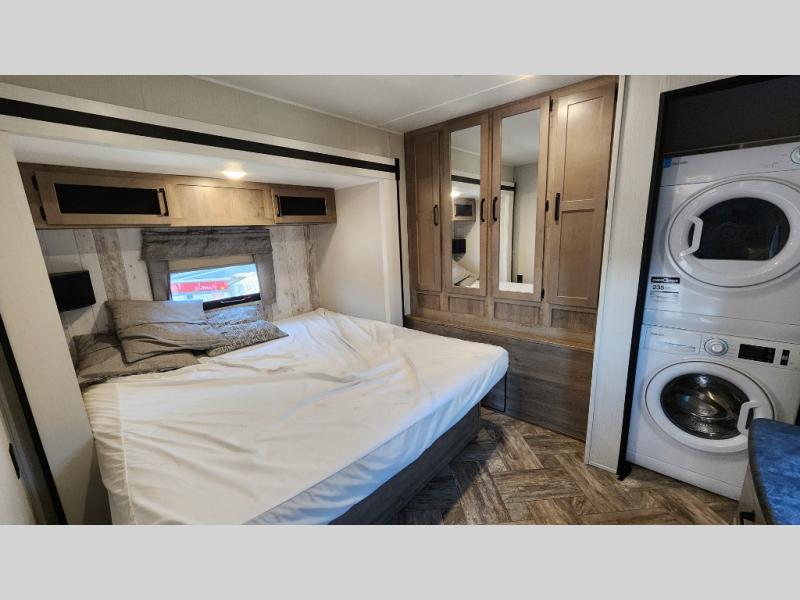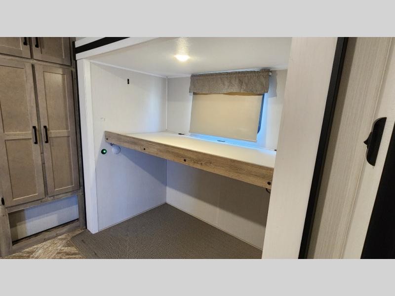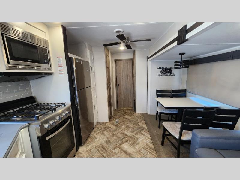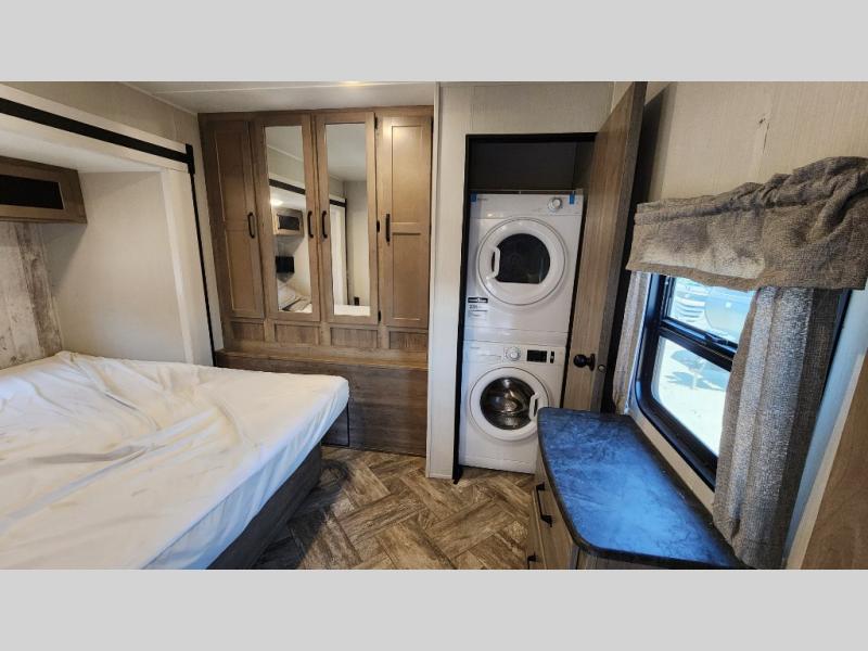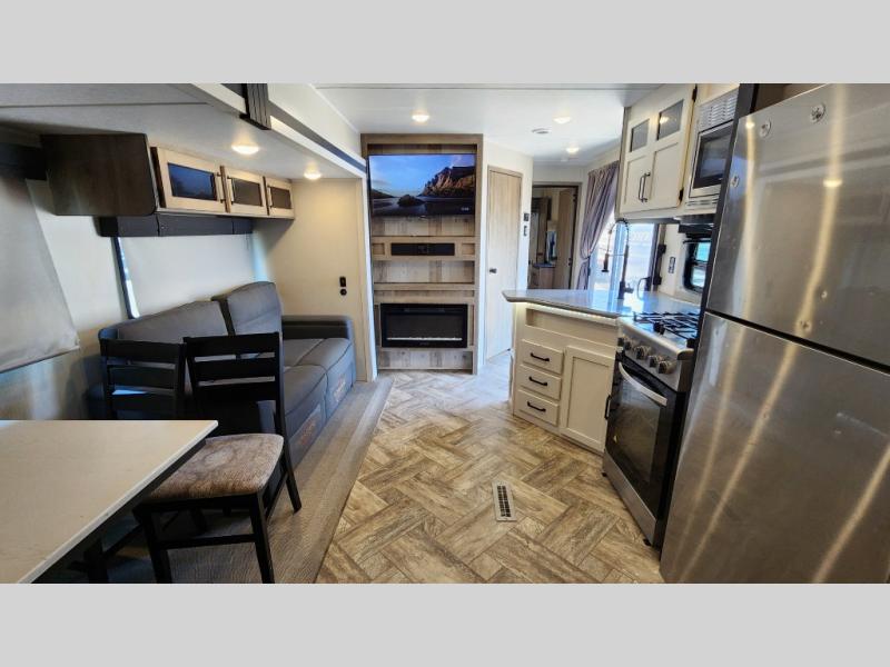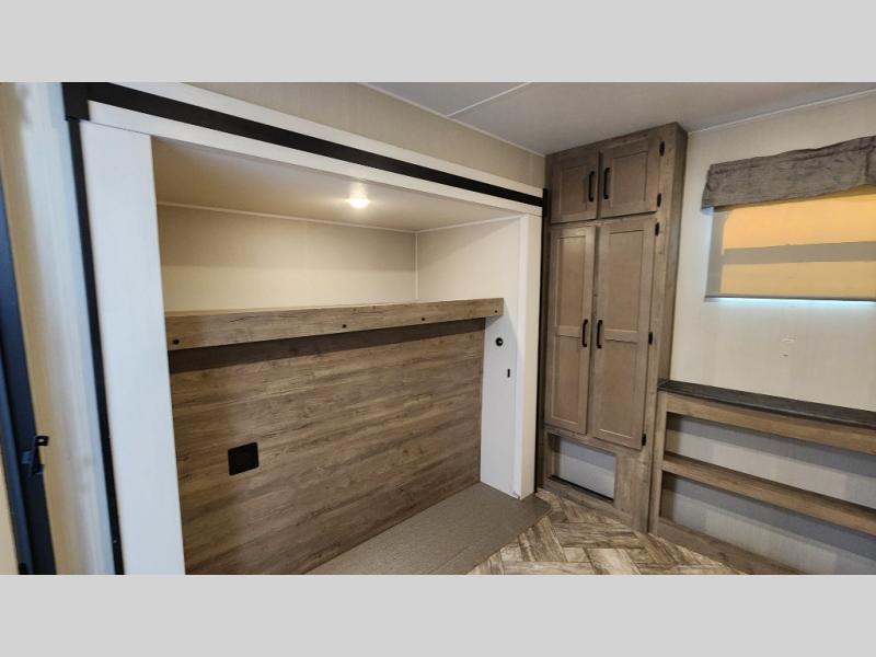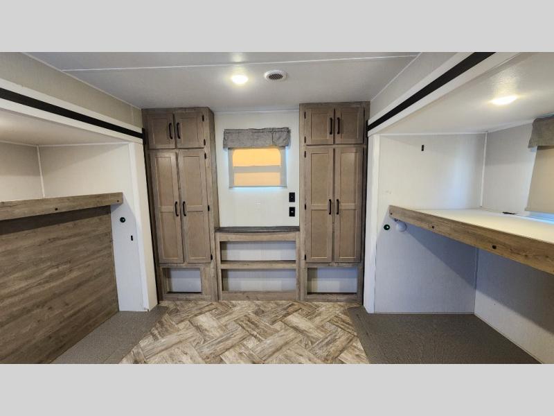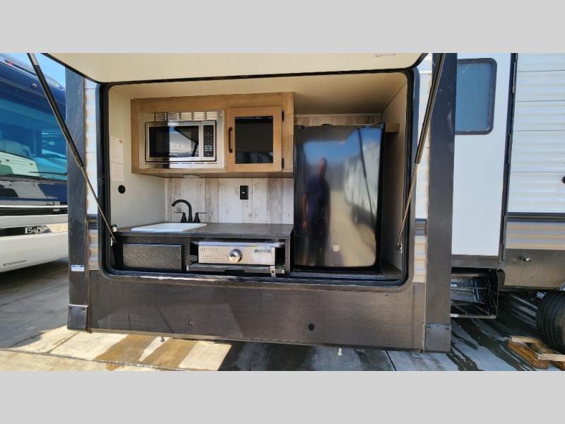 This destination trailer will probably be in the family for years to come with all of its features and amenities such as the rear private bunkhouse with a half bath attached, the dual entry doors for a smooth flow of traffic when everyone joins you, and the spacious bedroom with a slide out king-size bed, plus washer/dryer prepped space. The bunkhouse includes a slide out bunk with a jiffy sofa below, a slide out set of bunks, plus an entertainment center in between two wardrobes. The main living and kitchen area offers full amenities, a U-shaped dinette to dine at and a sofa to relax on. You may even like to add the outside kitchen option!.