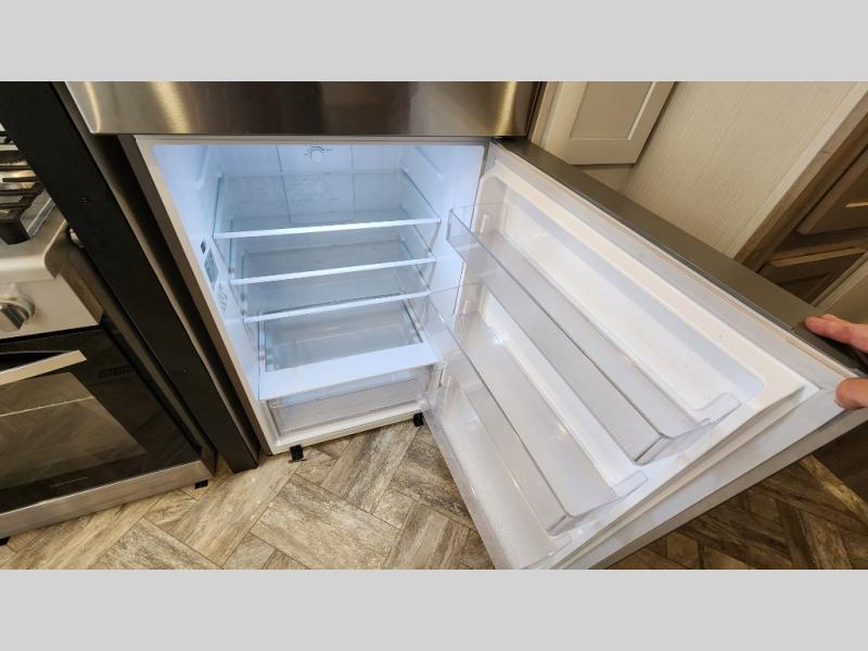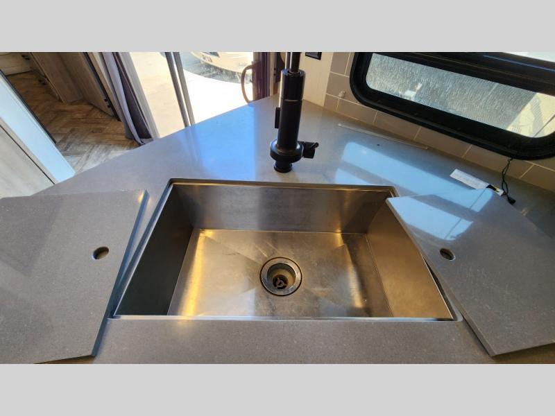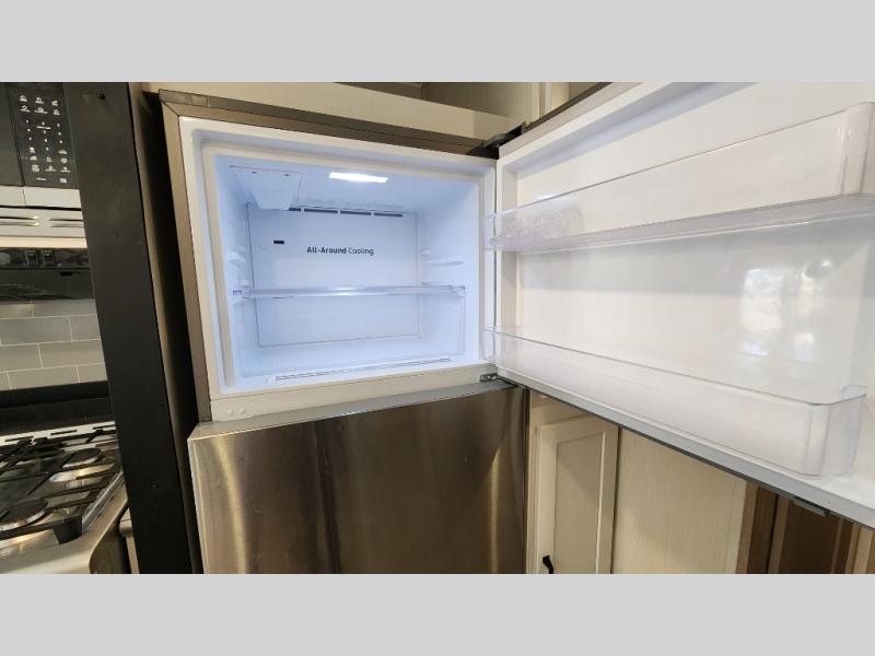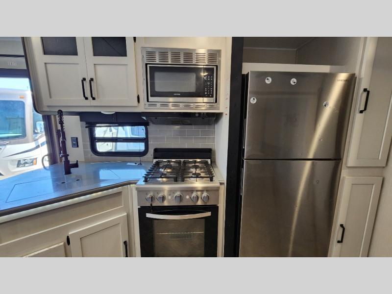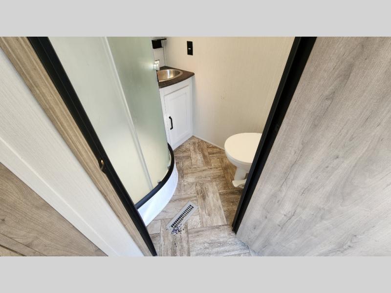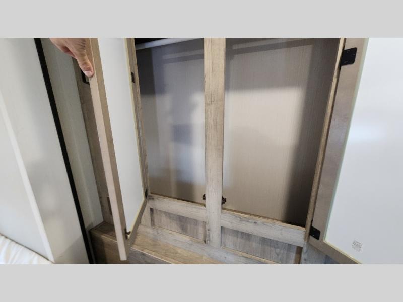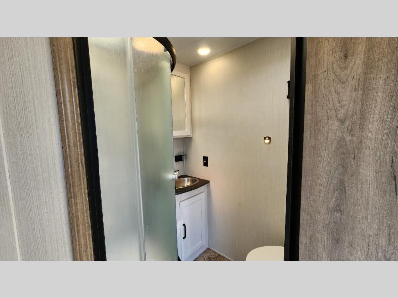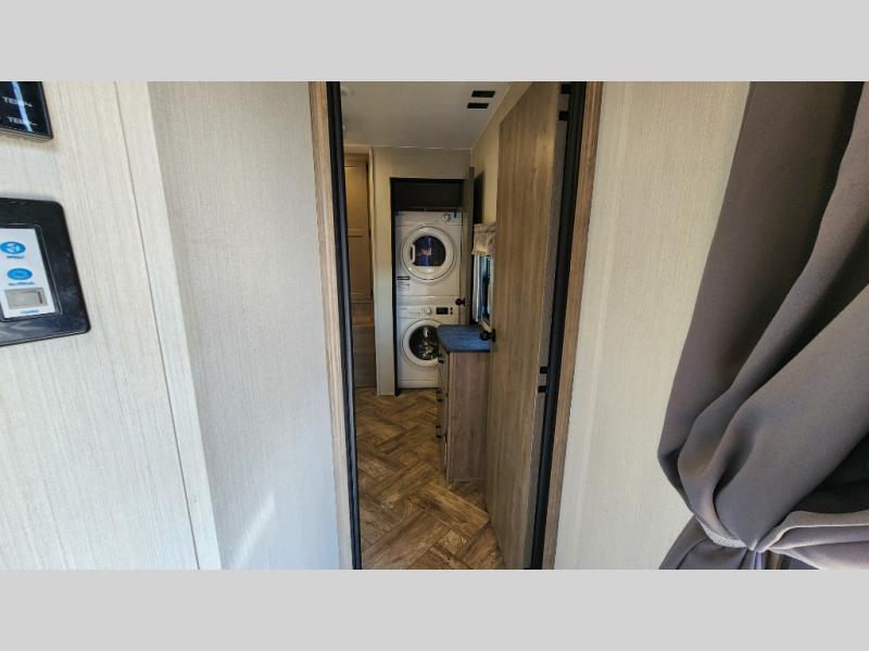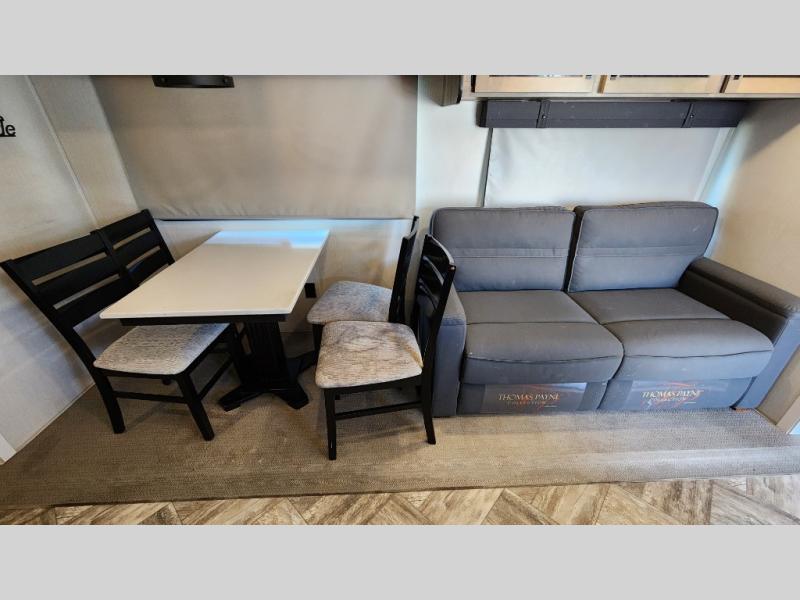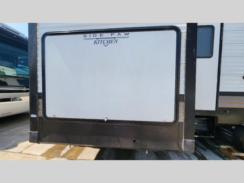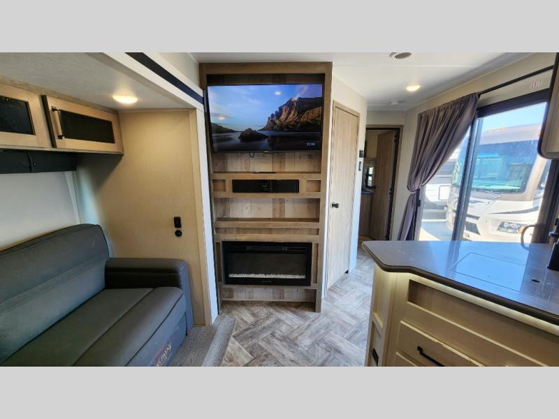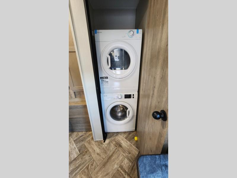 This destination trailer will probably be in the family for years to come with all of its features and amenities such as the rear private bunkhouse with a half bath attached, the dual entry doors for a smooth flow of traffic when everyone joins you, and the spacious bedroom with a slide out king-size bed, plus washer/dryer prepped space. The bunkhouse includes a slide out bunk with a jiffy sofa below, a slide out set of bunks, plus an entertainment center in between two wardrobes. The main living and kitchen area offers full amenities, a U-shaped dinette to dine at and a sofa to relax on. You may even like to add the outside kitchen option!.