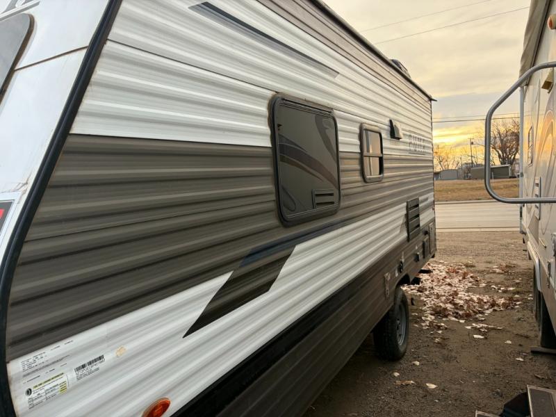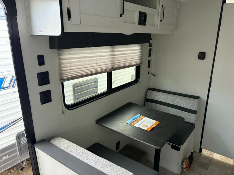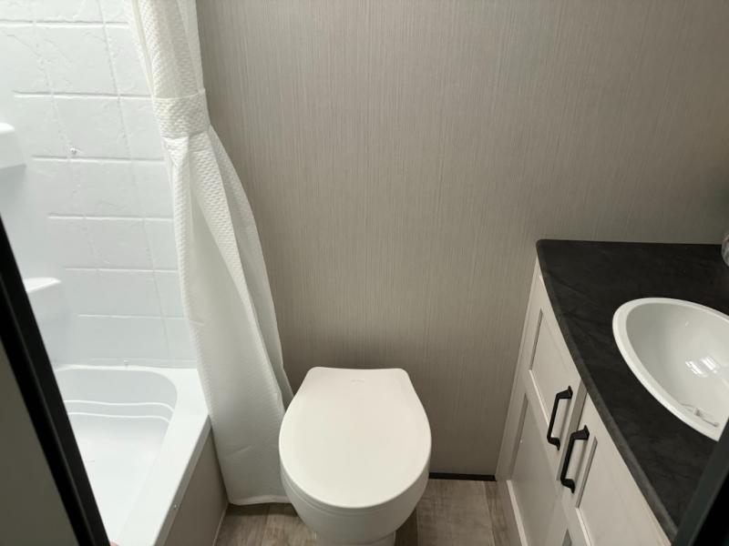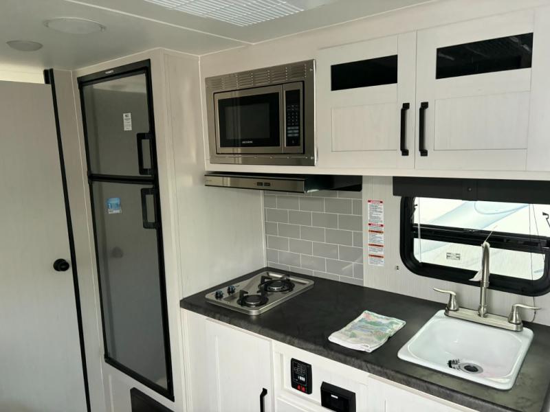 You are going to love this trailer with its rear full bathroom and front walk-around RV queen bed. This is the perfect couple's trailer or smaller family get-away! You will find storage on each side of the bed for your clothing as well as a place to put your cellphone and keys, and overhead storage for blankets and such. The booth dinette for two also offers overhead storage for your dry goods, plates and games. The kitchen provides a stainless steel microwave, two-burner cooktop and a residential refrigerator. And the reason you might have purchased this trailer, the rear full bathroom that offers everything you need and a spacious room to change in.