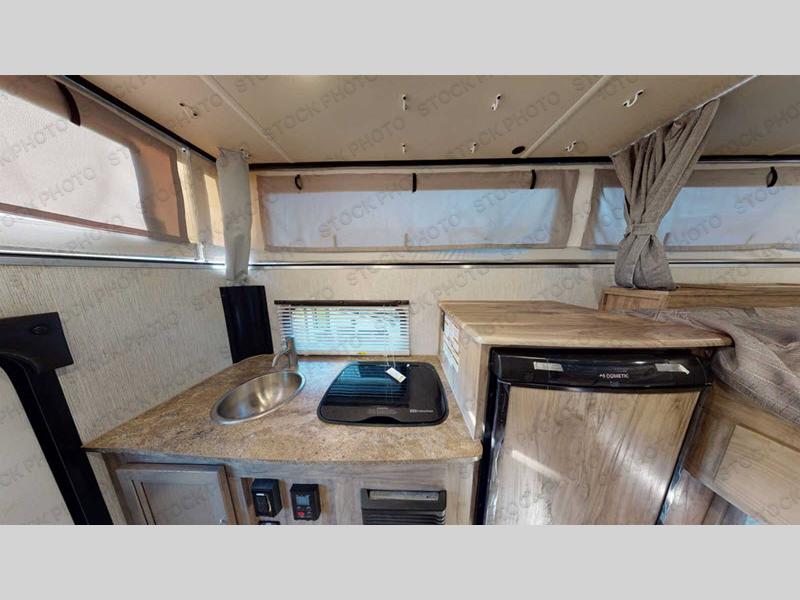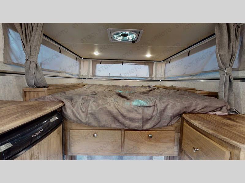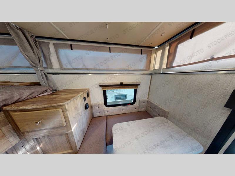 Grab your honey and head to your favorite camping spot in this cozy truck camper. If you have a 1/2 ton truck with a 5' 6" bed up to an 8' bed, it'll be perfect for you. The two burner cooktop allows you to cook your own meals each day, and the three-way refrigerator can store your perishables. There is a U-shaped dinette for two to three people and a wardrobe to store your clothes. This model also includes two foot lockers on either side of the queen bed for your book, phone, or valuables!