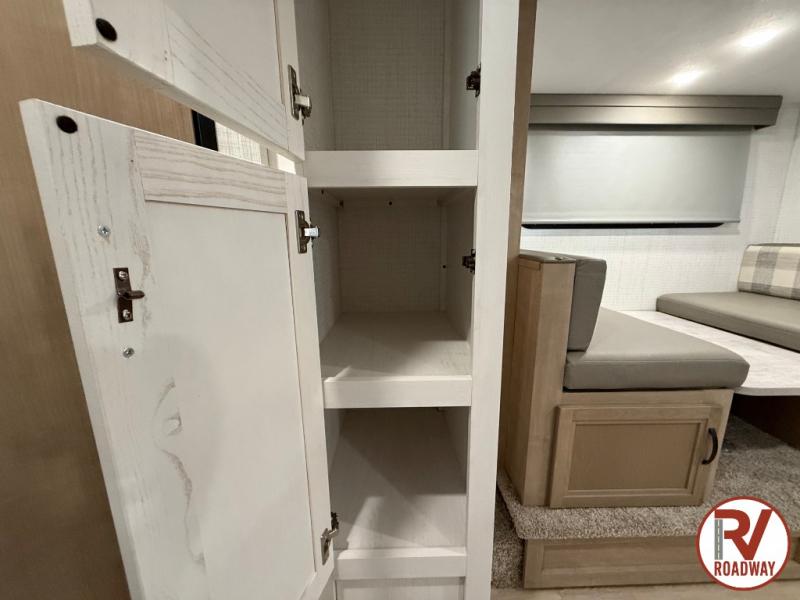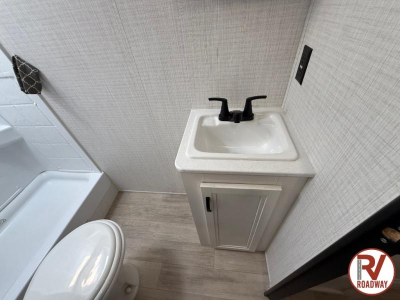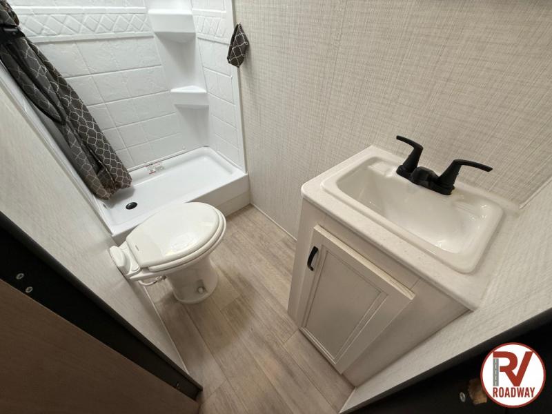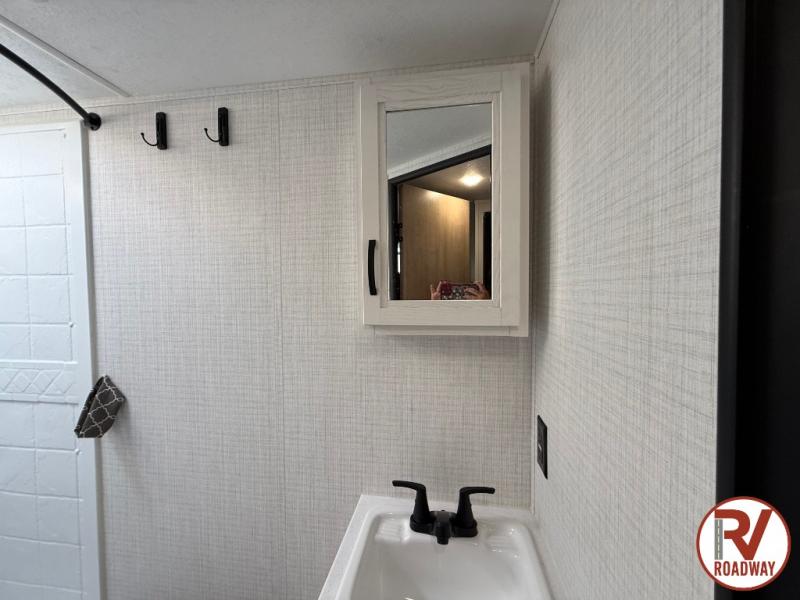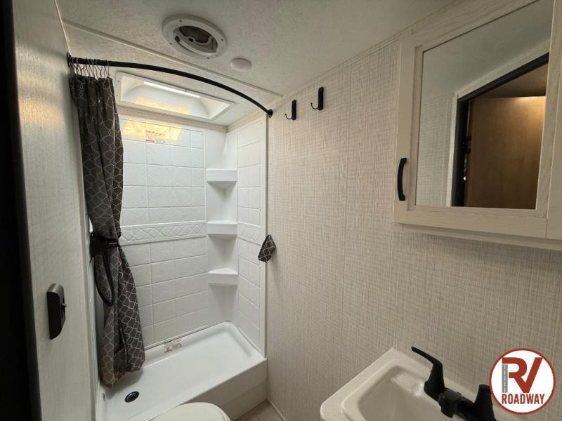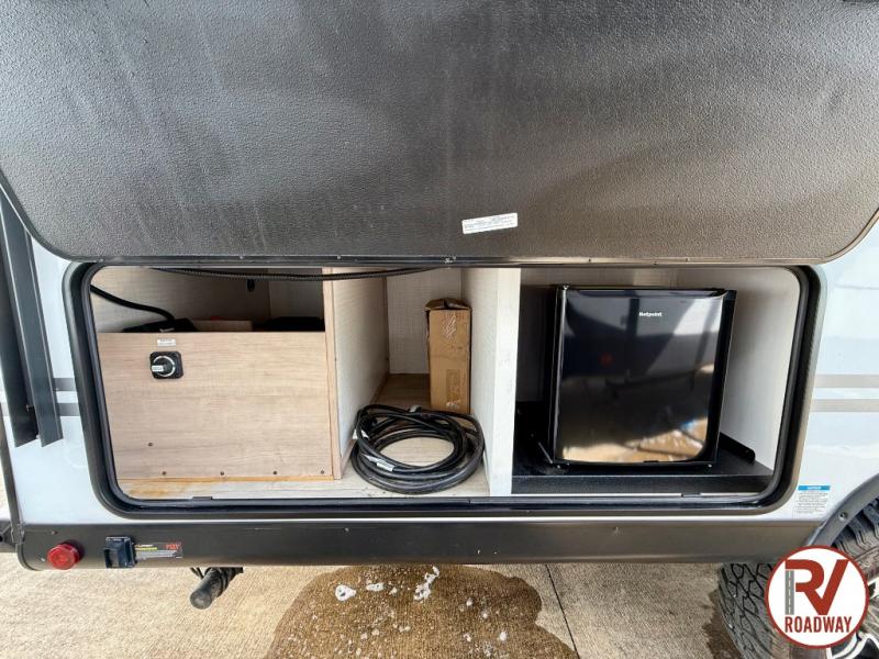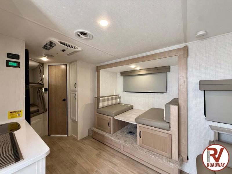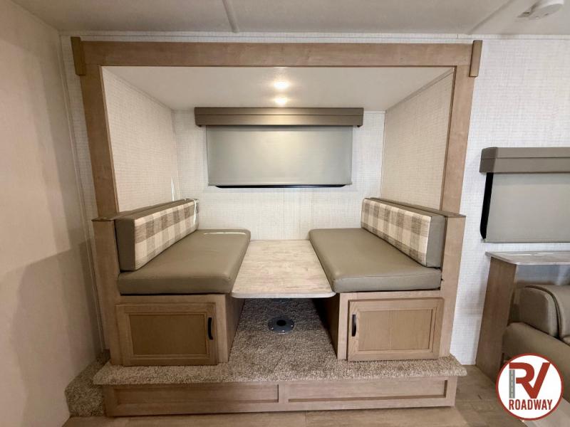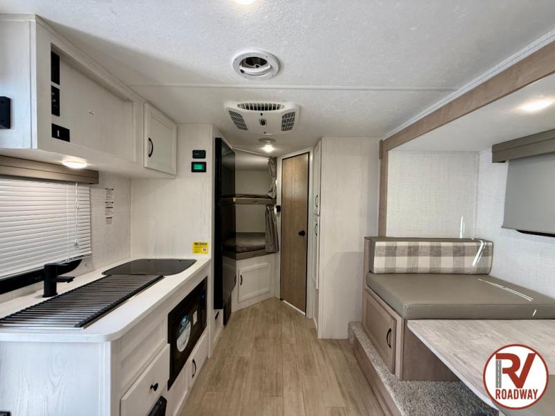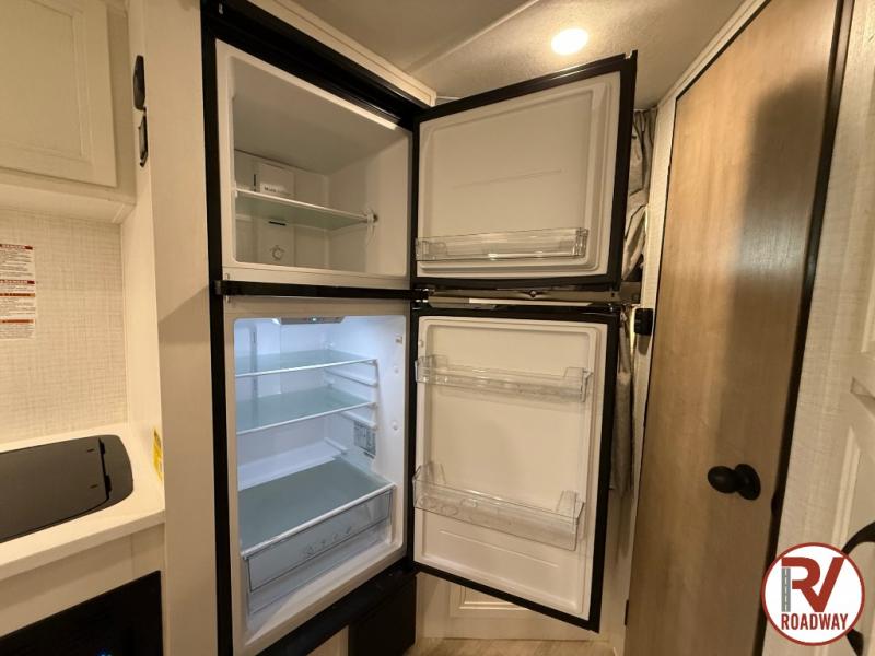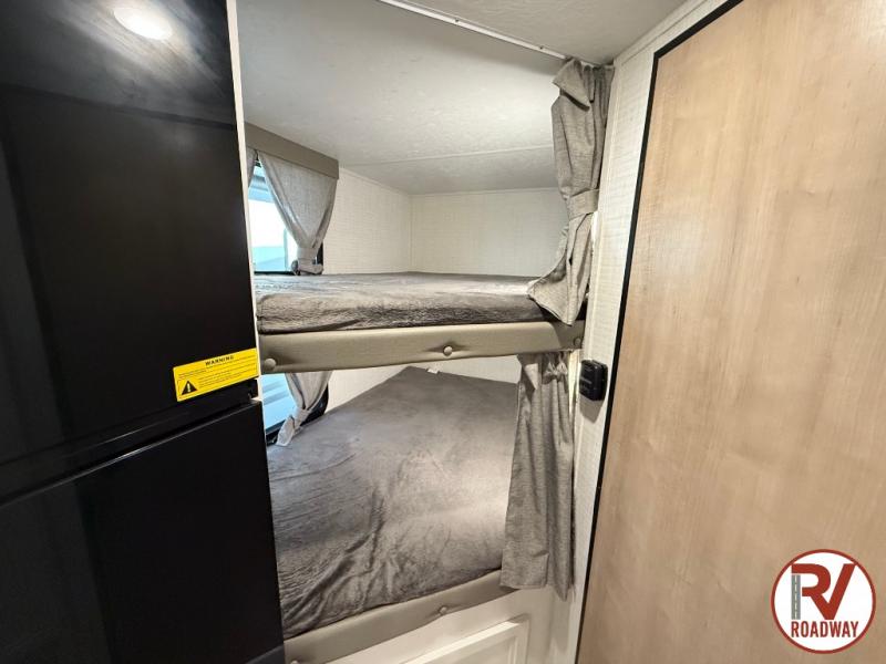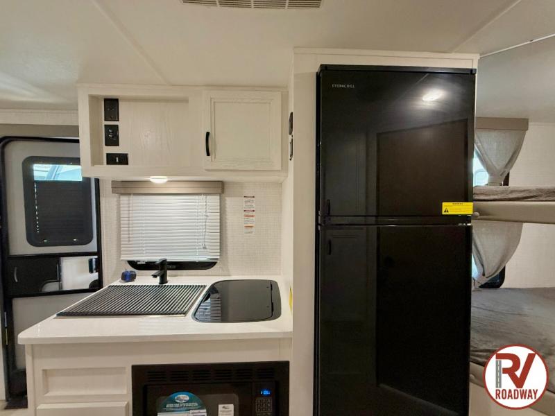 This is the perfect lightweight travel trailer that can sleep seven with the added double-size bunks. While the little ones or your guests sleep here, you will enjoy the front queen-size Murphy bed each night. In the morning, just fold up the bed to relax on the sofa and enjoy more floor space. There is also a booth dinette slide out where you can dine each day, or you can head outdoors to sit under the 17' awning. A two burner cooktop and convection microwave oven will let you prepare meals each day, and the refrigerator will keep your cold items fresh. There is even an outdoor refrigerator so you can keep cold drinks stocked!