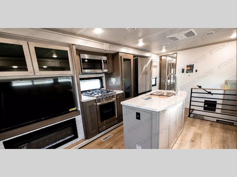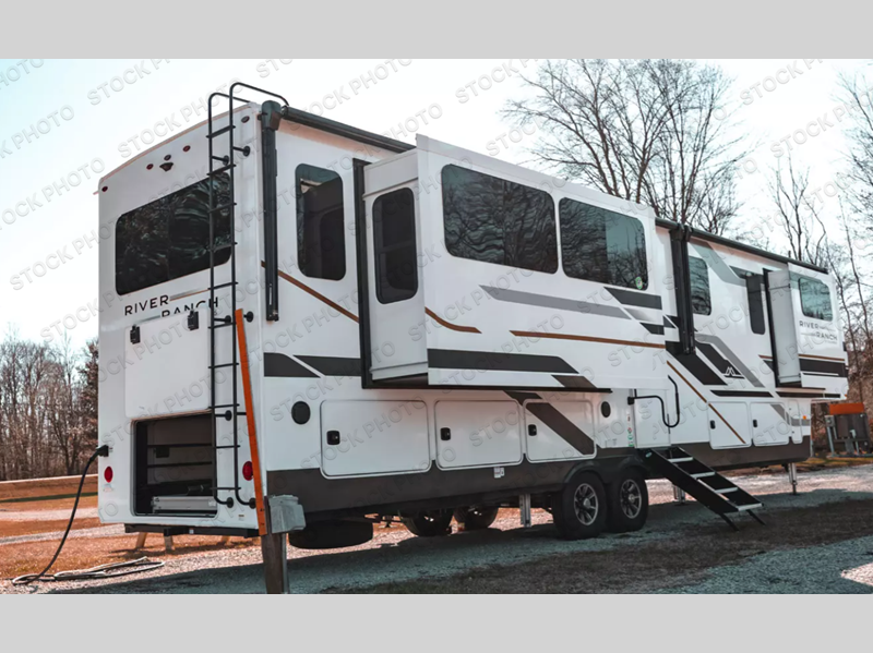This is the biggest fifth wheel in the River Ranch lineup with four slide outs and an 42' 7" exterior length. Your crew can relax in the rear living area on the 88" split tri-fold sofa or 65" theater seat across from the fireplace and 50" TV. There is also a free-standing table with chairs where you can dine at, plus a kitchen island for more counter space in the kitchen. There is a spacious full bath where you can freshen up each day, and the front private bedroom will provide you with your own space in the evenings. Here, you'll find a king bed and wardrobe slide, a full-length closet, and washer/dryer prep with a removable shelf for more storage space. There is even a 32" pop-up TV in the bedroom for late night movies in bed!