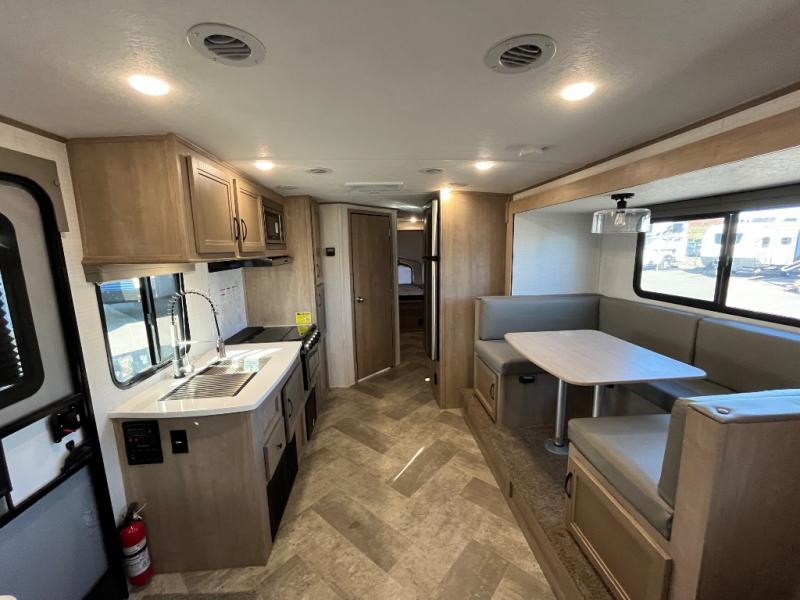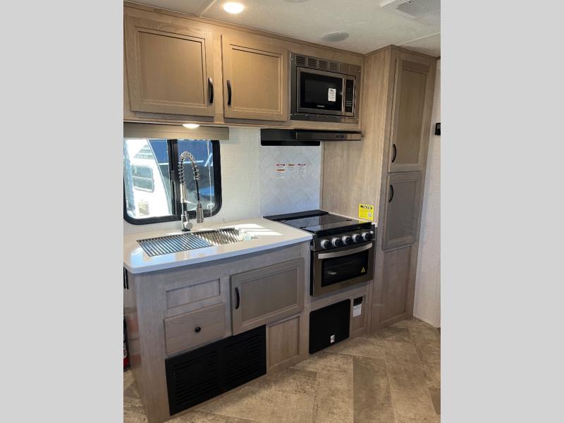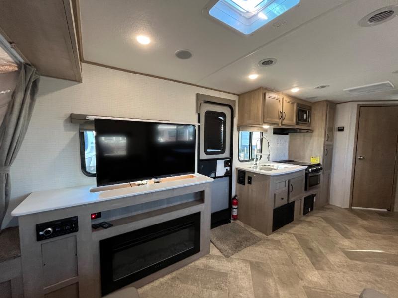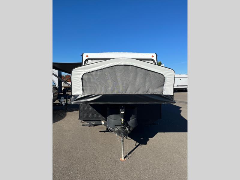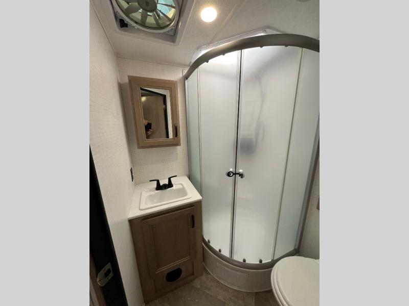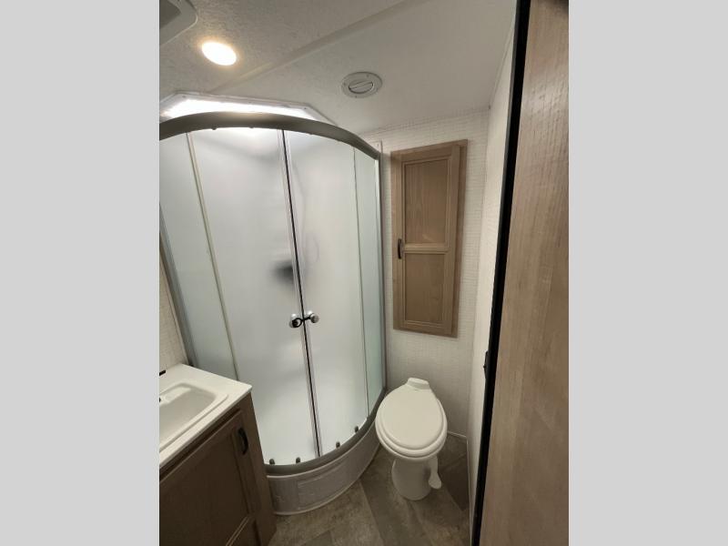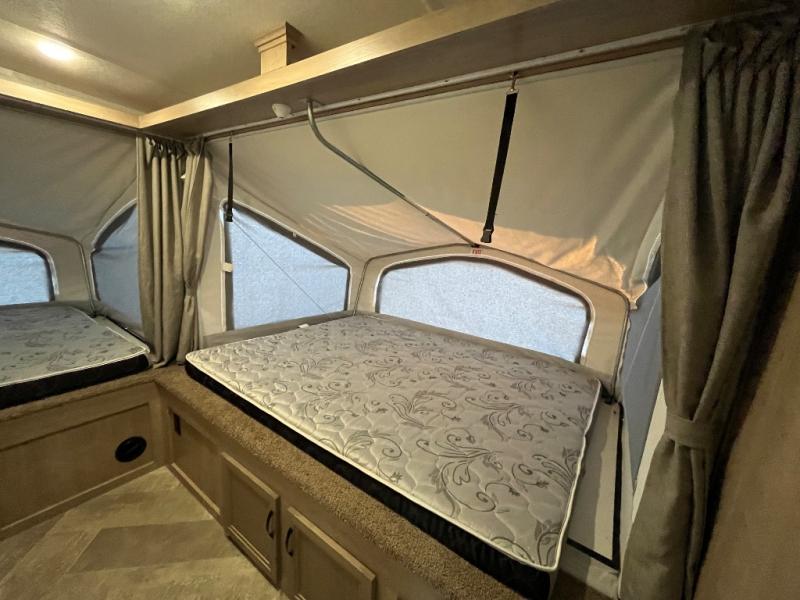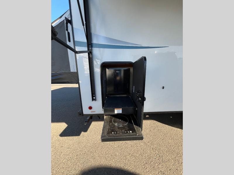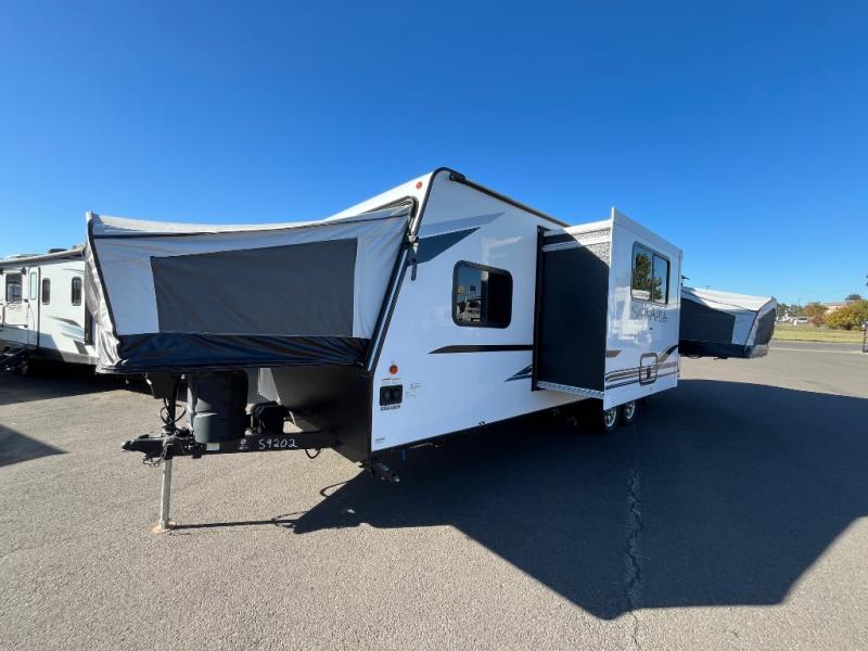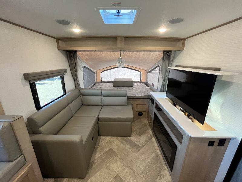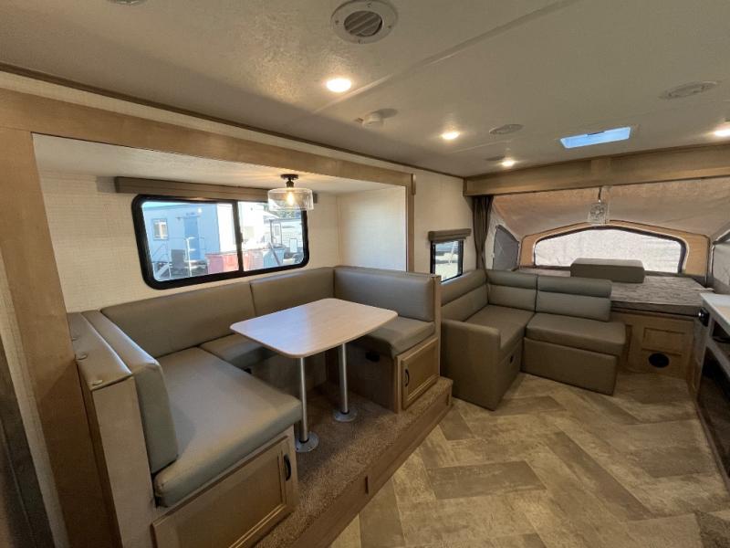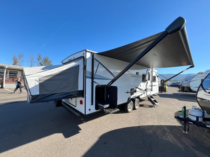 This is the largest hybrid expandable in the SolAire line up for those who are needing a little more space. There are two queen tent end beds, a queen tent side bed, plus a booth dinette slide and an L-shaped sofa for added sleeping space. You might even like to trade out the sofa for the optional theater seating across from the entertainment center. This model includes plenty of storage space, including overhead compartments, a kitchen pantry, plus a wardrobe to keep your clothes wrinkle-free.