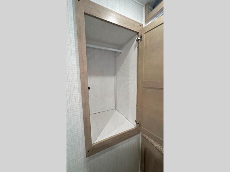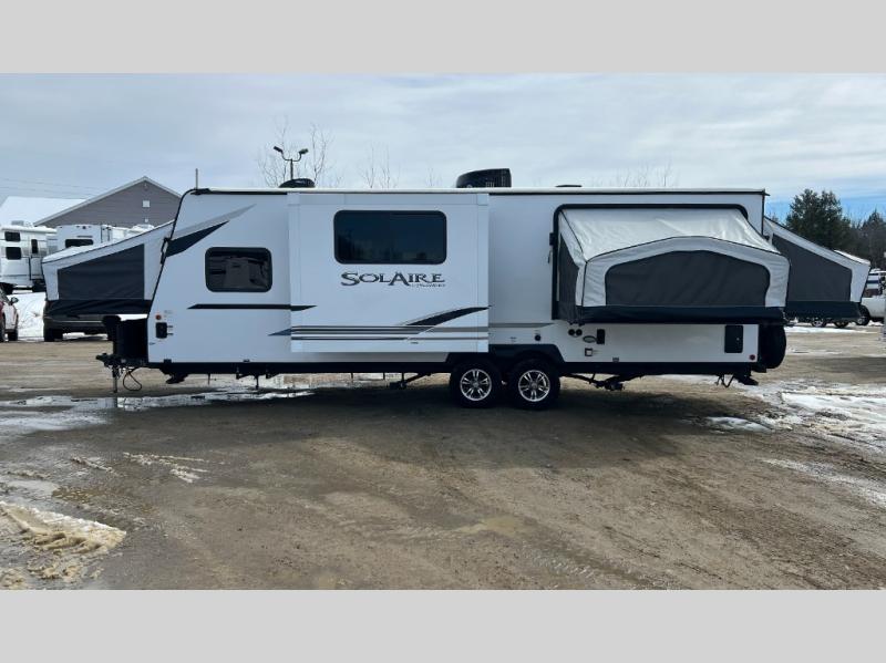 This is the largest hybrid expandable in the SolAire line up for those who are needing a little more space. There are two queen tent end beds, a queen tent side bed, plus a booth dinette slide and an L-shaped sofa for added sleeping space. You might even like to trade out the sofa for the optional theater seating across from the entertainment center. This model includes plenty of storage space, including overhead compartments, a kitchen pantry, plus a wardrobe to keep your clothes wrinkle-free.