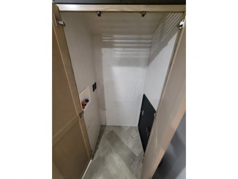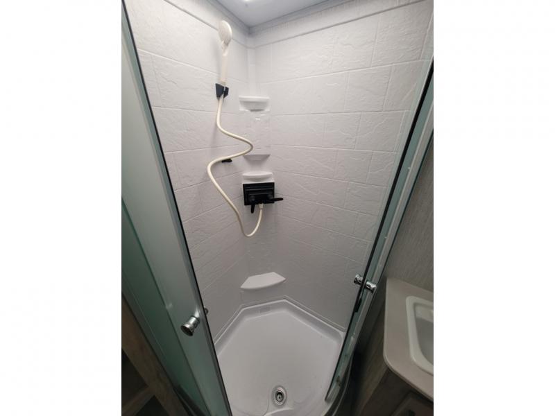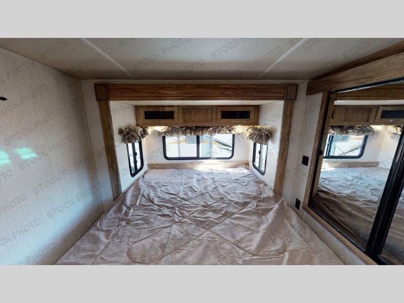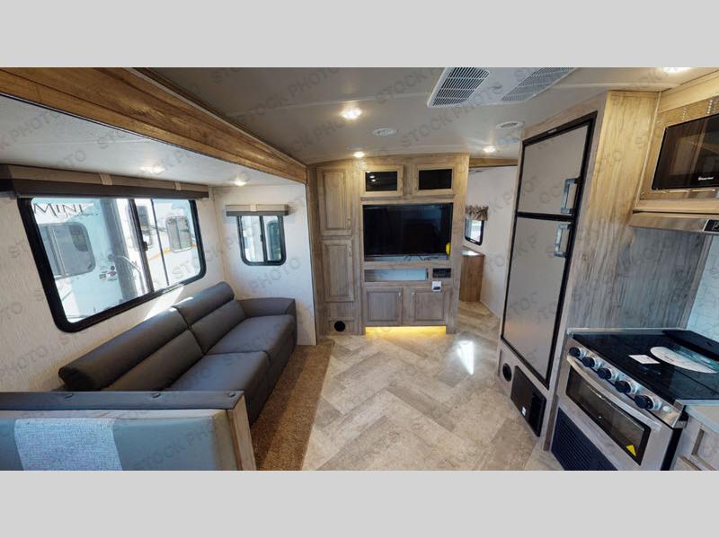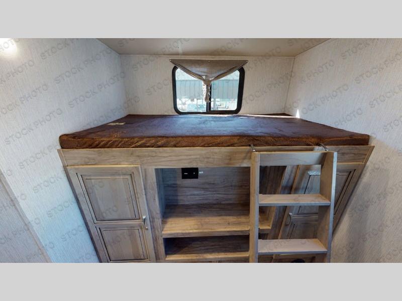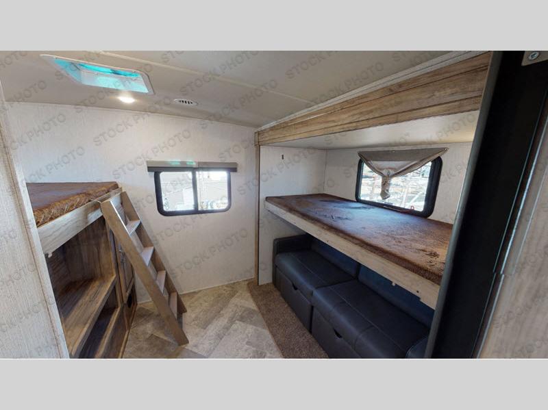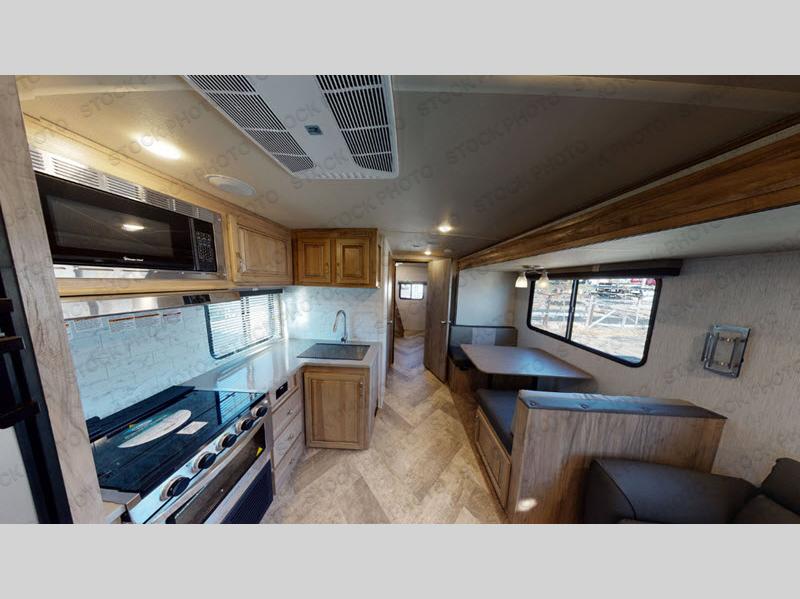 This travel trailer offers so many features that you will love from having a private bunkhouse to be able to offer private space for overnight guests to having three slide outs giving you a spacious interior throughout! The bunkhouse includes two bunks, a sofa sleeper with dual ottomans and an entertainment center. The full bathroom is centrally located for all to access from the main living and kitchen area where you will find a slide out that includes a booth dinette and a sofa sleeper or choose the theater seating option. The cook will love the kitchen amenities such as the microwave, the glass top flush mount range, the 11 cu. ft. refrigerator, and the L-shaped counter for preparing and serving meals. And they have the choice of making meals using the outside kitchen.