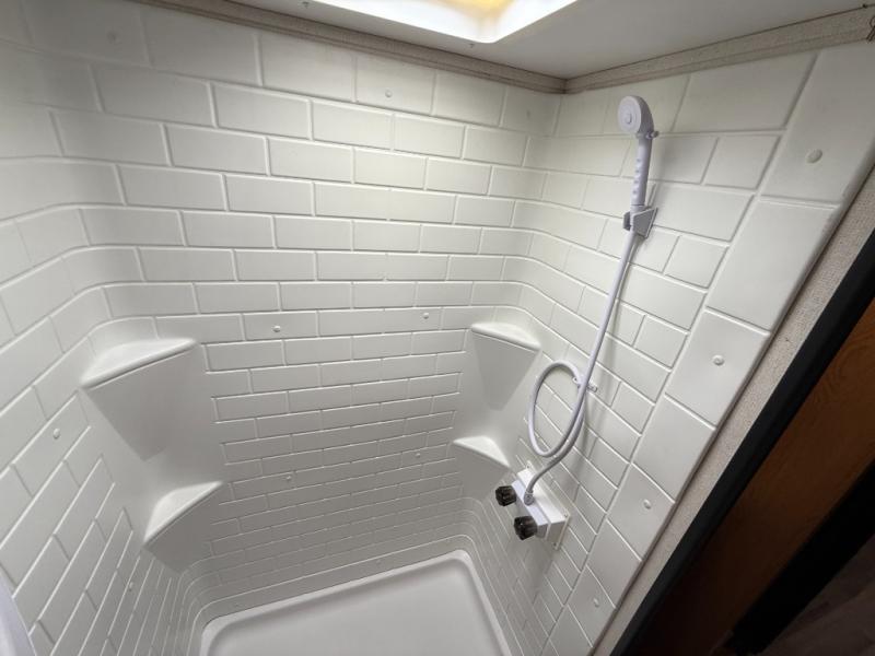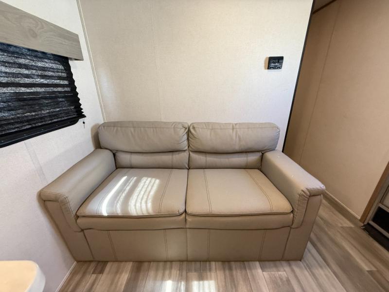 The cook is going to enjoy having choices for every meal, whether to use the full kitchen amenities inside or the outdoor kitchen while visiting with others relaxing under the 13' power awning. With the inclusion of a walk-around queen bed in the front bedroom, plus the sofa and booth dinette in the combined kitchen and living area, and the double-size bunks next to the bathroom sink and private toilet and toilet room, there is plenty of room to sleep eight or nine people each night. And the power awnings plus outdoor speakers give you an additional living area for everyone.
