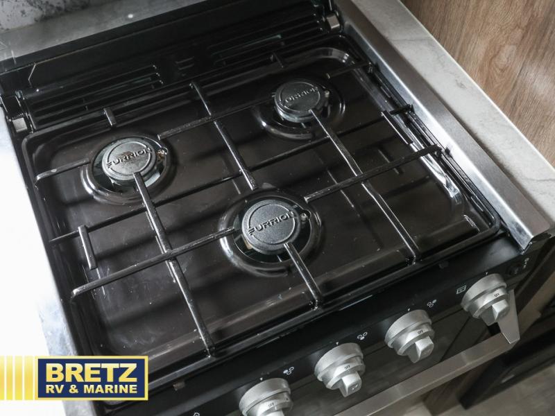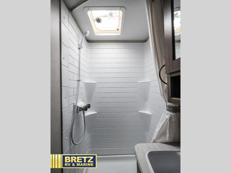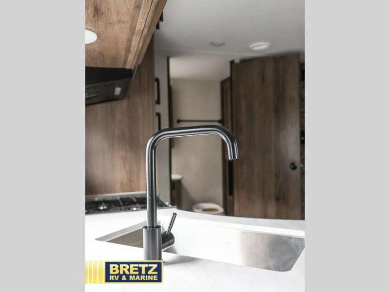 The cook is going to enjoy having choices for every meal, whether to use the full kitchen amenities inside or the outdoor kitchen while visiting with others relaxing under the 13' power awning. With the inclusion of a walk-around queen bed in the front bedroom, plus the sofa and booth dinette in the combined kitchen and living area, and the double-size bunks next to the bathroom sink and private toilet and toilet room, there is plenty of room to sleep eight or nine people each night. And the power awnings plus outdoor speakers give you an additional living area for everyone.
