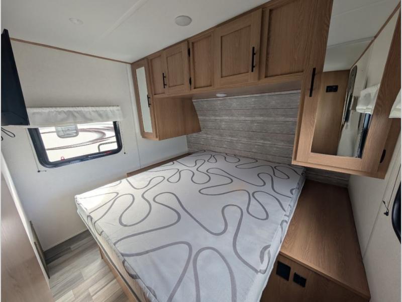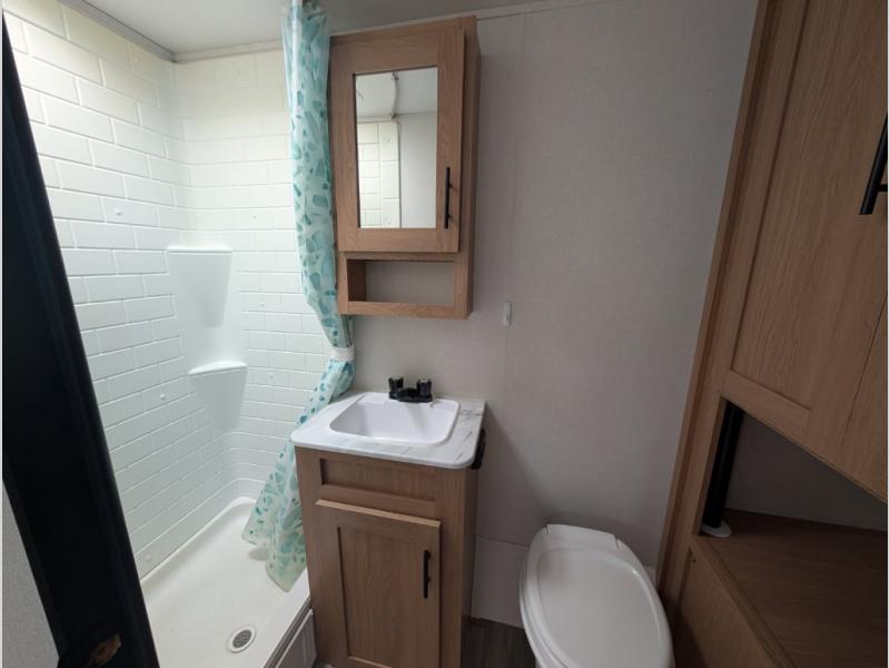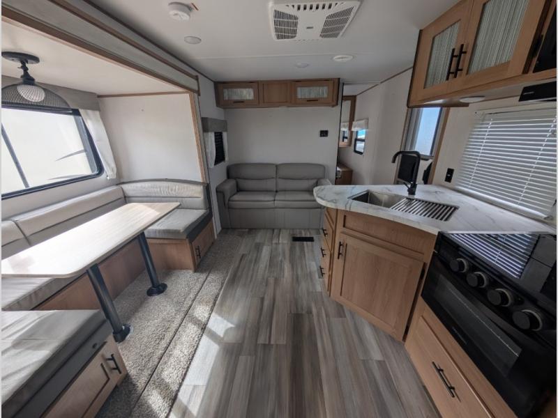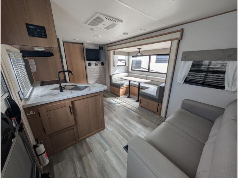 This rear bath travel trailer offers privacy to change and get cleaned up as well as includes linen storage so you will have everything you need in one place. The walk-around queen bed in the private bedroom, plus the furniture which folds down into extra sleeping space at night allows five or six to sleep comfortably after hiking or relaxing and enjoying the outdoors. The cook will appreciate the three-burner range to make snacks and meals to eat at the U-shaped dinette slide or outside under the 15' power awning that creates a covered outdoor living area protected from the elements.