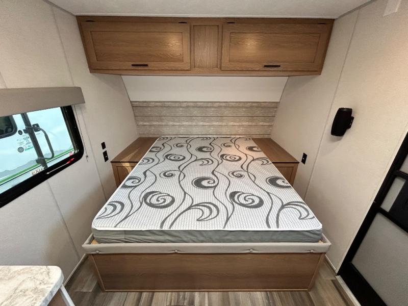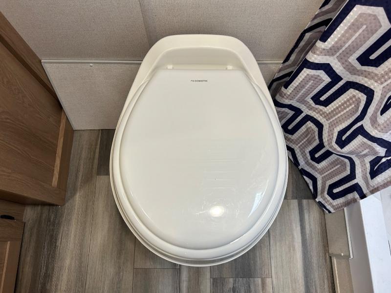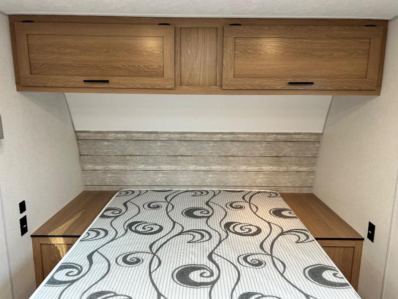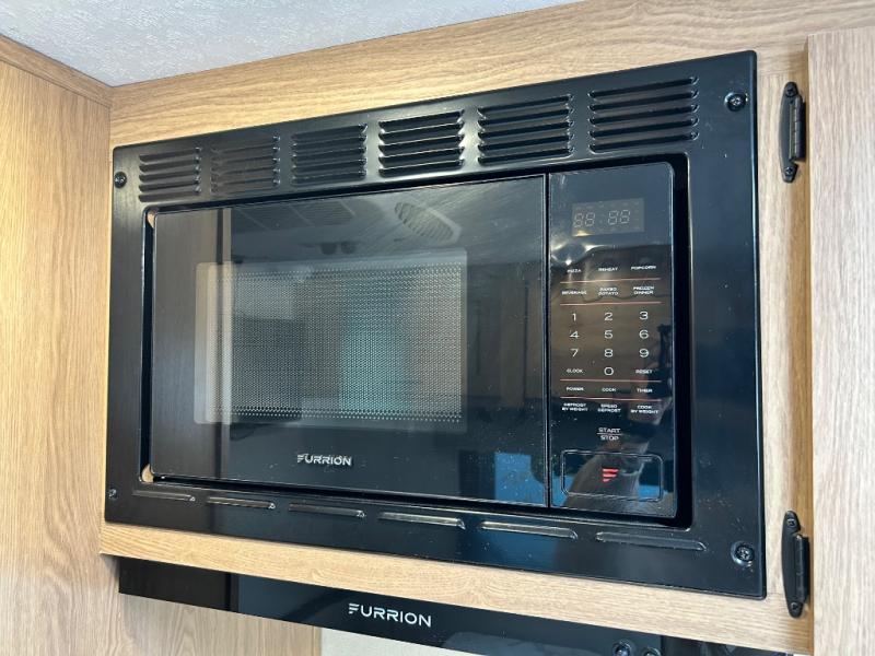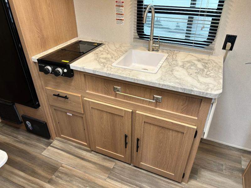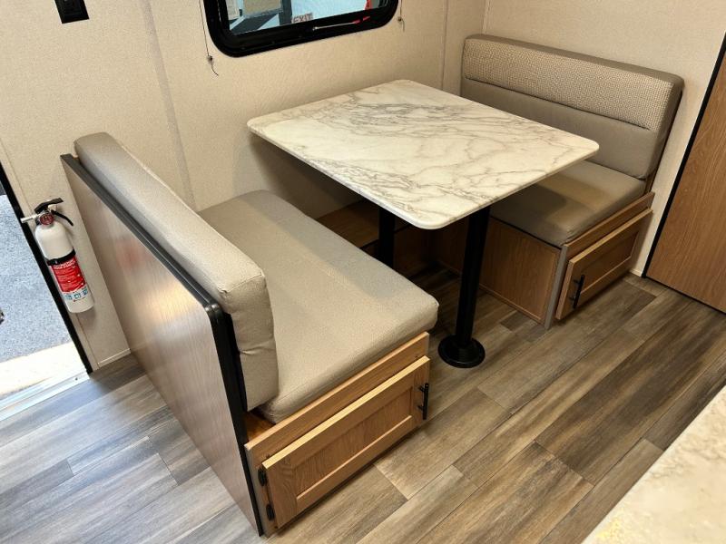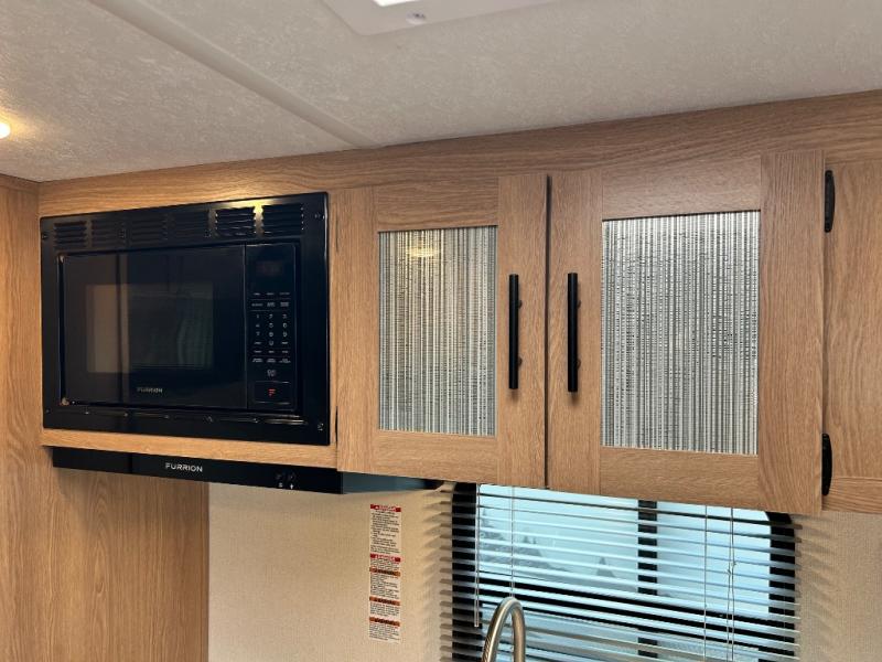 You'll love spending time outdoors with the LED-lit power awning and outside speakers as you sit under the awning or around the fire pit with your loved ones. When you get tired from your day of hiking, relax on the front bed with dual wardrobes and overhead cabinets to hold your clothing and such. And you'll appreciate the extra lighting from the kitchen skylight as you cook with the two-burner cooktop or microwave.