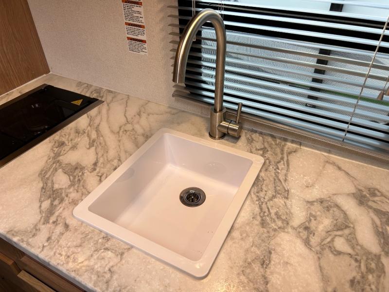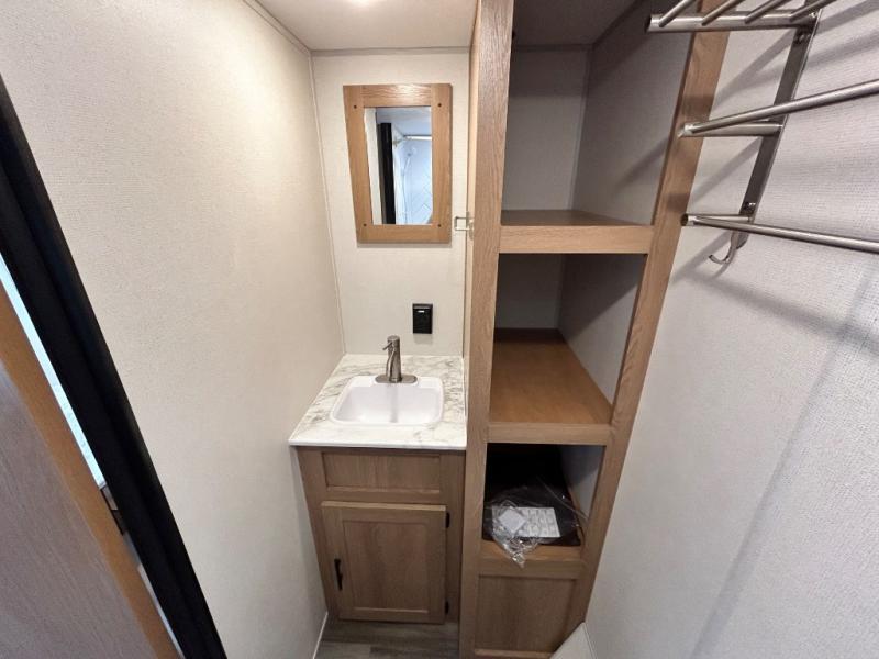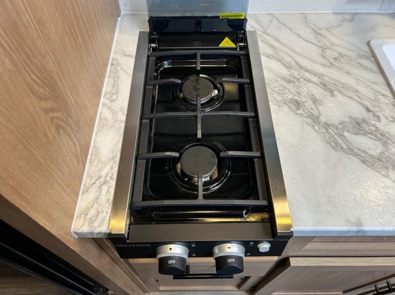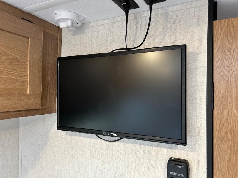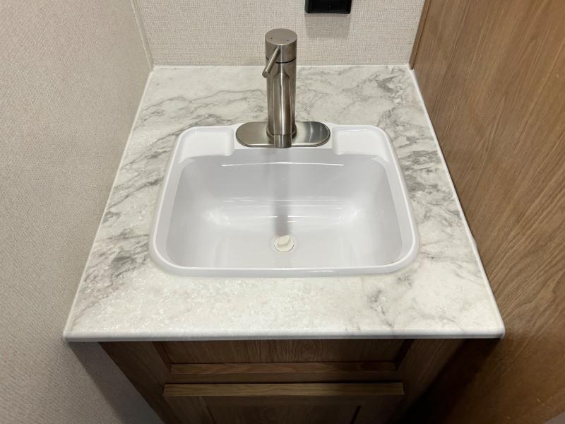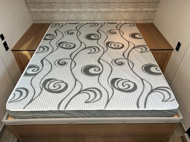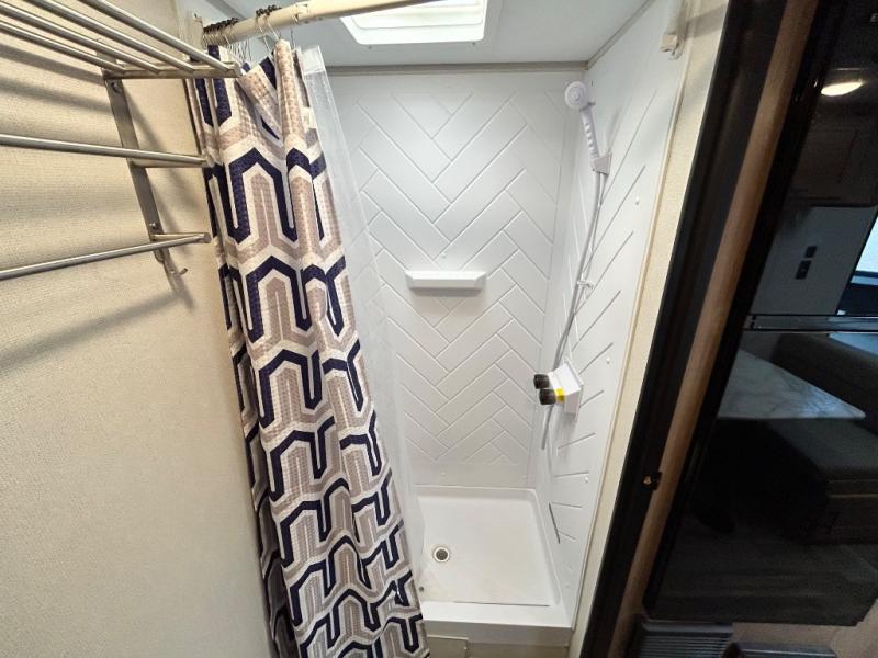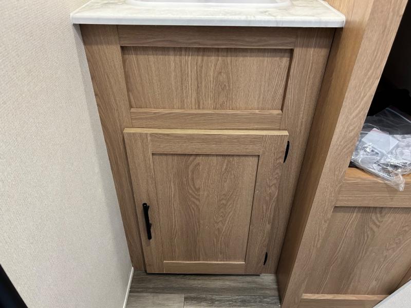 You'll love spending time outdoors with the LED-lit power awning and outside speakers as you sit under the awning or around the fire pit with your loved ones. When you get tired from your day of hiking, relax on the front bed with dual wardrobes and overhead cabinets to hold your clothing and such. And you'll appreciate the extra lighting from the kitchen skylight as you cook with the two-burner cooktop or microwave.