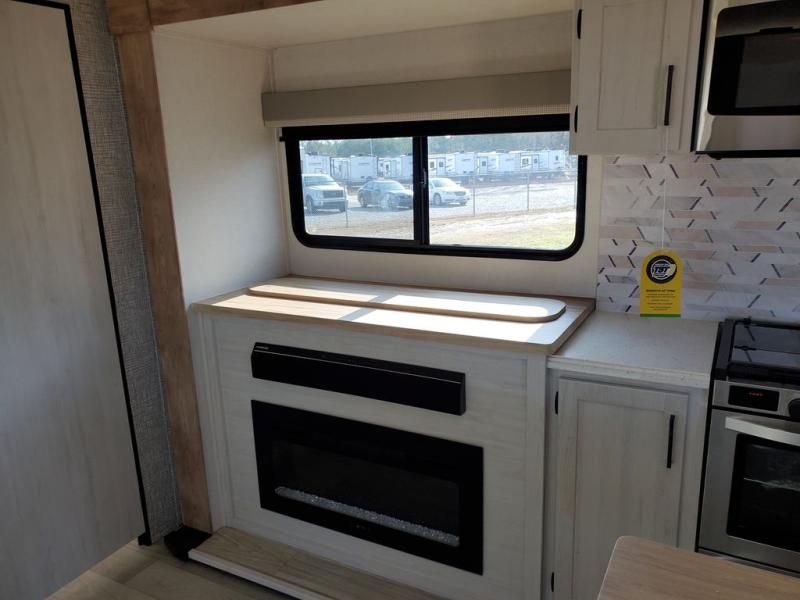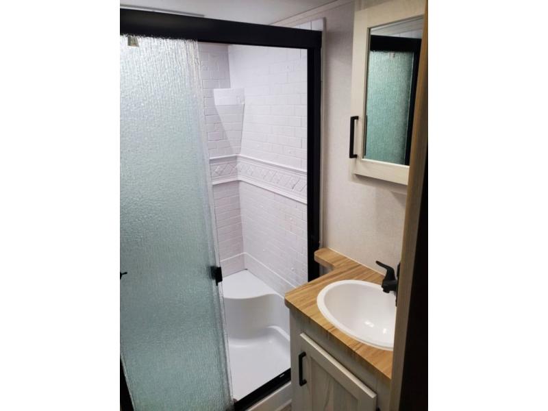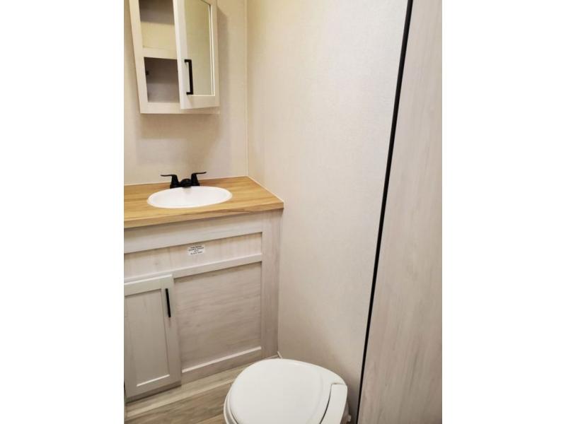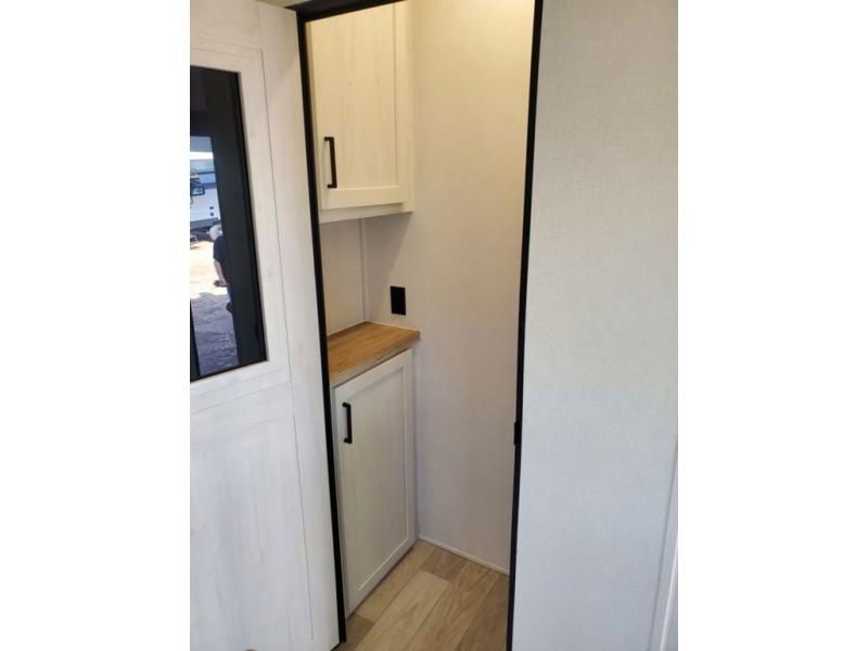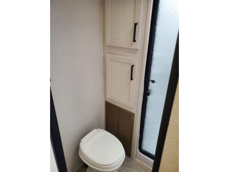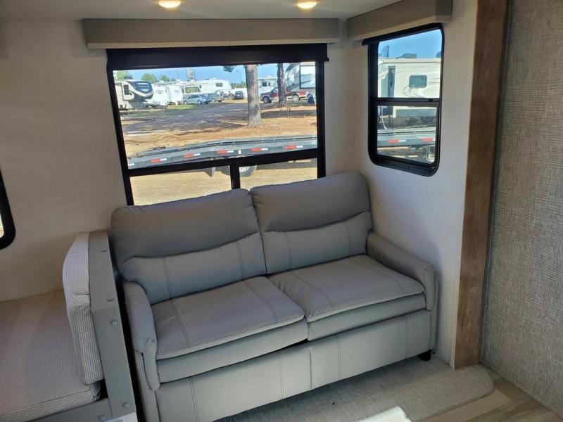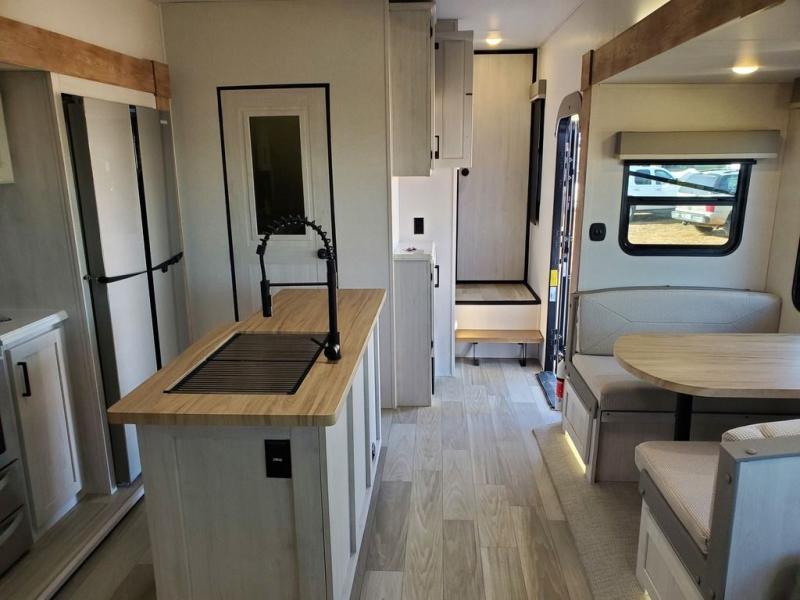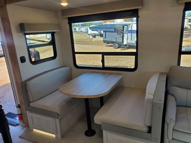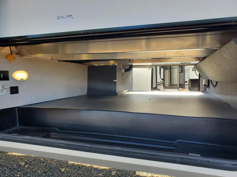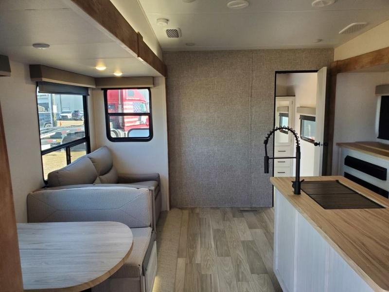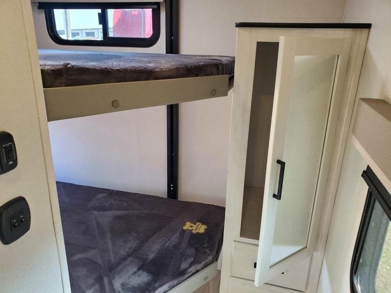 A great family fifth wheel with plenty of space for everyone! The kids or extra guests will enjoy the rear private bunkhouse with 74" x 55" Happi-Jac bunk beds, plus a half bath for convenience, and a closet with drawers and hanging storage. The main combined living and dining space features dual opposing slides for added space to move about. There is a a set of theater seats and a booth dinette for dining, or you can choose the optional free standing table and chairs. A kitchen island offers added prep space when making meals, as well as added storage in cabinets below. A 16 cu. ft. refrigerator, walk-in pantry, plus three burner cooktop and oven with overhead 30" microwave will allow you to make meals just like at home. There is an entry hutch for added storage with upper and lower cabinets plus a little counter space to drop keys or add photo frames, books, etc. The bathroom features a large shower with seat, vanity with sink and overhead medicine cabinet, plus line storage for towels and toiletries. The front private bedroom takes you away from the hustle and bustle of the main living area for a great night's rest and you will enjoy the added space thanks to the wardrobe that slides out featuring drawers below upper hanging storage with mirrored doors. There is additional storage in upper cabinets above the bed as well as on each side with bedside reading lights, nightstands, and more.