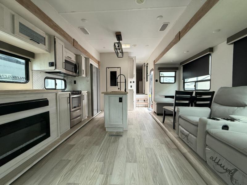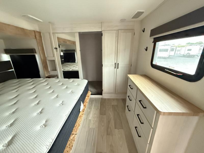 From the front private bedroom with a king bed slide out to the rear living area with theater seating and a fireplace, you'll love every minute spent in this fifth wheel. The dual opposing slides in the main living area provide tons of space to stretch out, and the kitchen island here will tie the whole room together. Your crew can spend the evenings watching a movie on the large LED TV, or head outdoors to relax under the 15' electric awning with LED lights. The full bath features a shower with a seat and glass doors, plus a Deluxe Skyview skylight for added natural lighting. You won't have to worry about sacrificing storage space thanks to the bedroom wardrobe with mirrored doors, the kitchen walk-in pantry, plus the exterior pass-through storage!