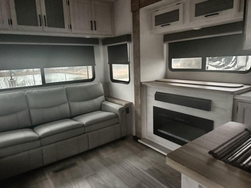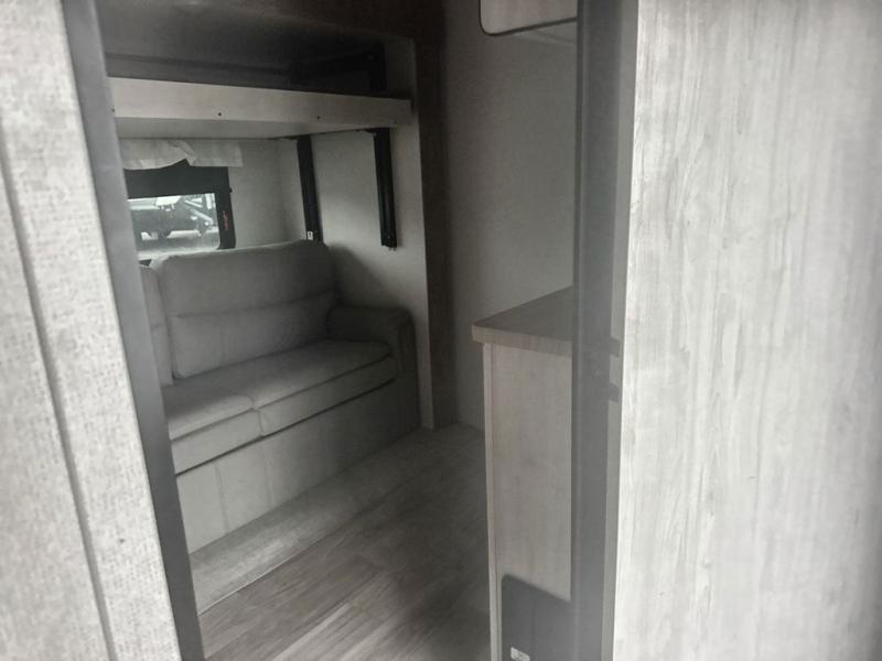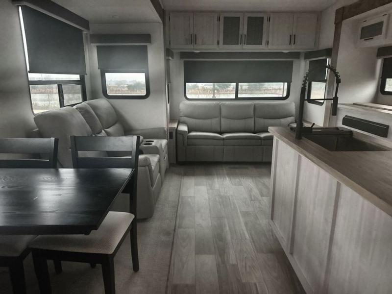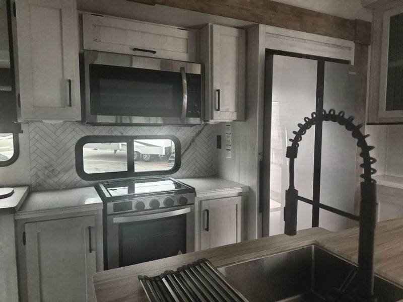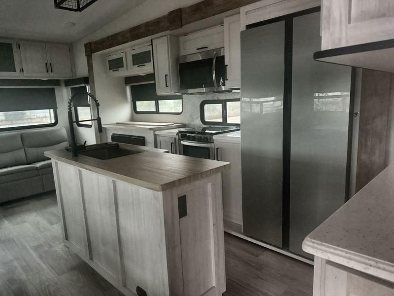This fifth wheel is one your whole crew will love thanks to the middle bunkroom with a "Sleep & Play" sofa and an upper bunk! You will enjoy the front private bedroom all to yourselves with a king bed slide out, a large closet with washer and dryer prep, plus a dresser for more storage. When you're not outdoors relaxing under the 19' electric awning with LED lights, head to the rear living area to sit back on the theater seating or the hide-a-bed sofa. You'll also find an LED TV here and a booth dinette for game night. The chef will love the outside kitchen just as much as the indoor kitchen with a butcher block top, two pantries, plus a 30" residential style microwave!