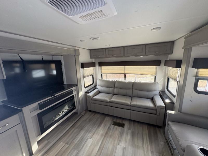 Looking to relax in the great outdoors, fish the pond, or hike the trails? You can do all of that and stay overnight when you have this trailer at the campsite! The front bedroom offers a queen bed with storage on each side, a second entry into the full bathroom, and a door to close for privacy. The main living and kitchen area is spacious thanks to the two opposing slides, and the rear sofa as well as the theater seats offer a coziness to the fireplace feature. You can eat at the booth dinette or play games while the cook makes a meal using the kitchen appliances.