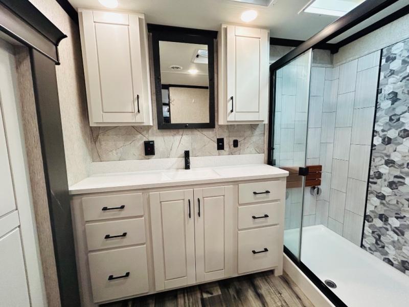 If luxury and space is what you are after, this Redwood front living six slide fifth wheel is calling your name! Yes, that's right, six slides are waiting to provide you with a spacious interior while you travel. The main entry leads into a large kitchen with all of the amenities to enjoy. A dinette with buffet, a large island with sink, a pantry for your dry and canned goods, plus a 22 cu. ft. refrigerator. You will also enjoy cooking on the provided 4-burner range with 3.7 cu. ft. oven and convection microwave overhead. There is ample counter space for food prep, plus a bar top counter just before you head up to the front living area as well. This living space features two of the six slides with each housing a sleeper sofa. There is also theater seating for two and an entertainment center with 65" TV for your viewing pleasure. Back through the kitchen, head up a step to the master suite with king bed slide, and large dresser/40" TV/wardrobe and linen slide opposite. The rear bath is not only spacious thanks to the help of the curbside slide, but you will find two medicine cabinets, a 48" shower, and a washer/dryer closet all ready if you choose that convenience, just add.