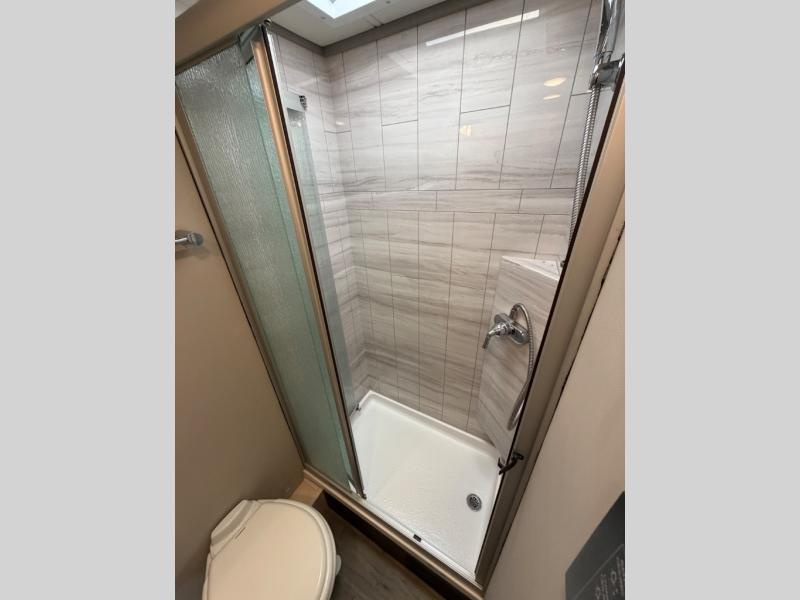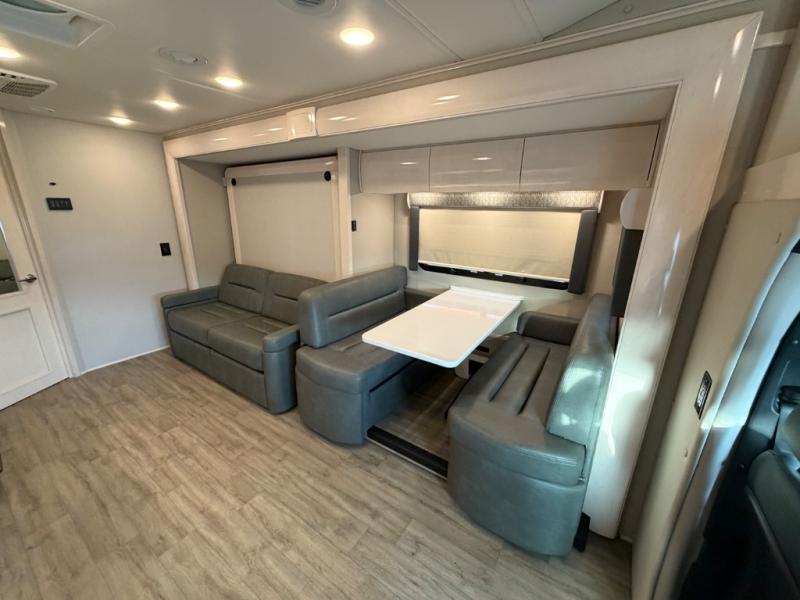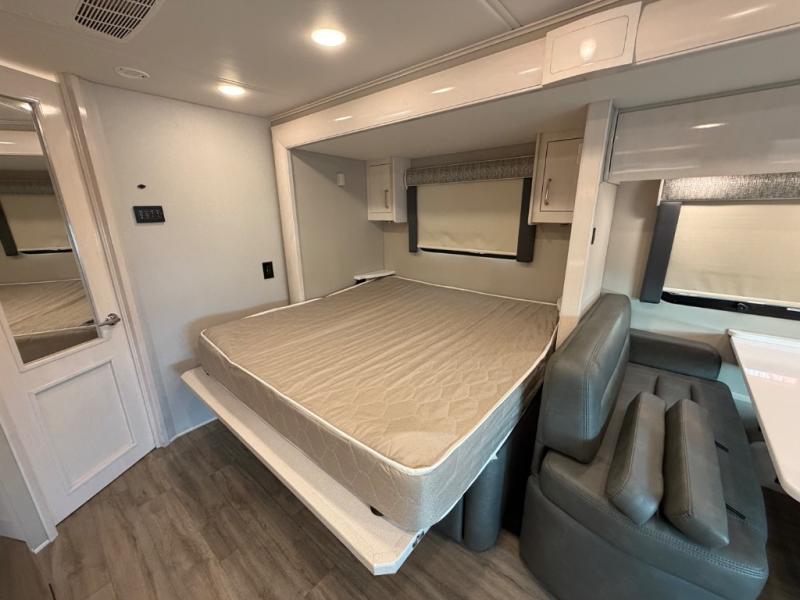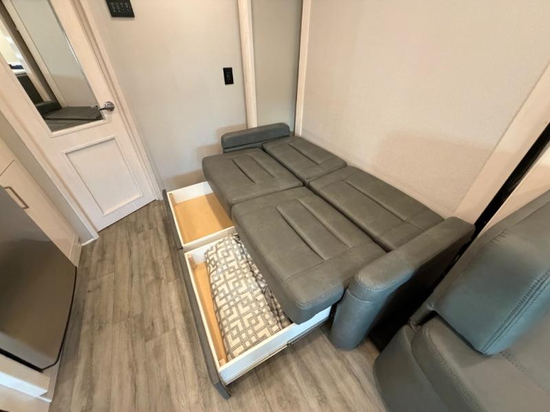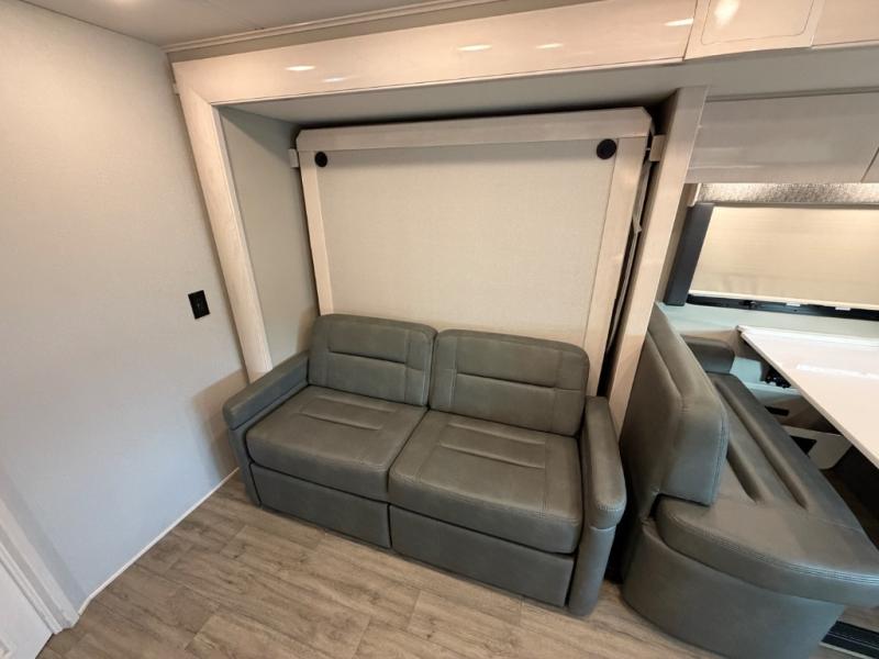 This is the perfect couples motorhome to explore the country! You will stay squeaky clean in the full rear bathroom with 24" x 36" shower, and a 22" x 50" wardrobe to store your clothes, towels, and other toiletries. Depending on what time you enter this coach will determine whether you see the sofa or the 65" x 72" Murphy bed. The kitchen has a two burner cooktop, a convection microwave, and an 8 cu. ft. refrigerator to prepare home cooked meals, and a booth dinette to enjoy them at. The 46" x 80" bunk mattress over the cab lets another member join in on the adventure and the booth dinette offers sleeping space as well.