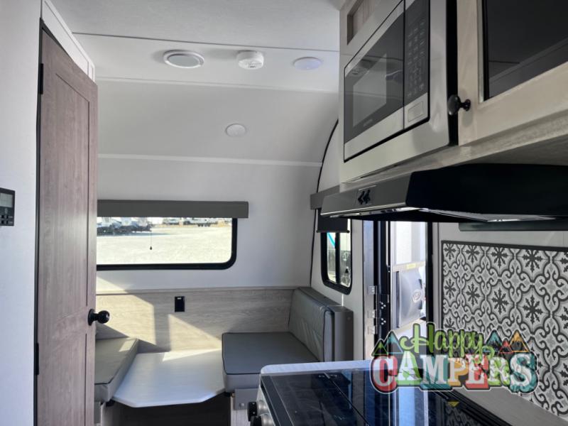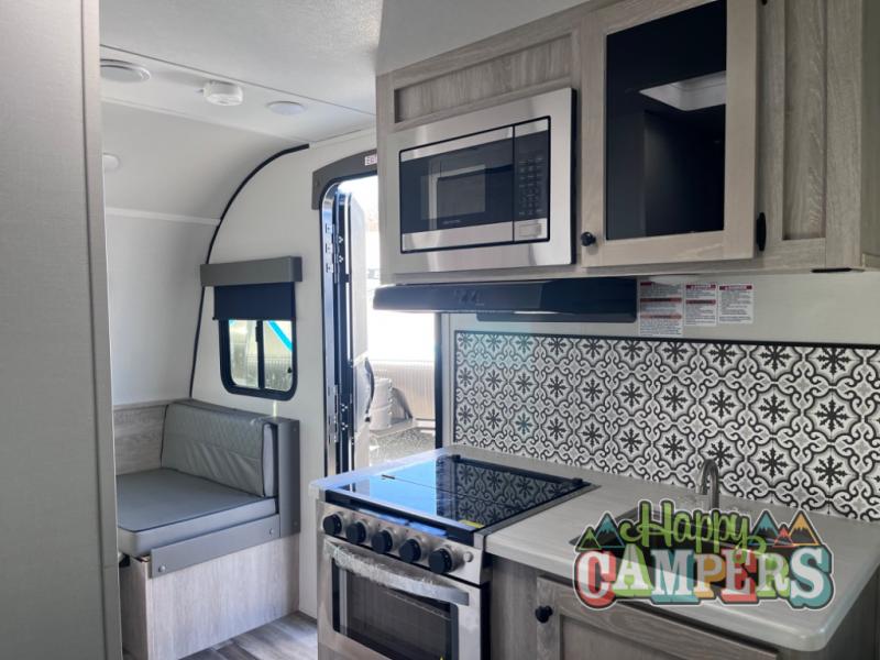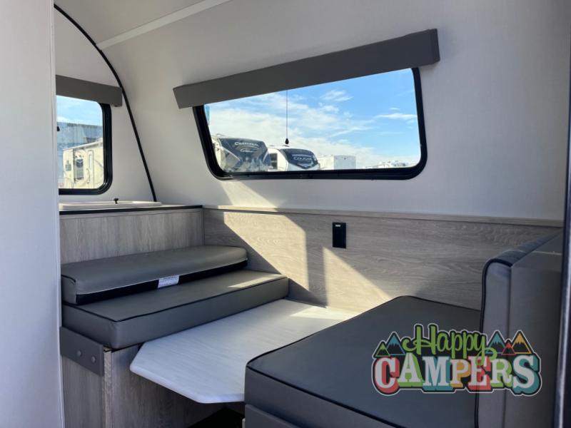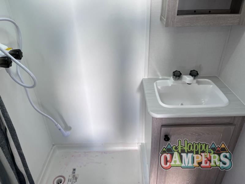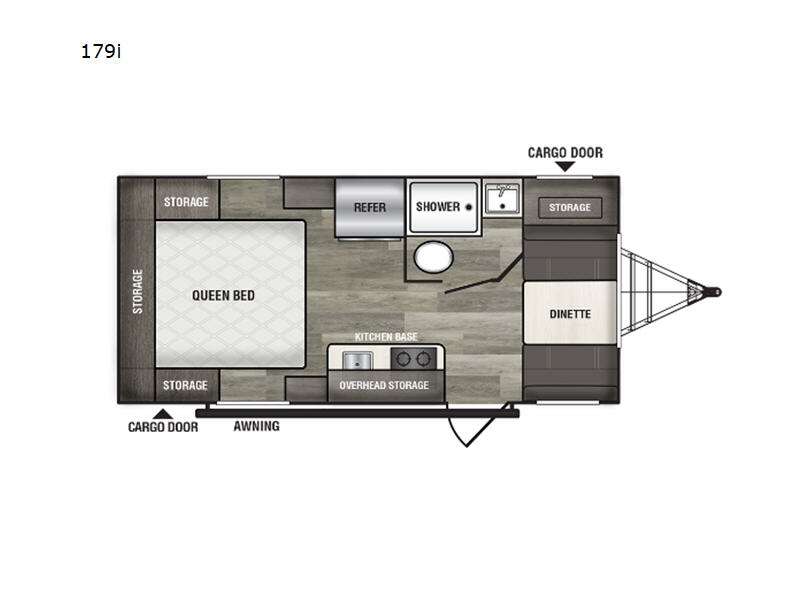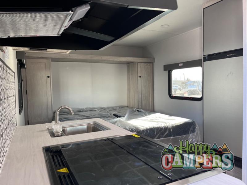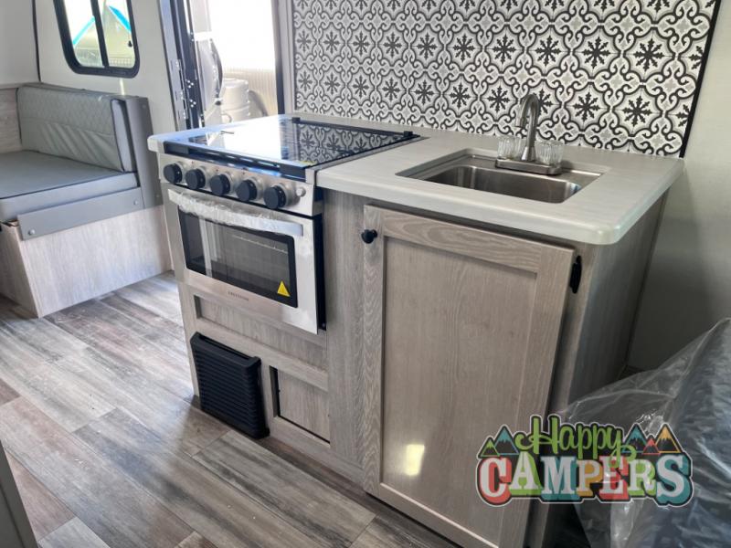Lightweight camping is found in this travel trailer for three. Once you arrive at your destination, set up the 11' patio awning and enjoy a cold drink before unpacking your bags. You will enjoy your own RV queen bed in the rear bedroom, plus space to store your belongings overhead. This model includes a full bath just like you would find at home, and the full kitchen amenities include a four burner cooktop, a refrigerator, and overhead cabinets for spices or snacks.