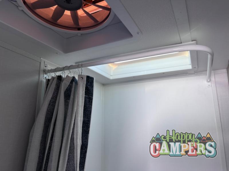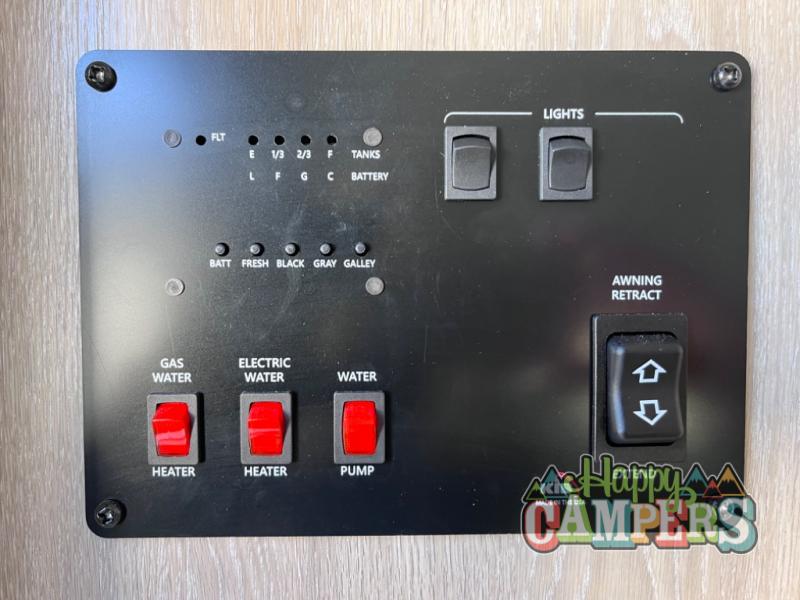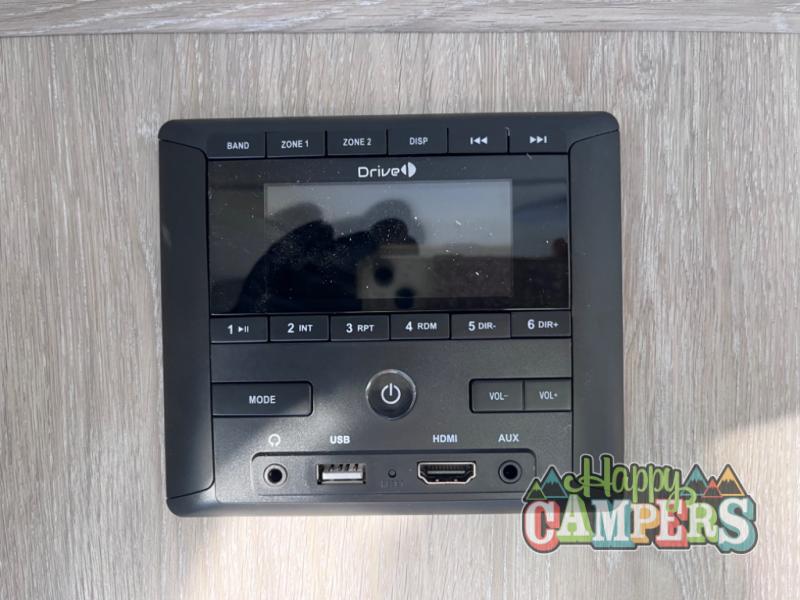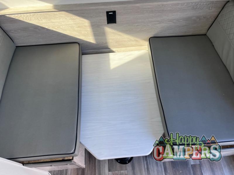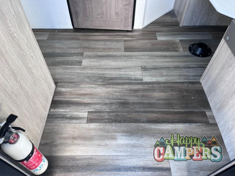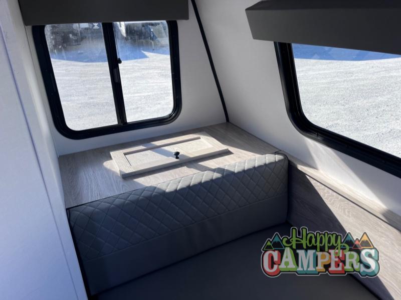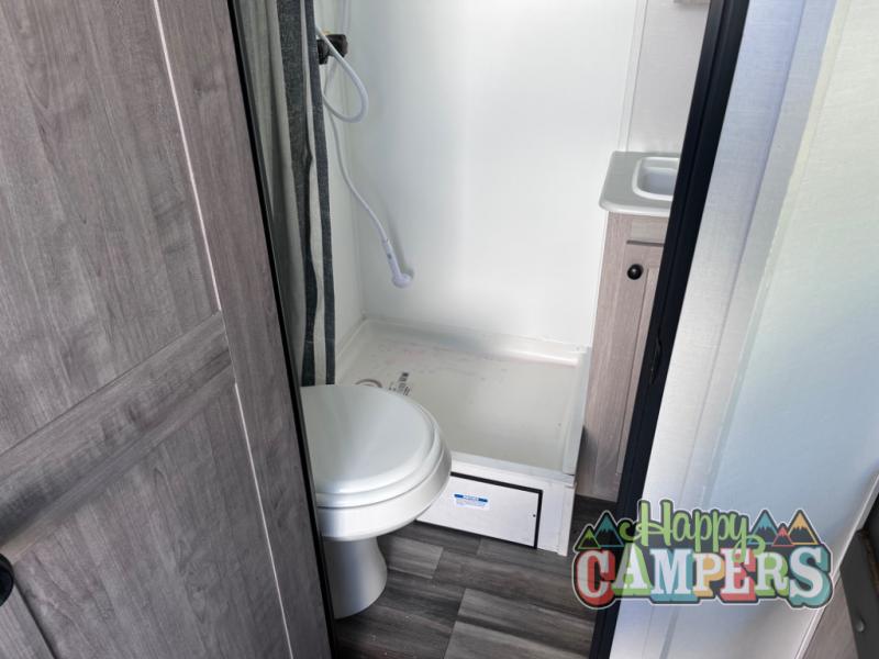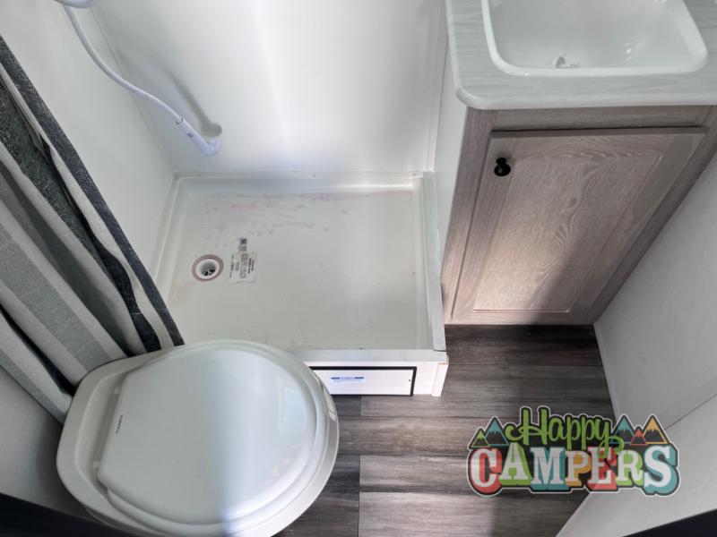 Lightweight camping is found in this travel trailer for three. Once you arrive at your destination, set up the 11' patio awning and enjoy a cold drink before unpacking your bags. You will enjoy your own RV queen bed in the rear bedroom, plus space to store your belongings overhead. This model includes a full bath just like you would find at home, and the full kitchen amenities include a four burner cooktop, a refrigerator, and overhead cabinets for spices or snacks.