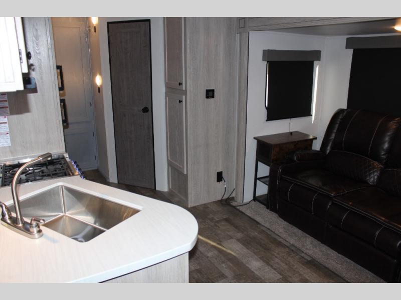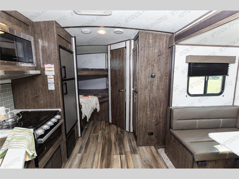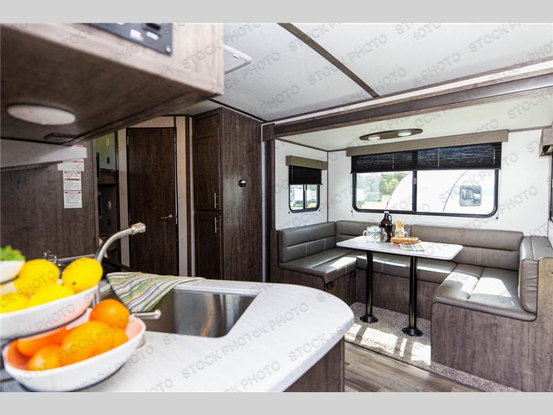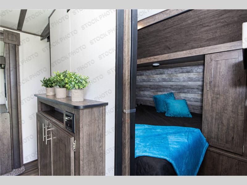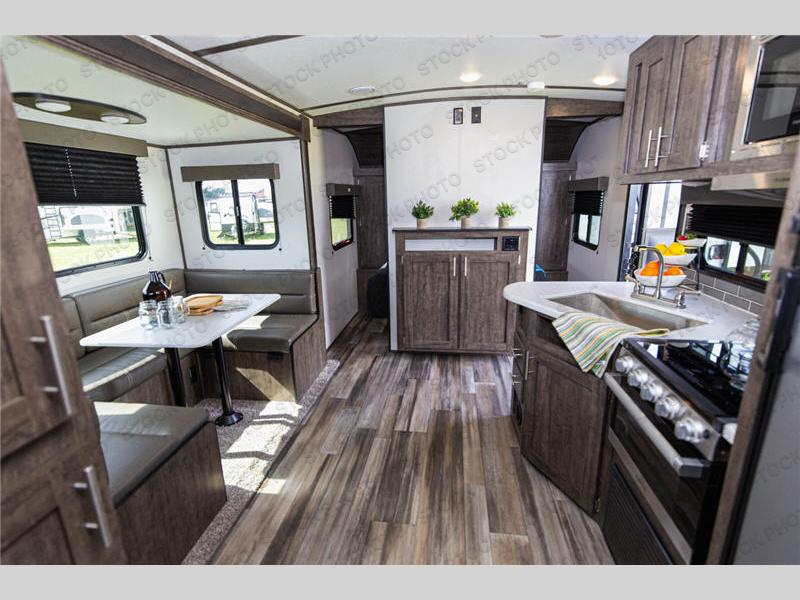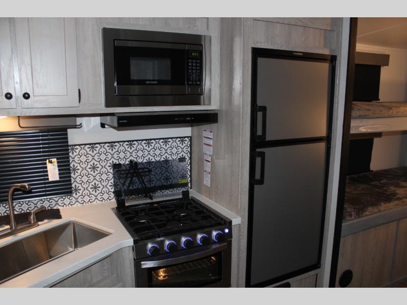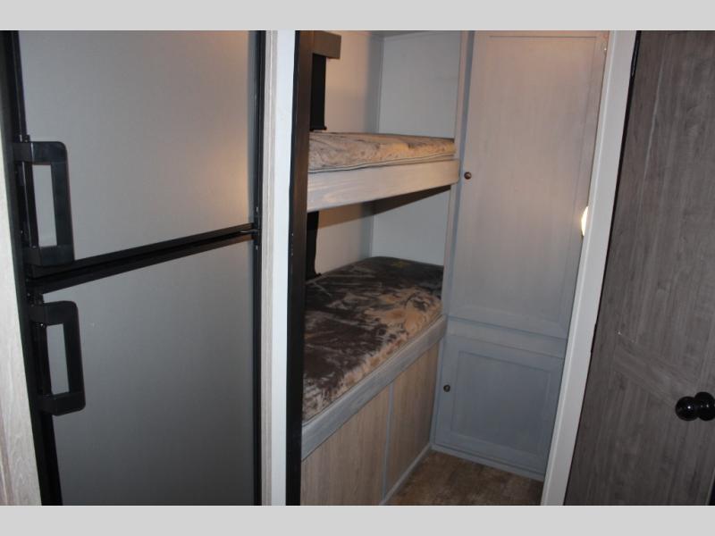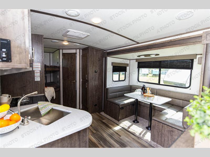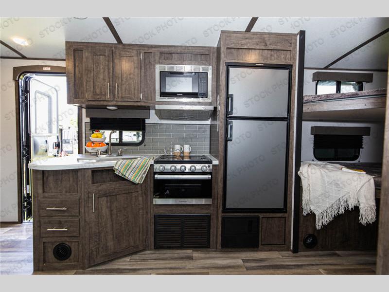 One look at this family-friendly trailer and you'll be hooked. There are double-size bunks for the kids or your guests, and an RV queen bed in the front private bedroom. Additional guests can sleep on the U-shaped dinette slide when it's not being used for dining or game night. There is a full bath on board for your convenience, and an interior kitchen the chef is sure to love. But they may love the outdoor kitchen even more!