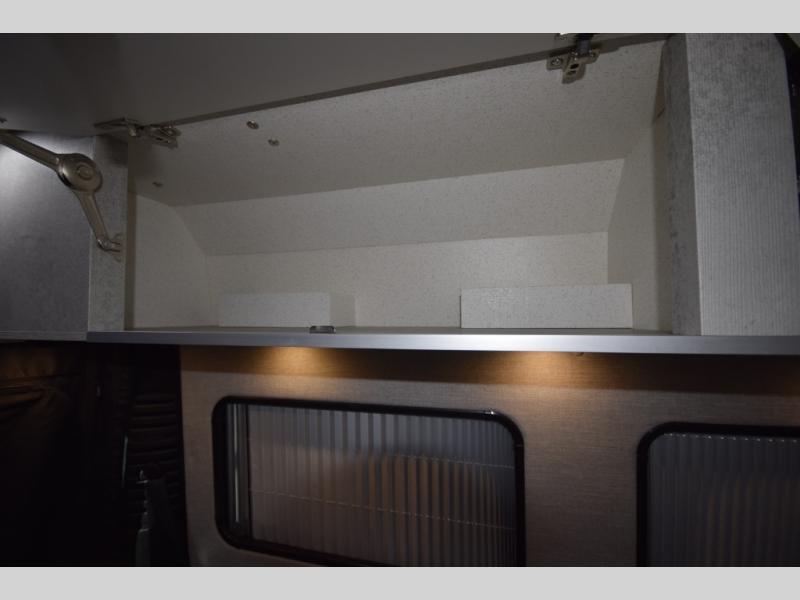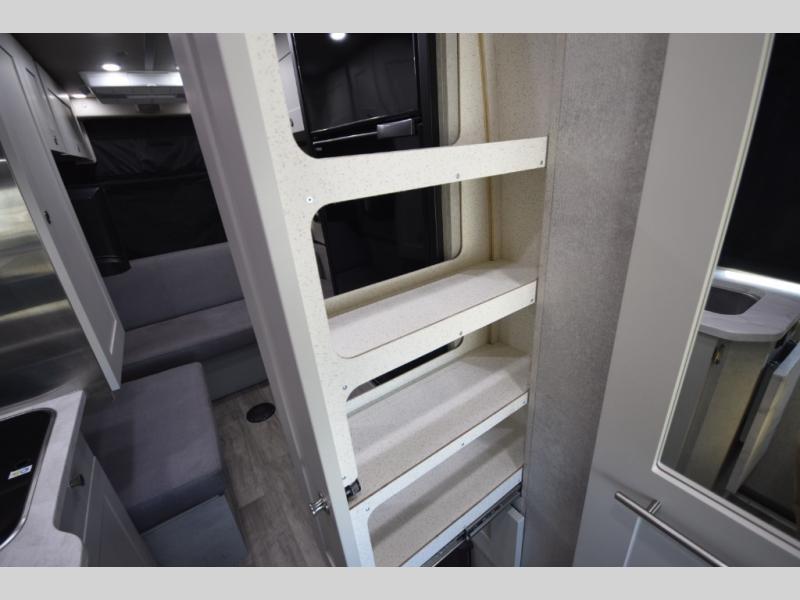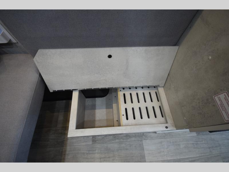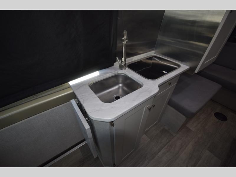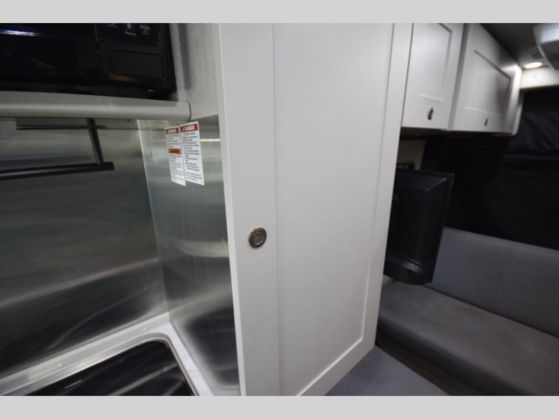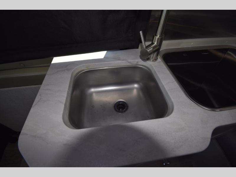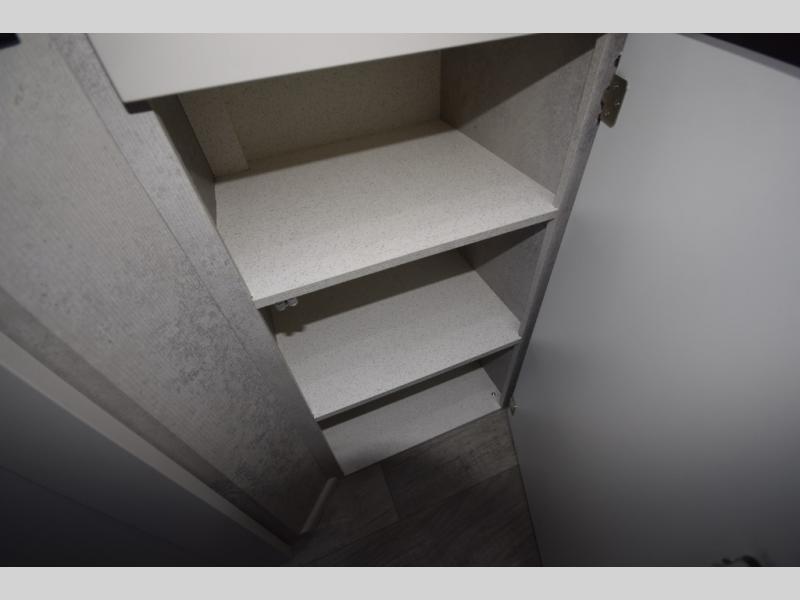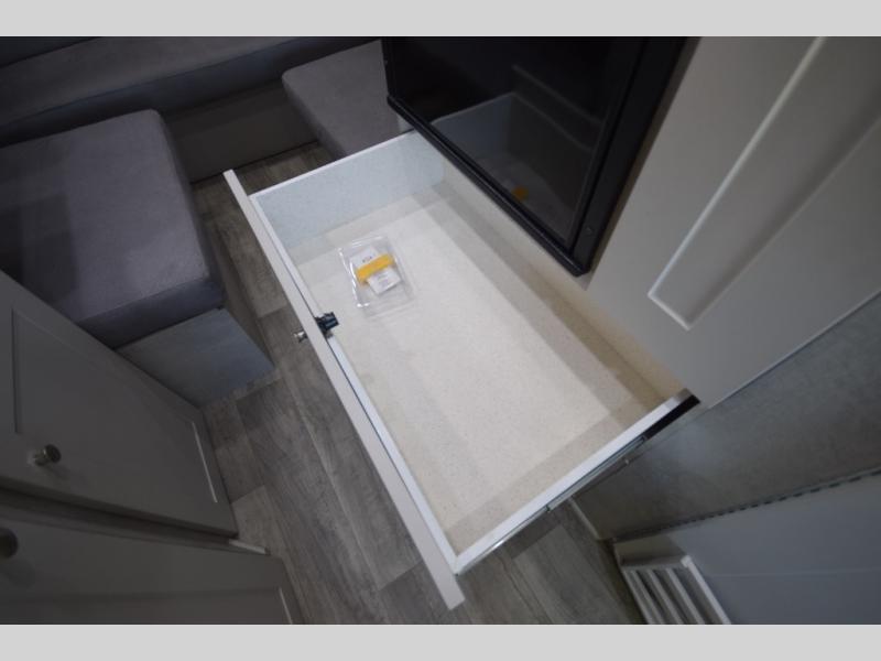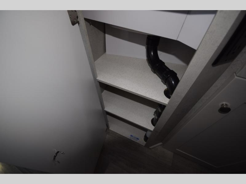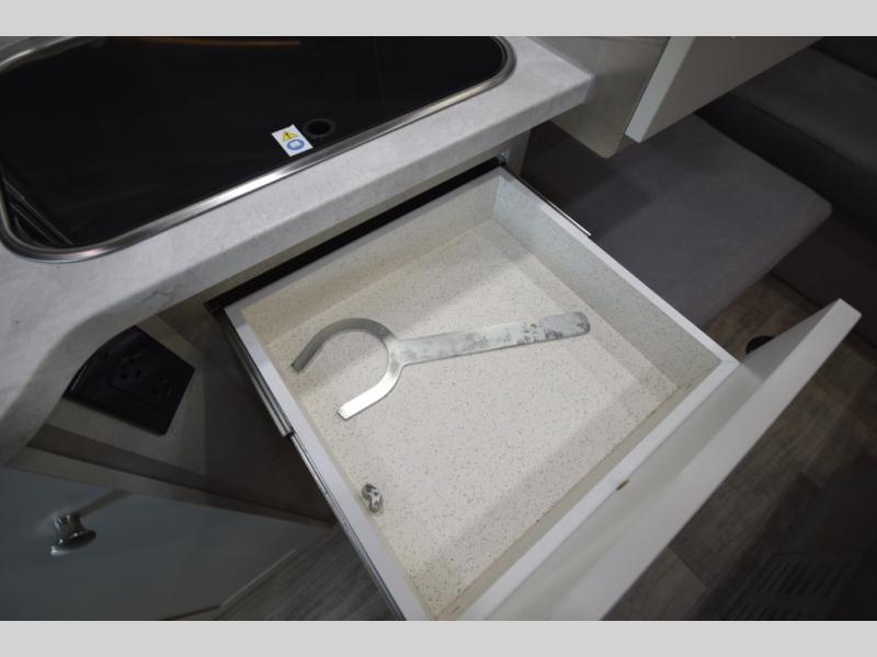 In the galley kitchen, you’ll find everything you need to fuel your travels: a 5.3 cu. ft. refrigerator, propane stove, microwave, and a flip-up countertop extension with a built-in charging station. Smart storage solutions like a slide-out pantry, large pot drawer, and under-sink shelving keep essentials organized and within reach.