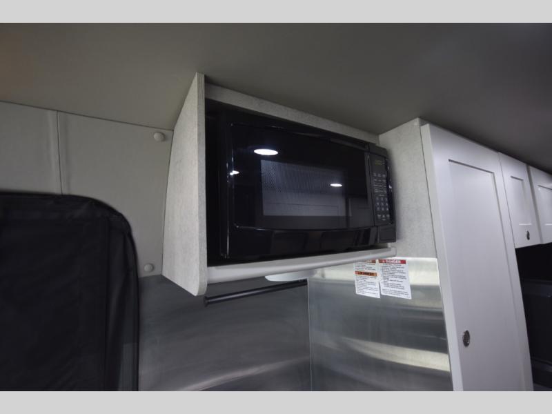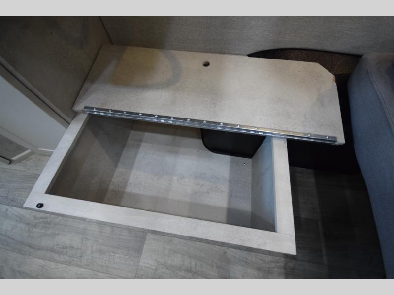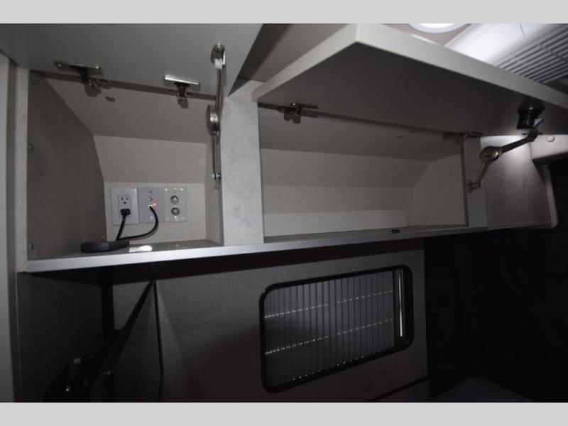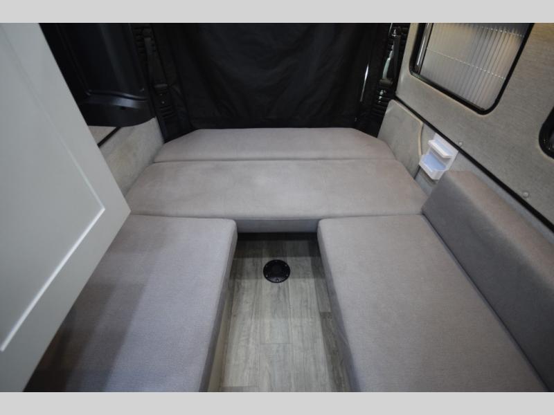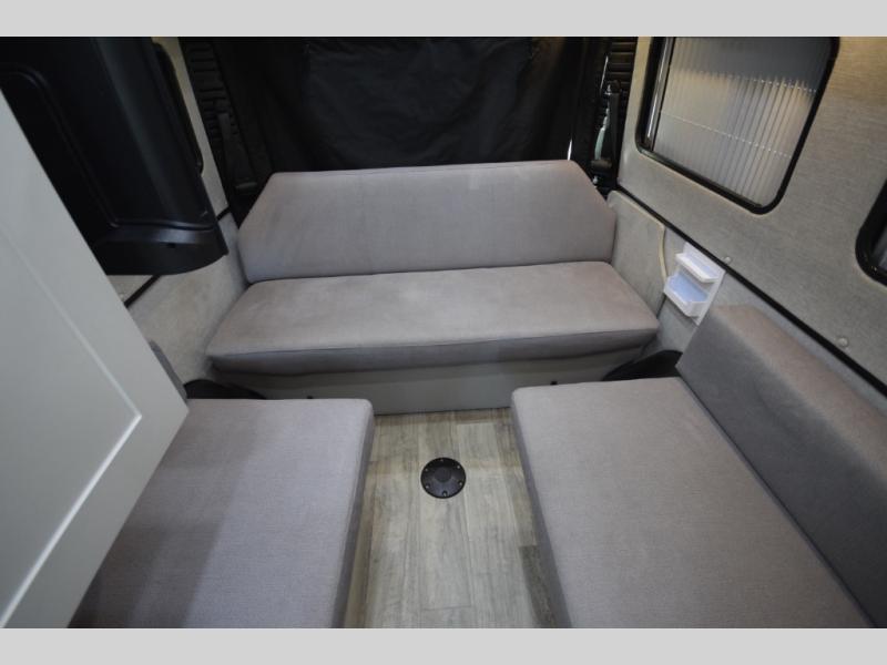 Step inside and enjoy the open-concept center aisle, ideal for storing bikes, paddleboards, or camping gear. The rear sofas easily convert into either two twin beds or one spacious king, giving you sleeping flexibility for any adventure. Need more room? The pop-top sleeping area adds an elevated retreat complete with a large bed, storage tray, and charging ports—perfect for extra guests or cozy nights under the stars.