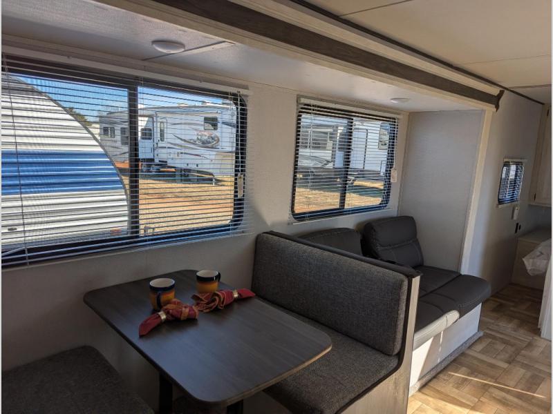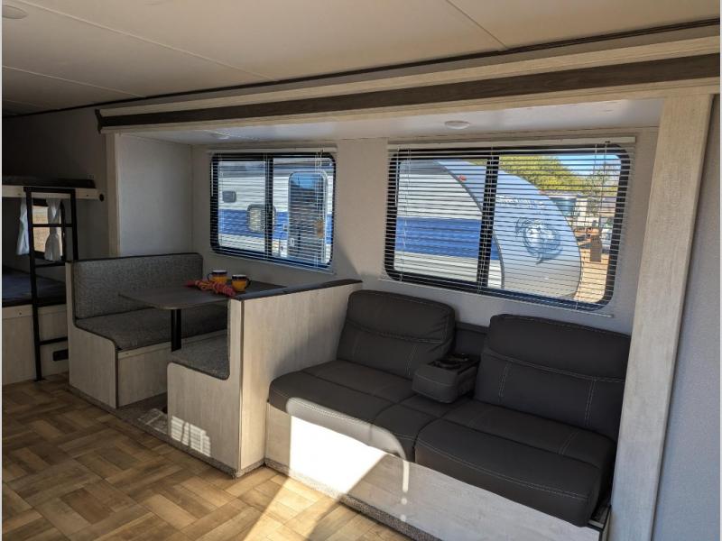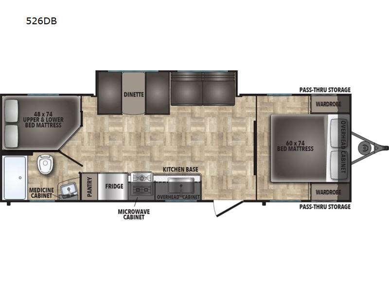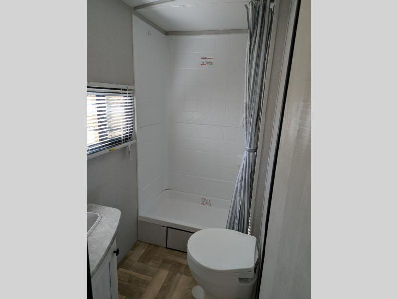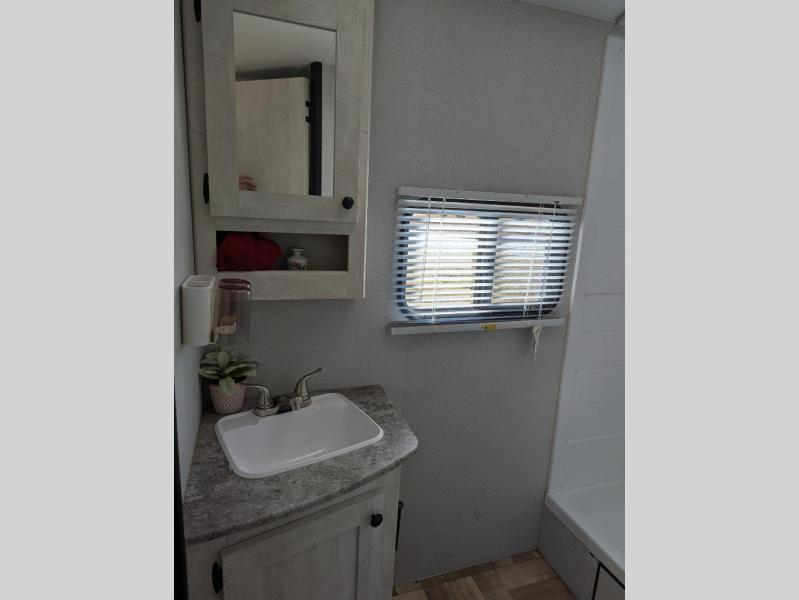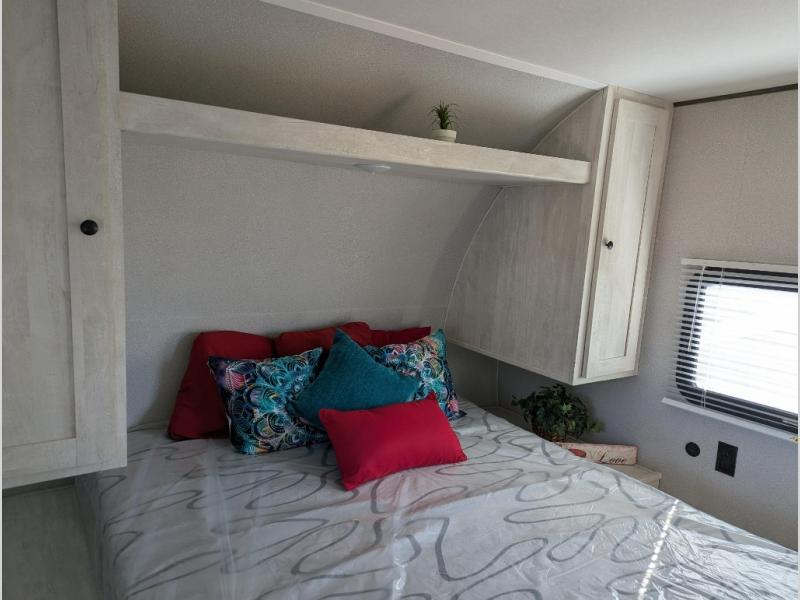 Enjoy family time camping in this Shasta i-5 Edition trailer featuring a single slide in the main living area. This unit is perfect for a growing family or someone that likes to camp with friends. The combined living and kitchen area is spacious when the slide is opened up. Here you will find seating for meals, games, and more with a booth dinette and sofa which can be converted into added sleeping space if needed. There are double bed bunks in the rear roadside corner and a full bath with shower, vanity, and toilet in the opposite rear corner. There is also a medicine cabinet for your personal items like razors and toothbrushes. The kitchen is fully equipped for your camping trips featuring a three burner cooktop with glass cover, an overhead microwave oven, a large sink, plenty of overhead cabinet space as well as storage cabinets and drawers below. You will also love the pantry cupboard for all of your canned goods and snacks. In the front of this unit, a semi-private bedroom with curtains on either side as this has an entry on both sides of the room. The RV queen 60" x 74" bed lifts up to provide added storage for blankets and larger items below, plus you will have hanging wardrobes and nightstands on either side of the bed as well. Outside, enjoy the large pass-through storage for all of your outdoor camping gear and more.