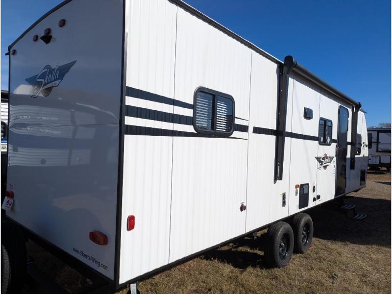 In any Shasta i-5 Edition travel trailer, you will find quality craftsmanship along with an affordable price tag. These units each features four stabilizer jacks to make setting up easier. The Base Camp Package provides each unit with black tank flush, a monitor panel for quick access to the functions of your unit, a 13.5K A/C unit, a 20# LP bottle, and solar and backup camera prep, plus more. You will appreciate the seamless countertops, a residential 10 cu. ft. refrigerator and microwave oven for food storage and cooking, plus pass-through storage and patio awning for your outdoor enjoyment!