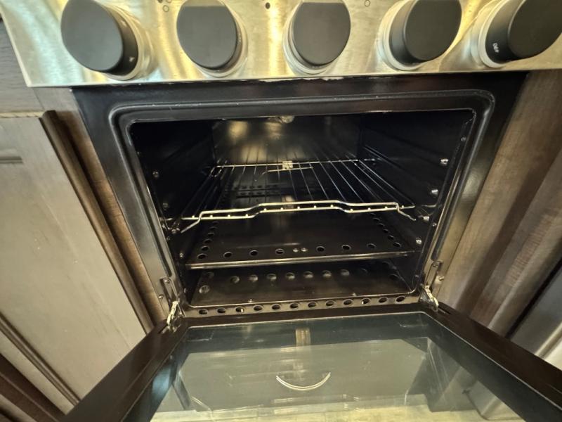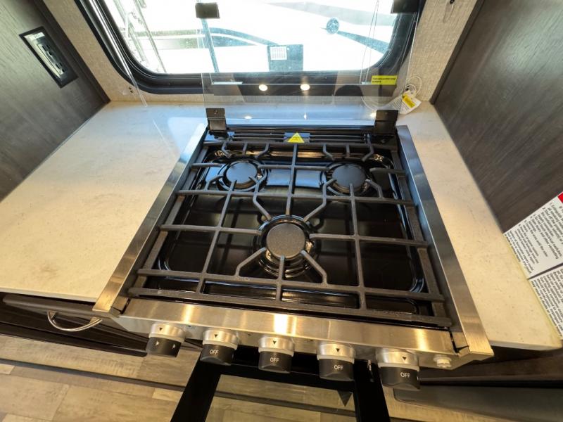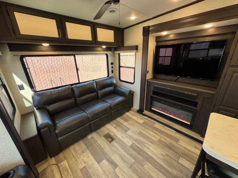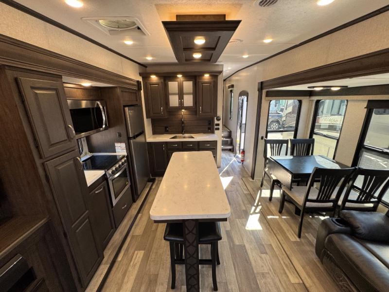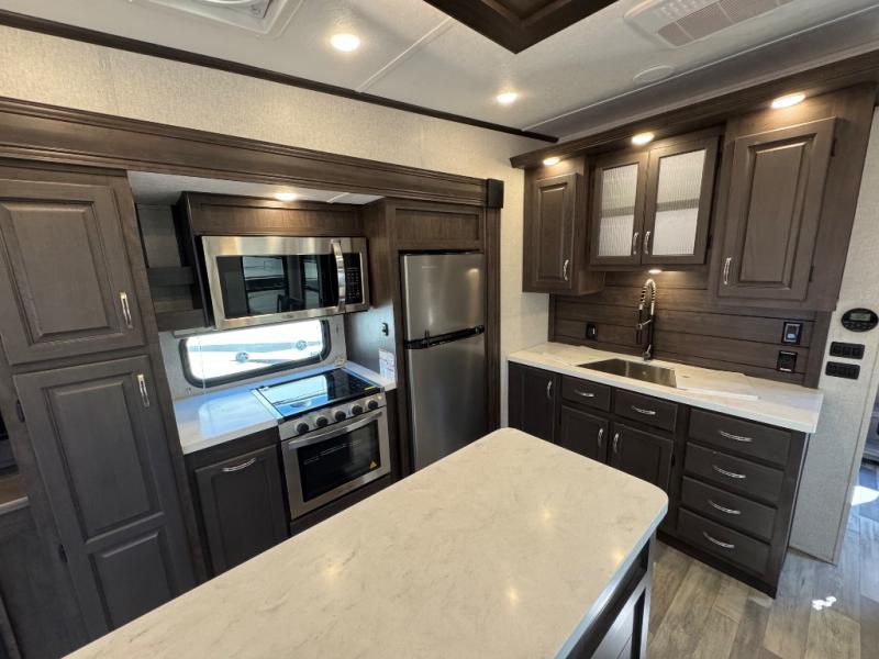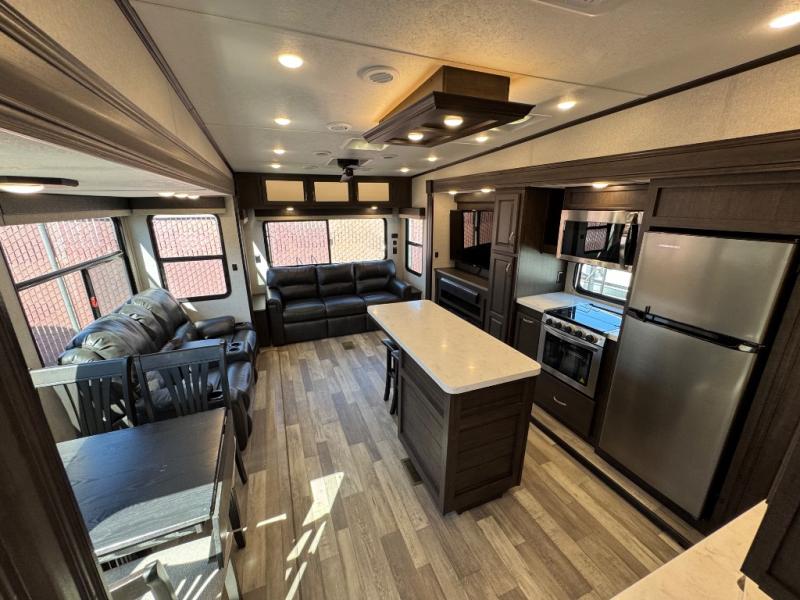 The open-concept living and kitchen area features dual opposing slides for extra room. Relax on the rear tri-fold hide-a-bed sofa, theater seating, or the free-standing dinette with four chairs. The kitchen is a chef’s dream with a center island, bar stools, plenty of counter space, and modern appliances that make meal prep simple.